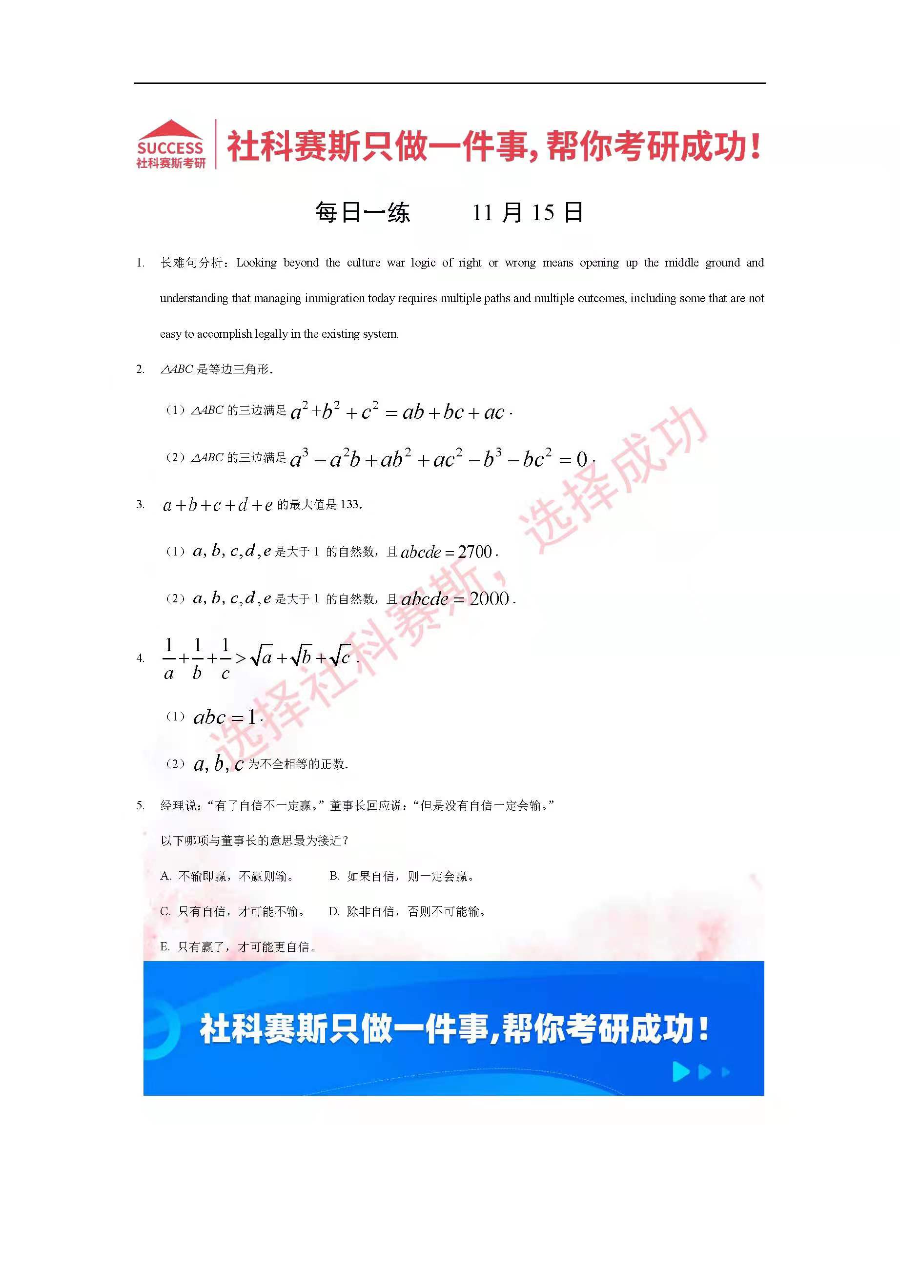 導(dǎo)讀:考研是一場持久戰(zhàn),保持良好的學(xué)習(xí)習(xí)慣,是能確保復(fù)習(xí)高效的關(guān)鍵。今天社科賽斯MBA備考網(wǎng)小編整理了“2022管理類聯(lián)考11月15日每日一練及答案”的內(nèi)容,希望能對廣大考生有所幫助。