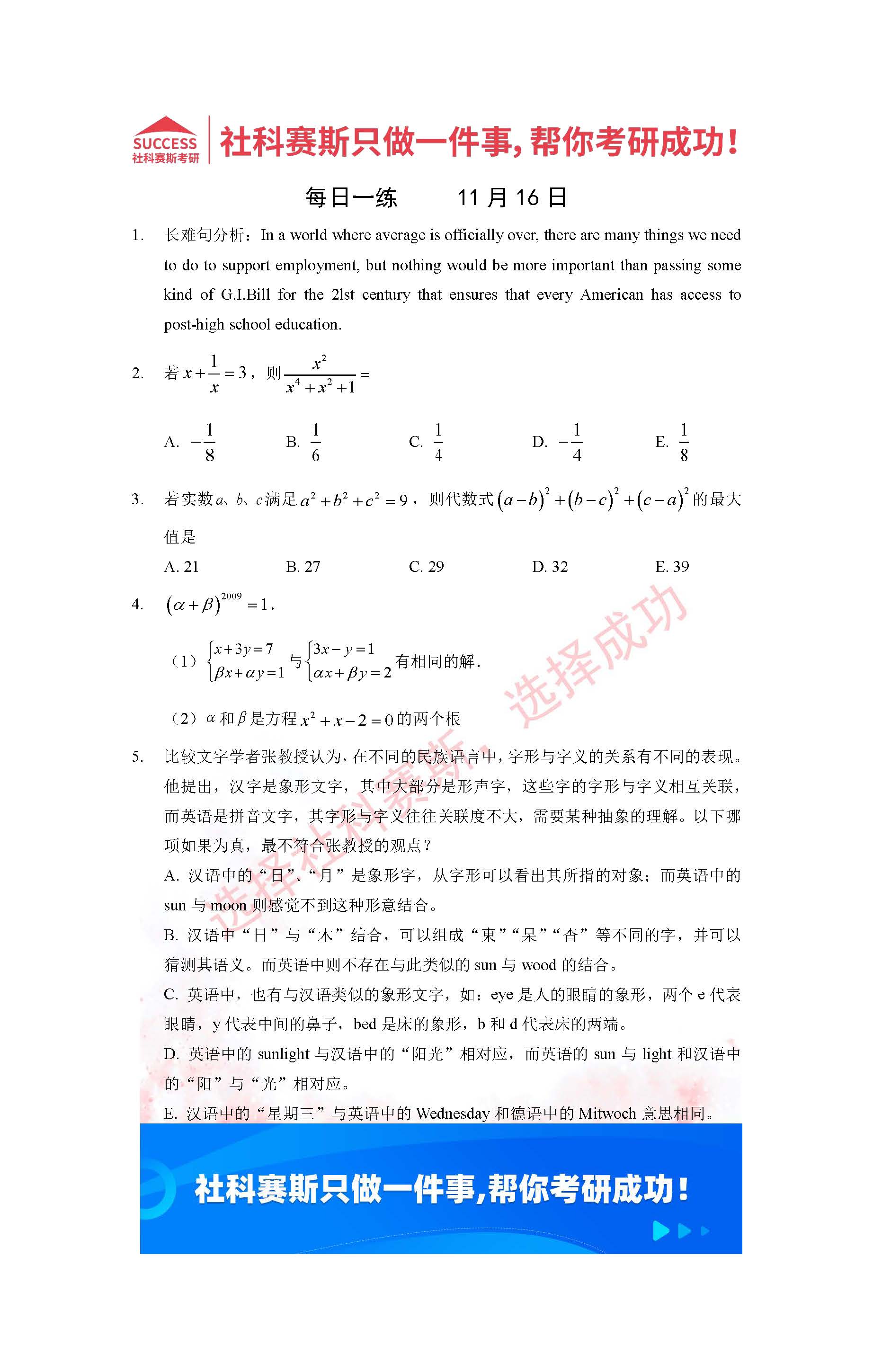 導讀:考研是一場持久戰(zhàn),保持良好的學習習慣,是能確保復(fù)習高效的關(guān)鍵。今天社科賽斯MBA備考網(wǎng)小編整理了“2022管理類聯(lián)考11月16日每日一練及答案”的內(nèi)容,希望能對廣大考生有所幫助。