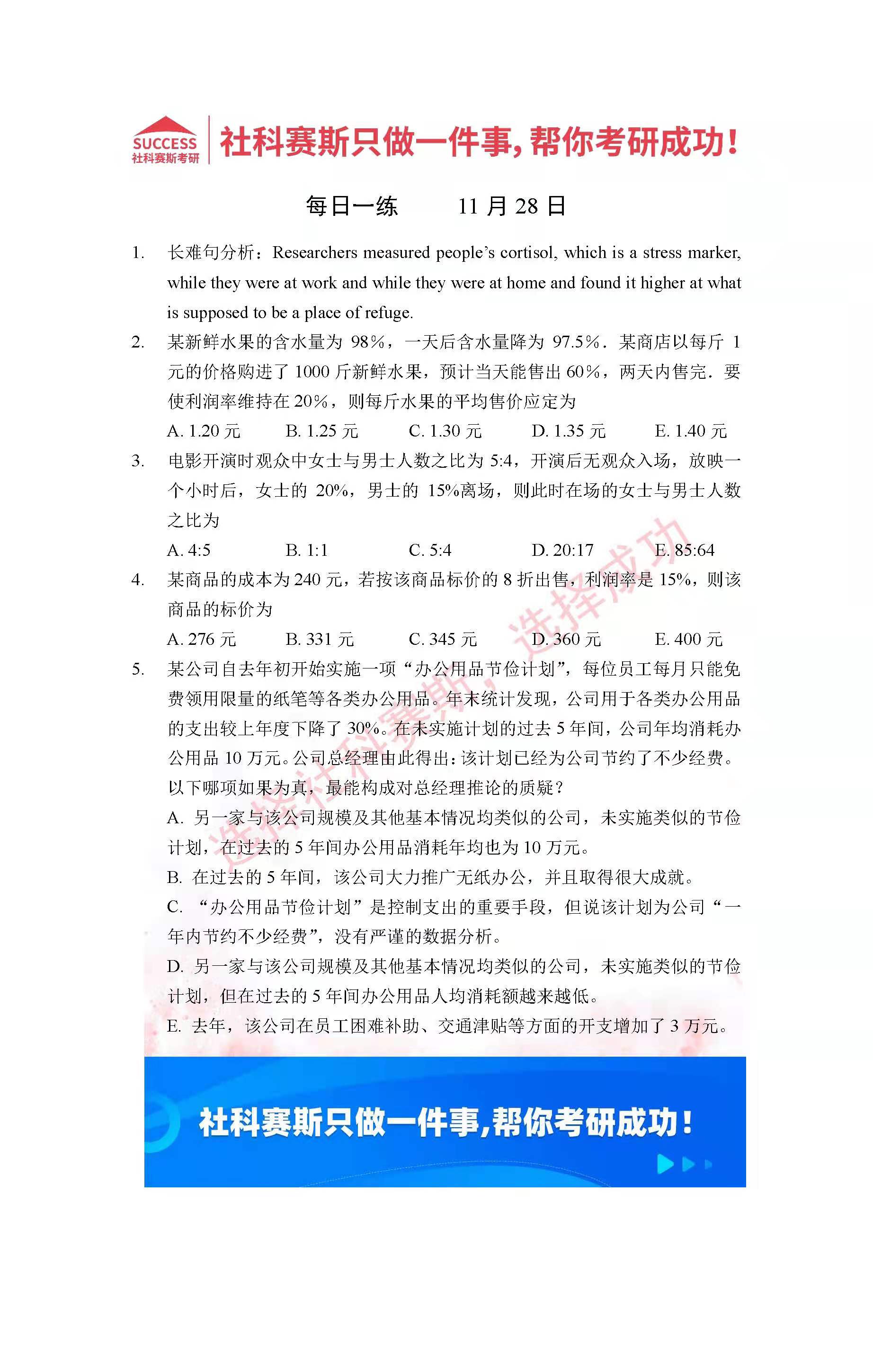 導讀:考研是一場持久戰(zhàn),保持良好的學習習慣,是能確保復習高效的關(guān)鍵。今天社科賽斯MBA備考網(wǎng)小編整理了“2022管理類聯(lián)考11月28日每日一練及答案”的內(nèi)容,希望能對廣大考生有所幫助。