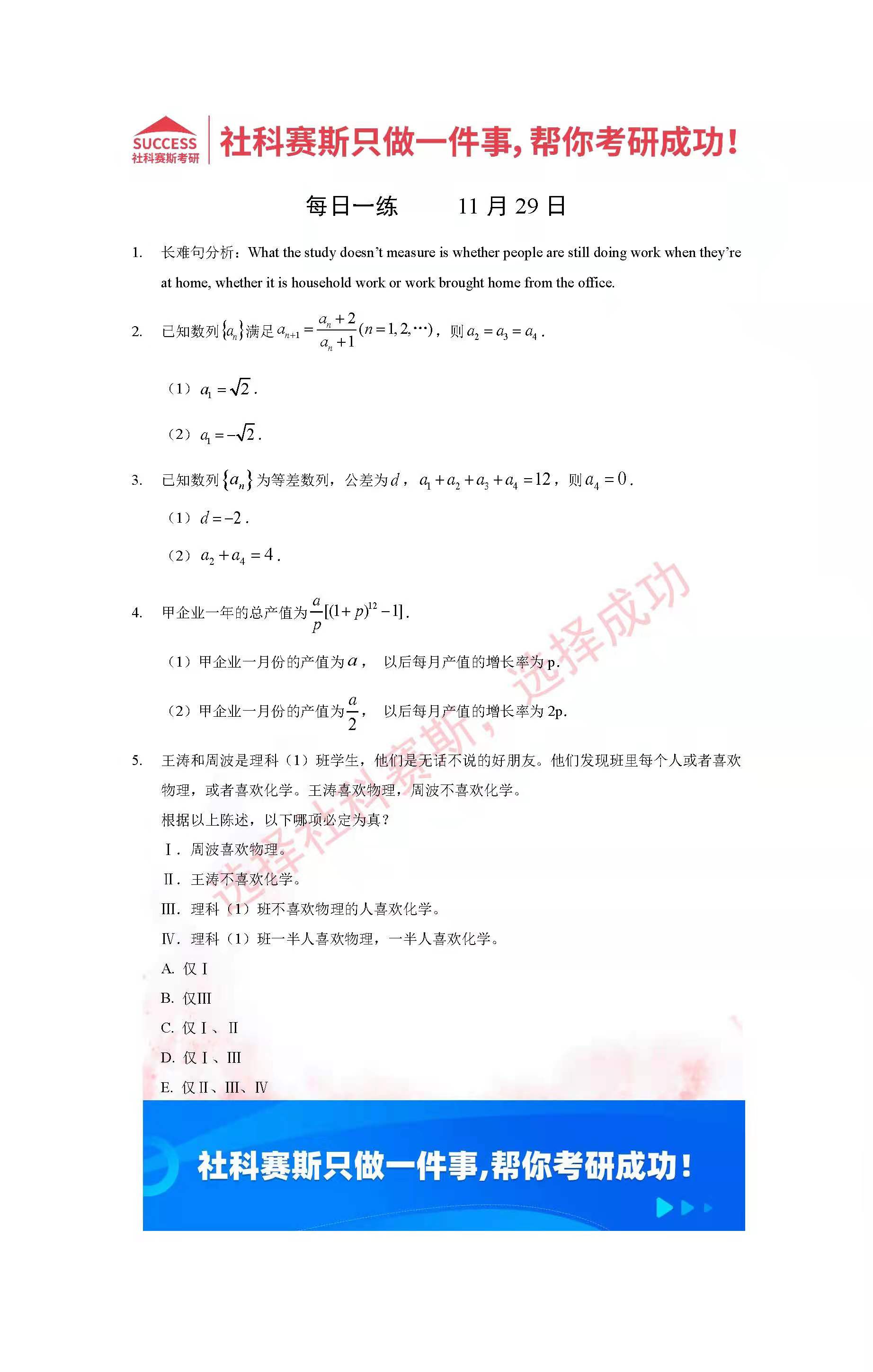 首頁> 管理類聯(lián)考每日一練 > 2022管理類聯(lián)考11月29日每日一練及答案