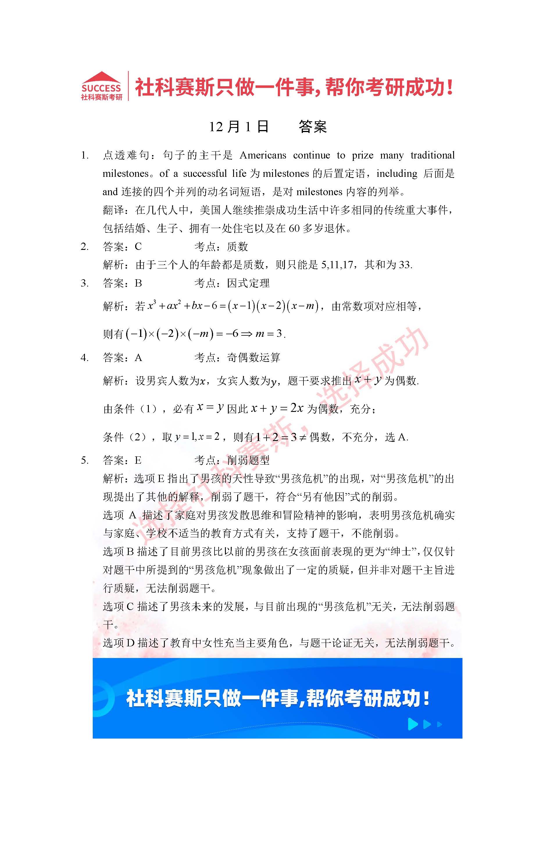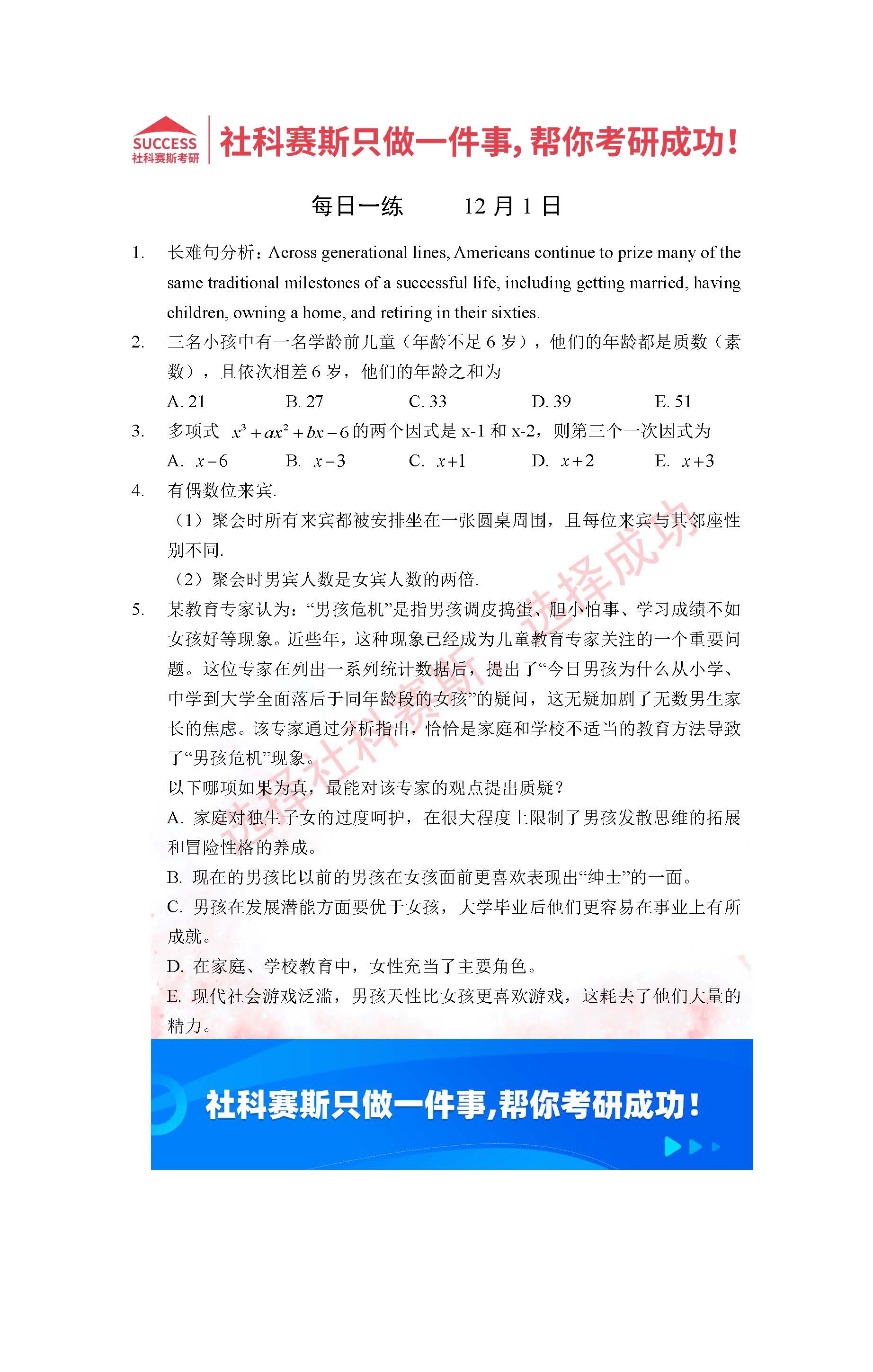 導(dǎo)讀:考研是一場持久戰(zhàn),保持良好的學(xué)習(xí)習(xí)慣,是能確保復(fù)習(xí)高效的關(guān)鍵。今天社科賽斯MBA備考網(wǎng)小編整理了“2022管理類聯(lián)考12月1日每日一練及答案”的內(nèi)容,希望能對廣大考生有所幫助。