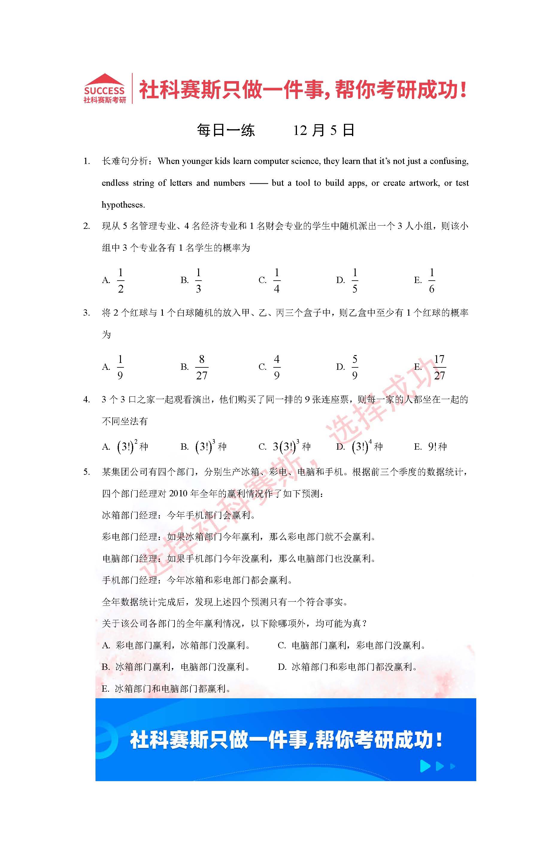 導(dǎo)讀:考研是一場持久戰(zhàn),保持良好的學習習慣,是能確保復(fù)習高效的關(guān)鍵。今天社科賽斯MBA備考網(wǎng)小編整理了“2022管理類聯(lián)考12月5日每日一練及答案”的內(nèi)容,希望能對廣大考生有所幫助。