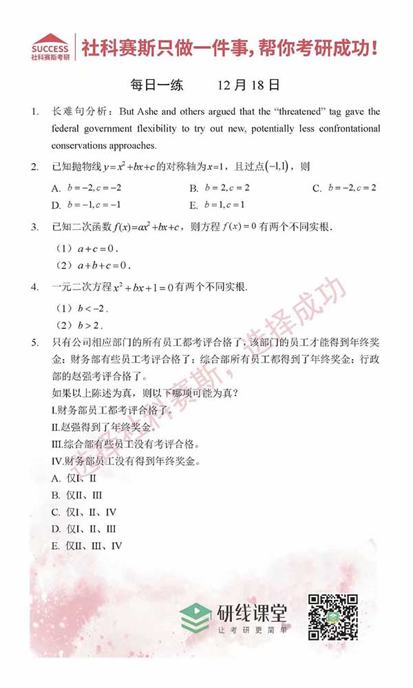 考研是一場艱苦的奮斗,每一個成功的人都是堅(jiān)持到最后的。MBA備考網(wǎng)小編為大家整理了一些管綜題,作為大家的每日一練。希望能夠幫助到大家。