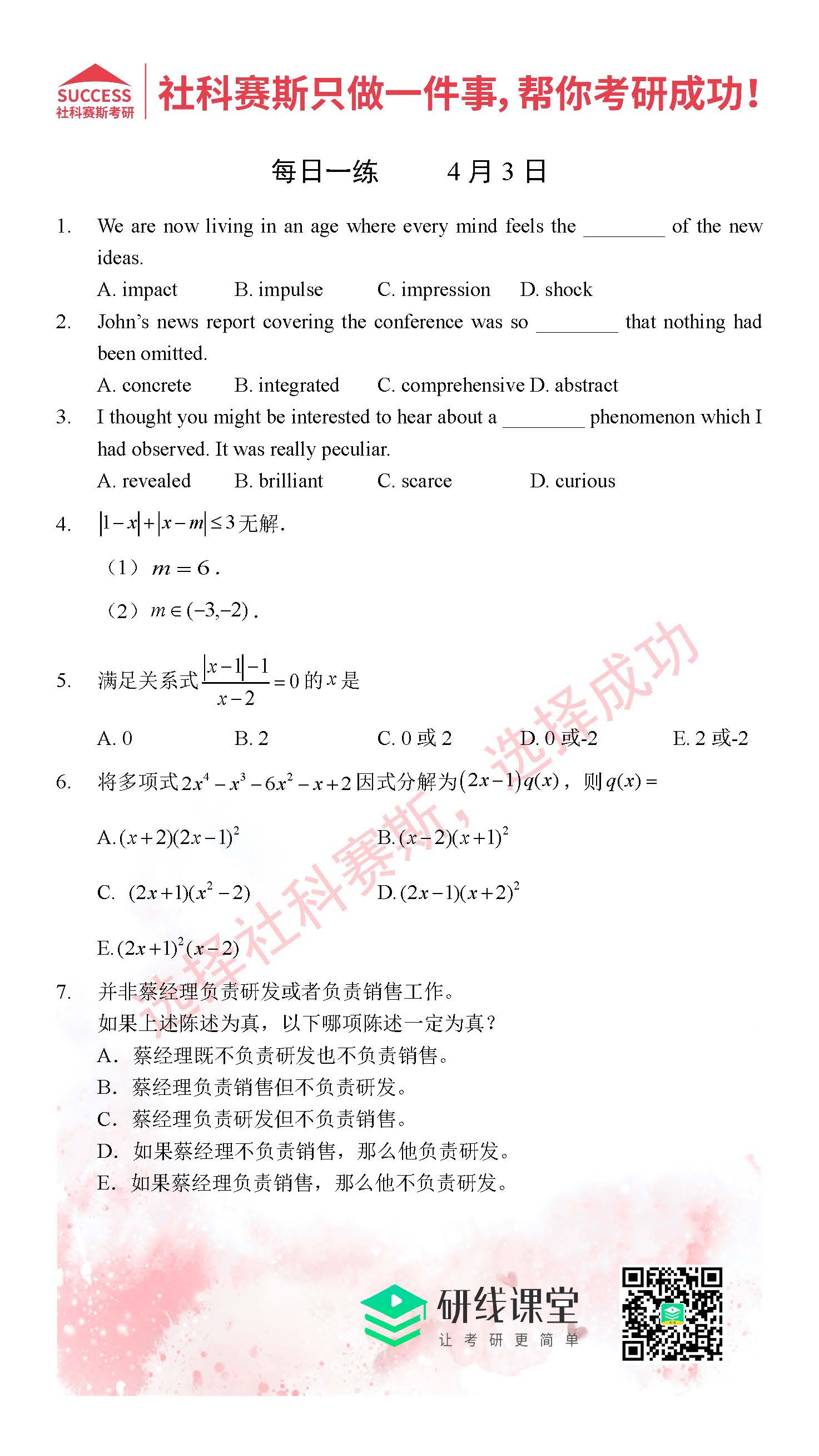 導(dǎo)讀:考研是一場(chǎng)持久戰(zhàn),保持良好的學(xué)習(xí)習(xí)慣,是能確保復(fù)習(xí)高效的關(guān)鍵。MBA備考網(wǎng)小編整理了管綜的每日一練,希望能對(duì)廣大考生有所幫助。
