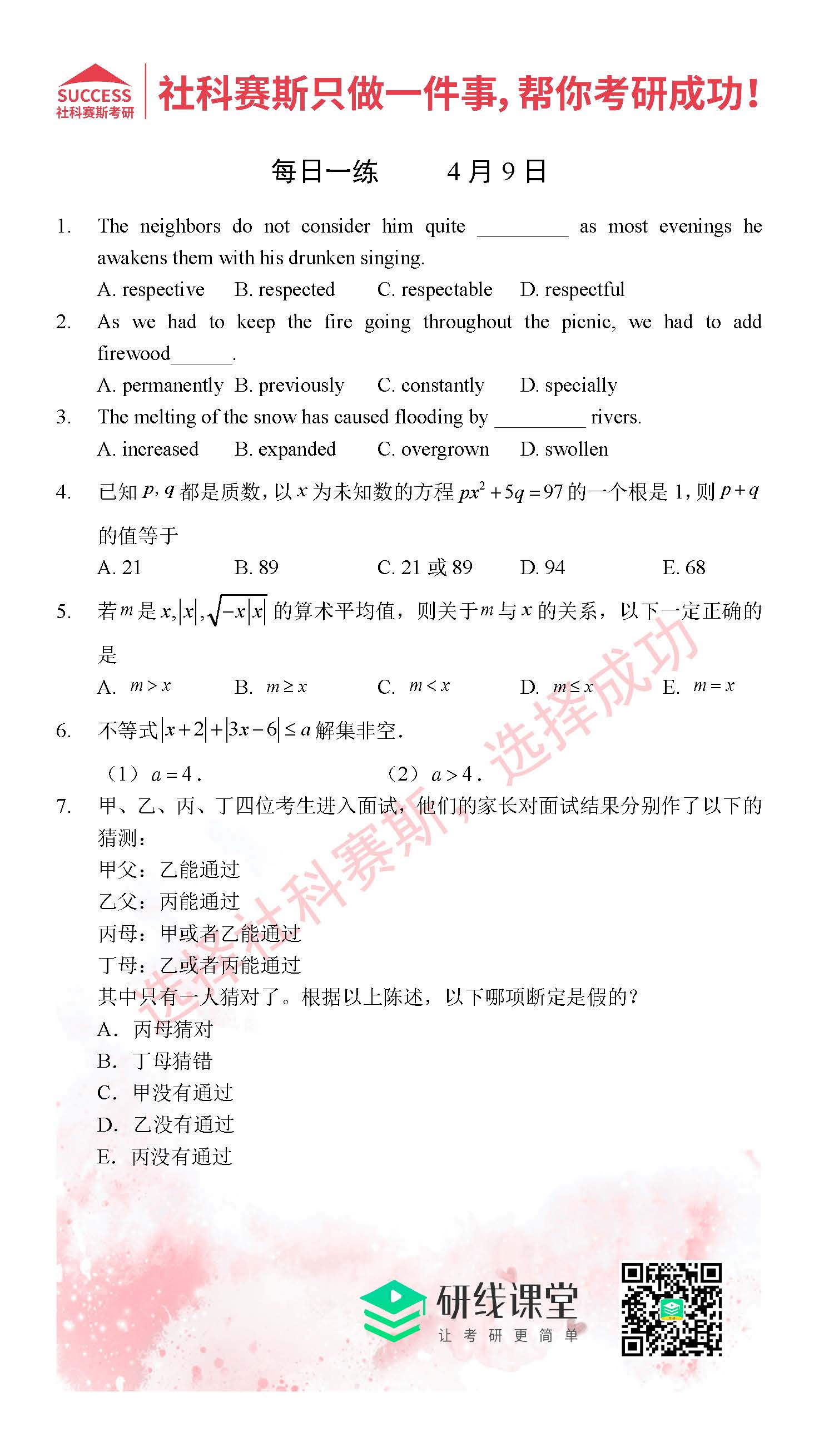 導(dǎo)讀:考研是一場(chǎng)持久戰(zhàn),保持良好的學(xué)習(xí)習(xí)慣,是能確保復(fù)習(xí)高效的關(guān)鍵。MBA備考網(wǎng)小編整理了管綜的每日一練,希望能對(duì)廣大考生有所幫助。