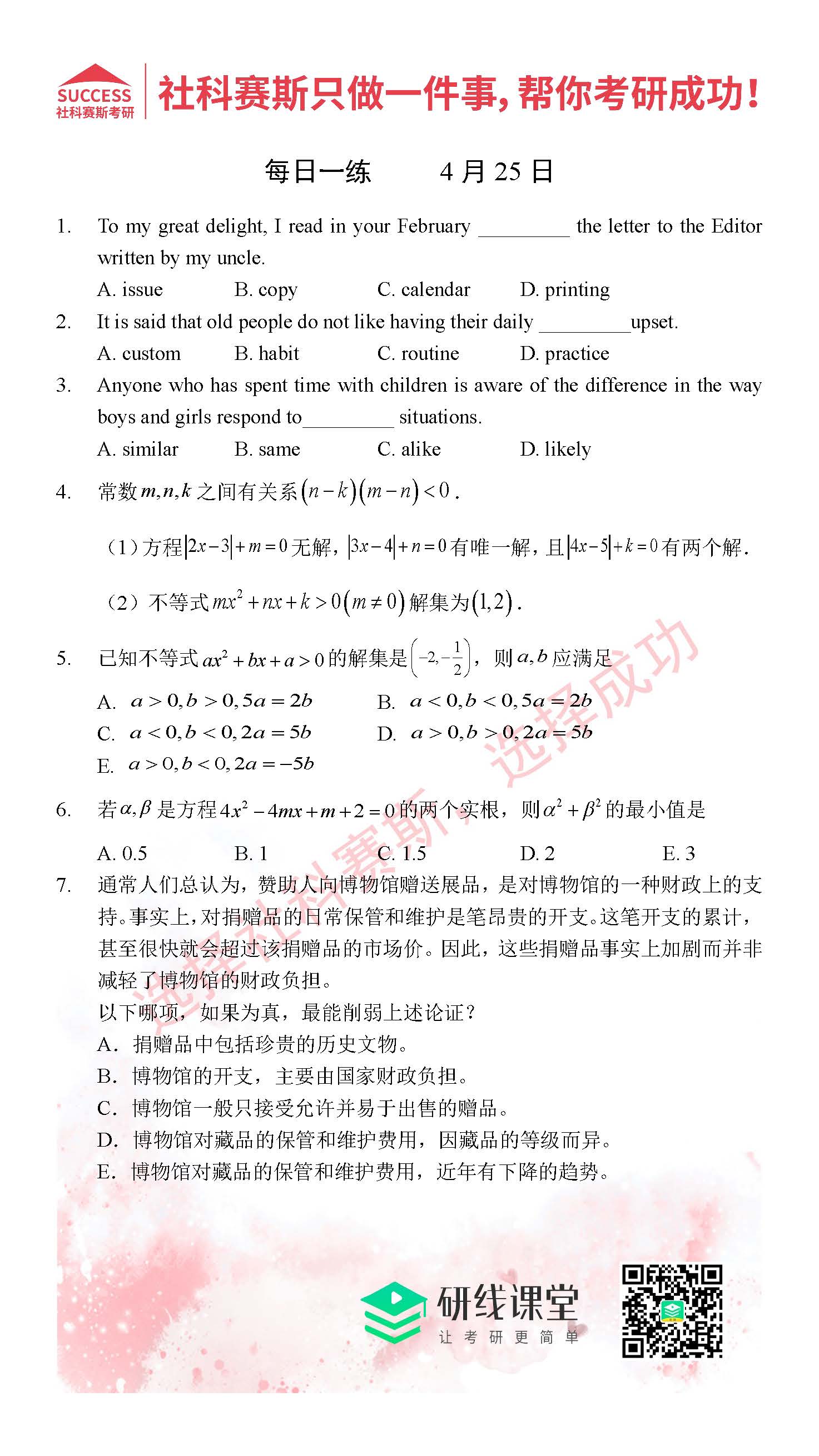 考研是一場持久戰(zhàn),保持良好的學習習慣,是能確保復習高效的關鍵。MBA備考網(wǎng)小編整理了管綜的每日一練,希望能對廣大考生有所幫助。
