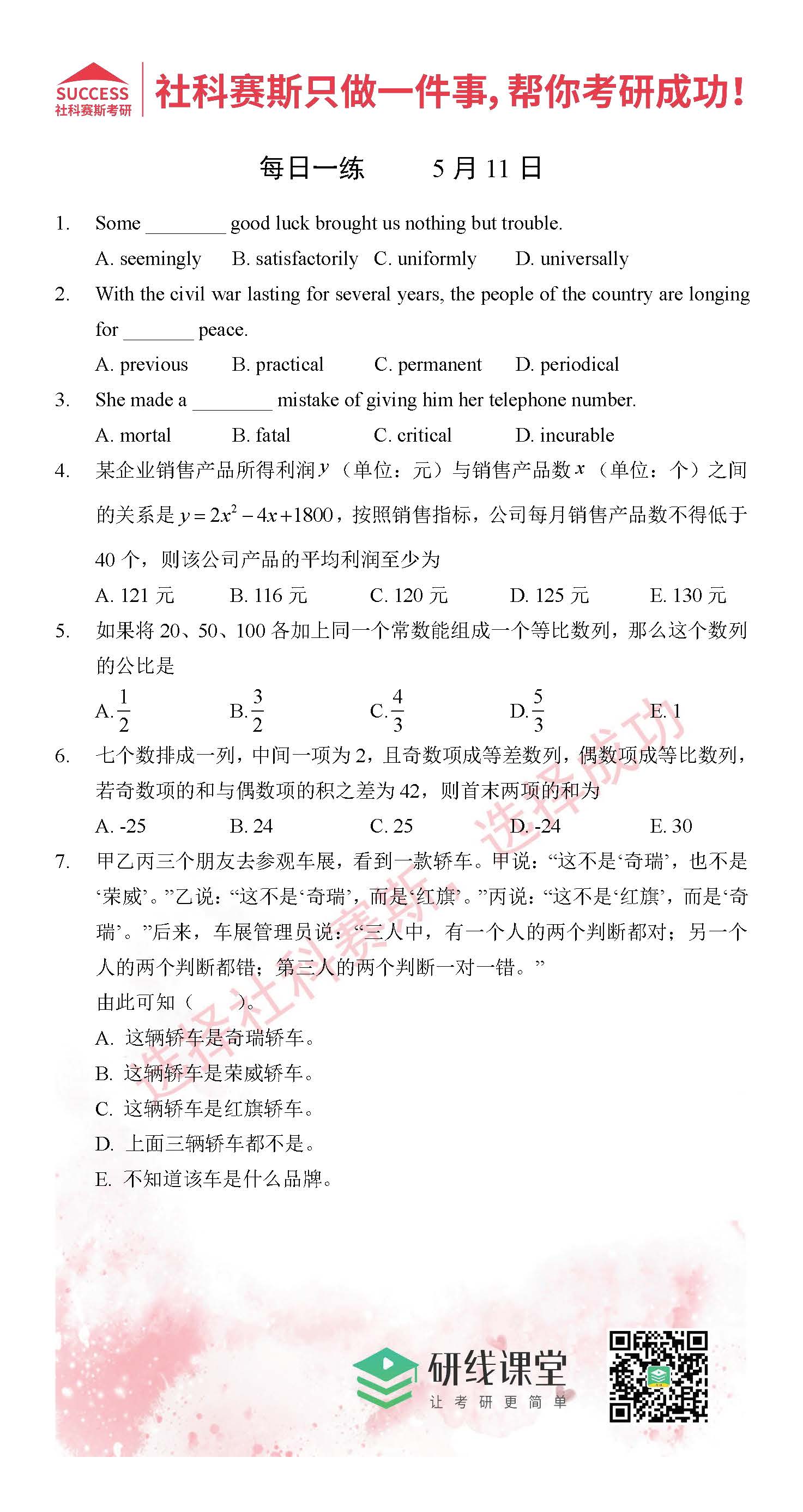 導(dǎo)讀:考研是一場(chǎng)持久戰(zhàn),保持良好的學(xué)習(xí)習(xí)慣,是能確保復(fù)習(xí)高效的關(guān)鍵。MBA備考網(wǎng)小編整理了管綜的每日一練,希望能對(duì)廣大考生有所幫助。