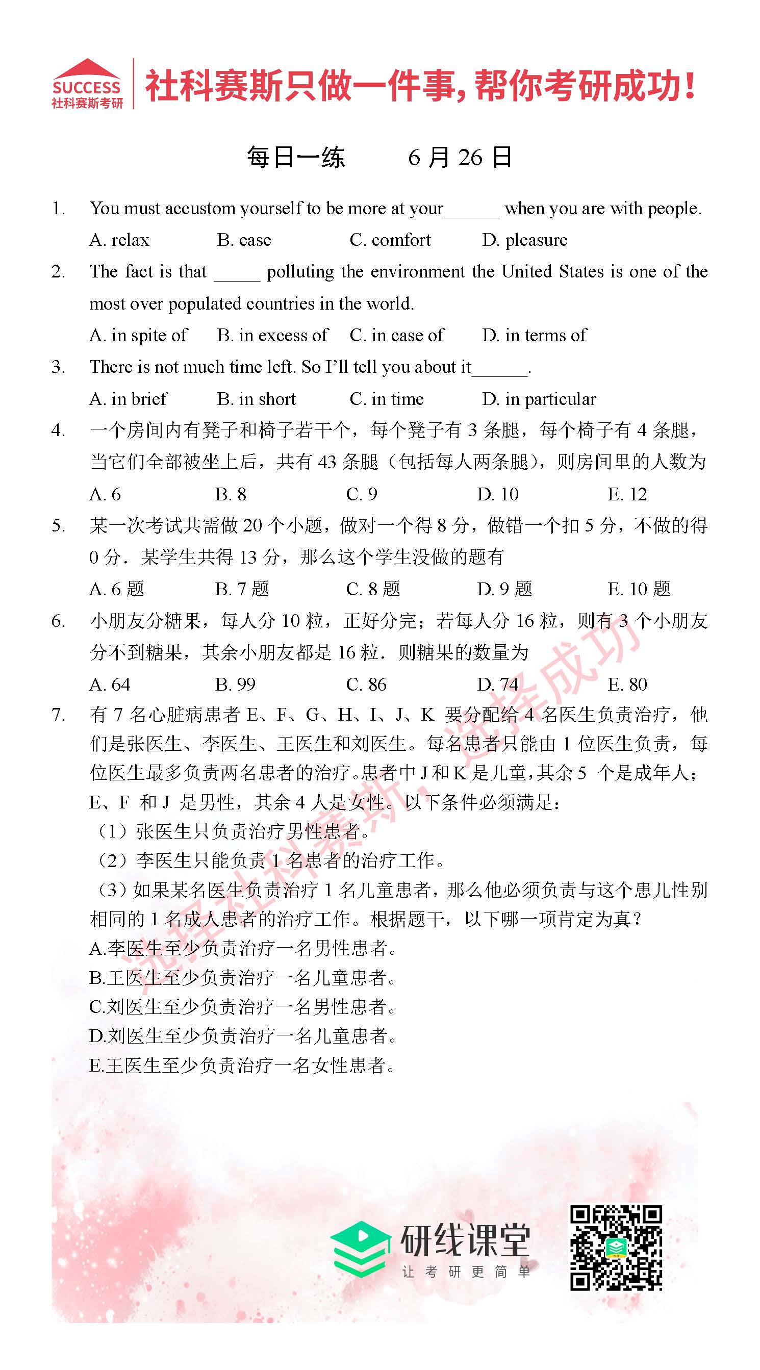 以上就是MBA備考網(wǎng)小編為大家提供的今日的每日一練“2021管理類聯(lián)考6月26日每日一練及答案”的全部內(nèi)容,希望各位考生堅(jiān)持利用起來,更多每日一練內(nèi)容請持續(xù)關(guān)注MBA備考網(wǎng)管理類聯(lián)考每日一練。