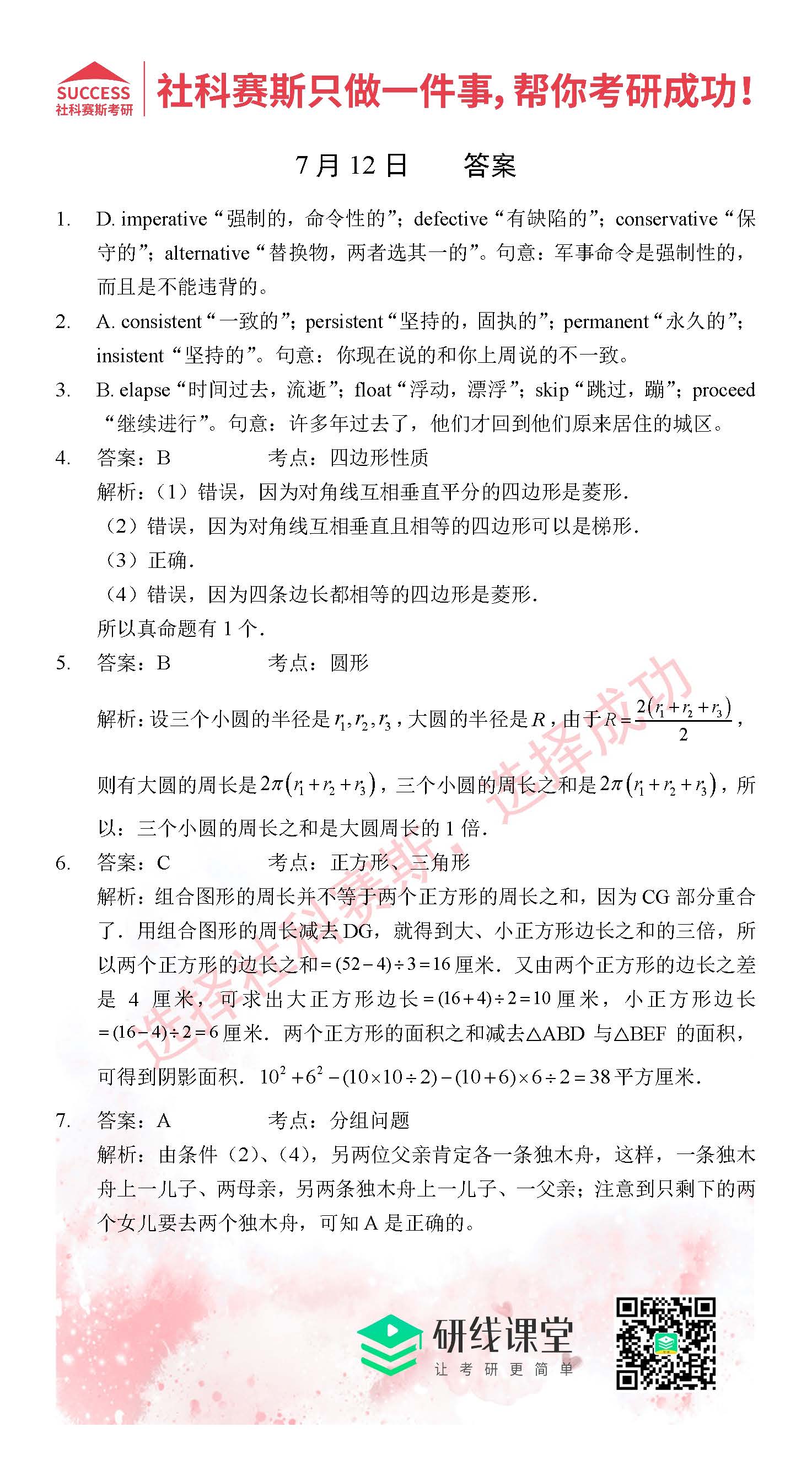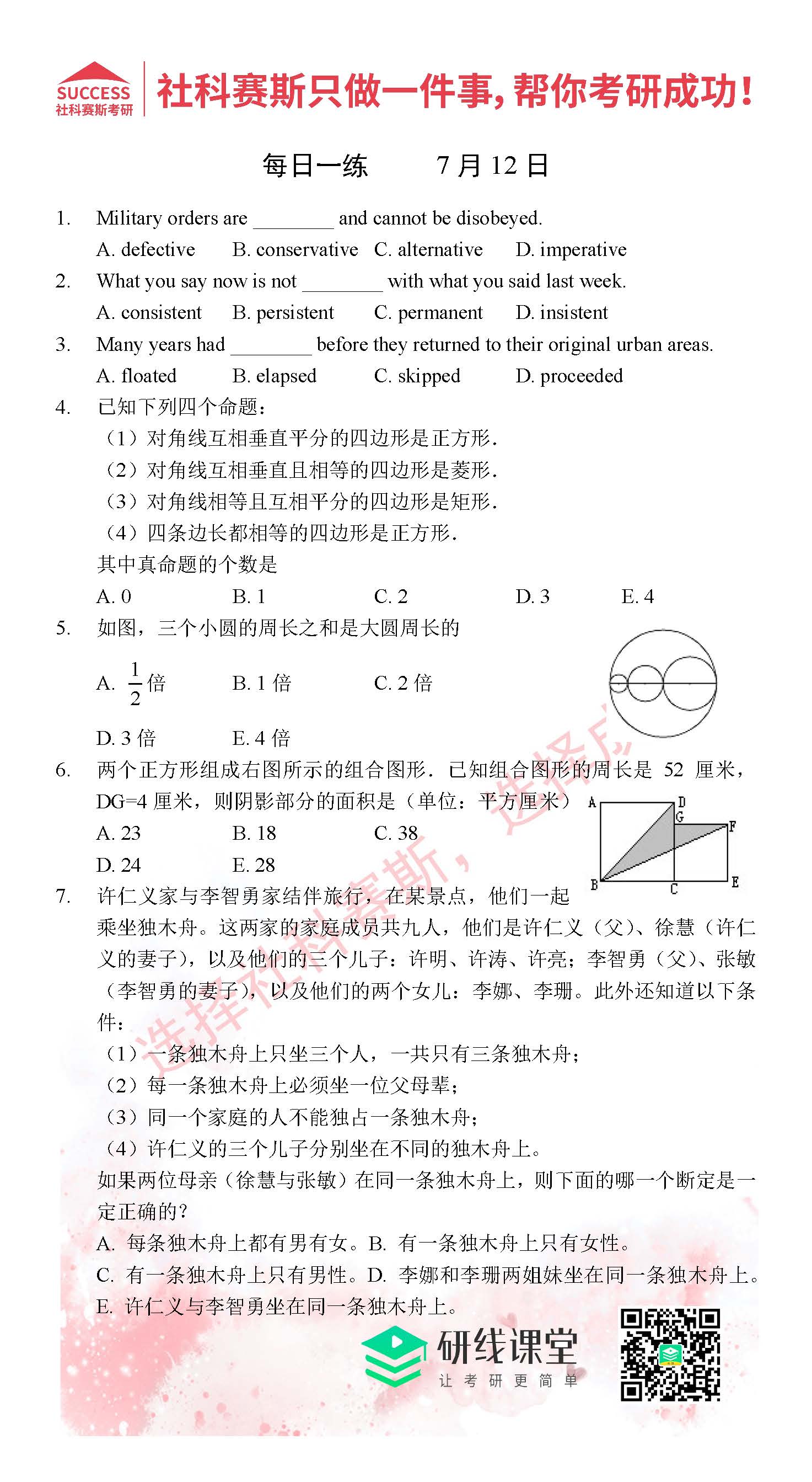 以上就是MBA備考網(wǎng)小編為大家提供的今日的每日一練“2021管理類聯(lián)考7月12日每日一練及答案”的全部?jī)?nèi)容,希望各位考生堅(jiān)持利用起來,更多每日一練內(nèi)容請(qǐng)持續(xù)關(guān)注MBA備考網(wǎng)管理類聯(lián)考每日一練。