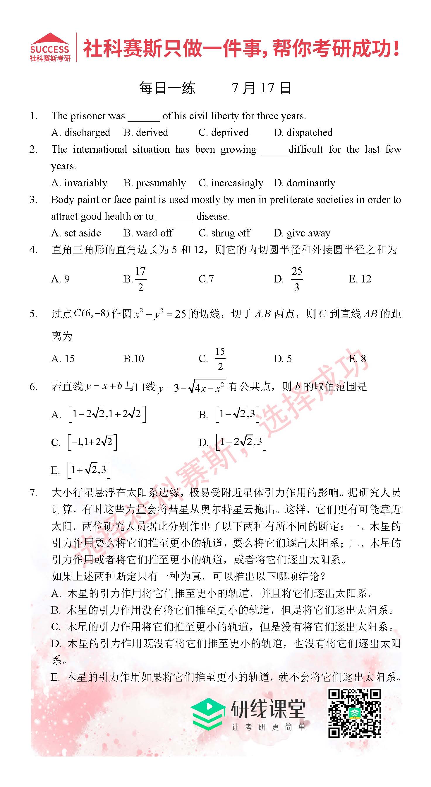以上就是MBA備考網(wǎng)小編為大家提供的今日的每日一練“2021管理類聯(lián)考7月17日每日一練及答案”的全部?jī)?nèi)容,希望各位考生堅(jiān)持利用起來,更多每日一練內(nèi)容請(qǐng)持續(xù)關(guān)注MBA備考網(wǎng)管理類聯(lián)考每日一練。