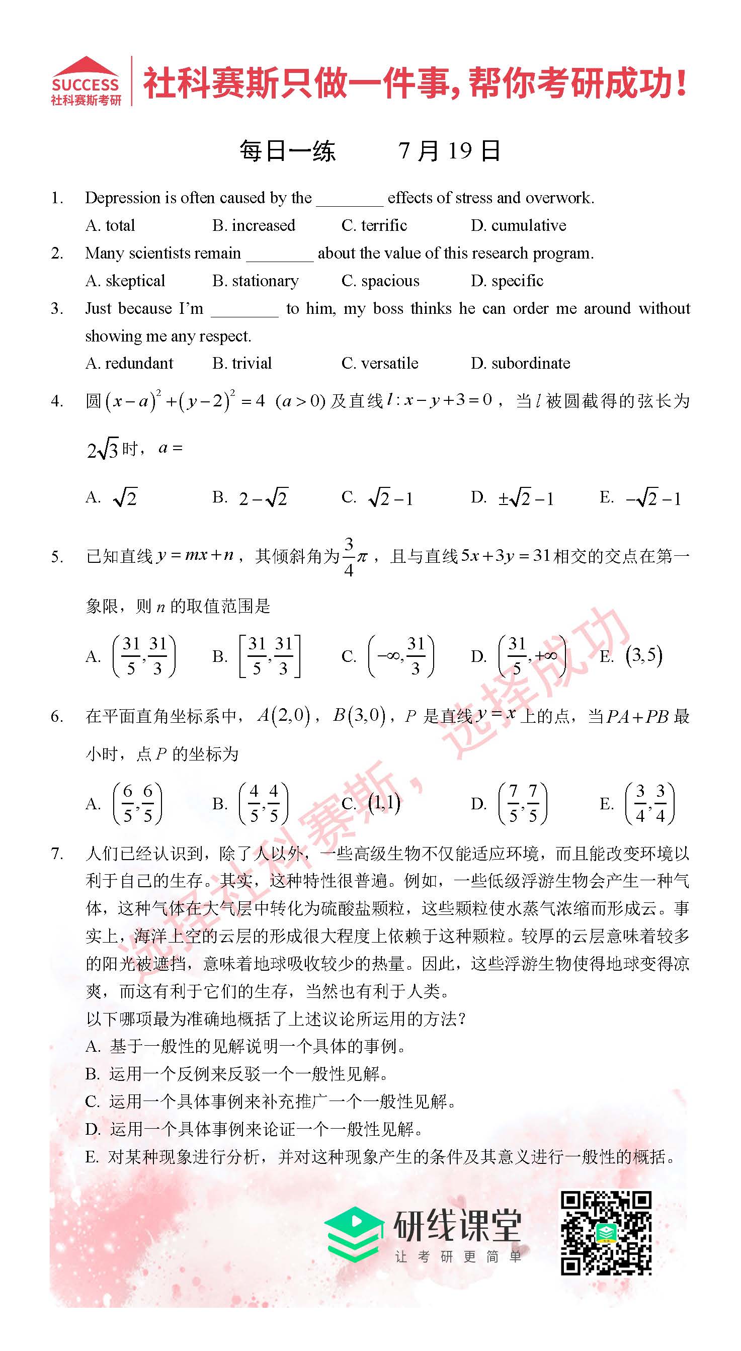 以上就是MBA備考網(wǎng)小編為大家提供的今日的每日一練“2021管理類聯(lián)考7月19日每日一練及答案”的全部內(nèi)容,希望各位考生堅持利用起來,更多每日一練內(nèi)容請持續(xù)關(guān)注MBA備考網(wǎng)管理類聯(lián)考每日一練。