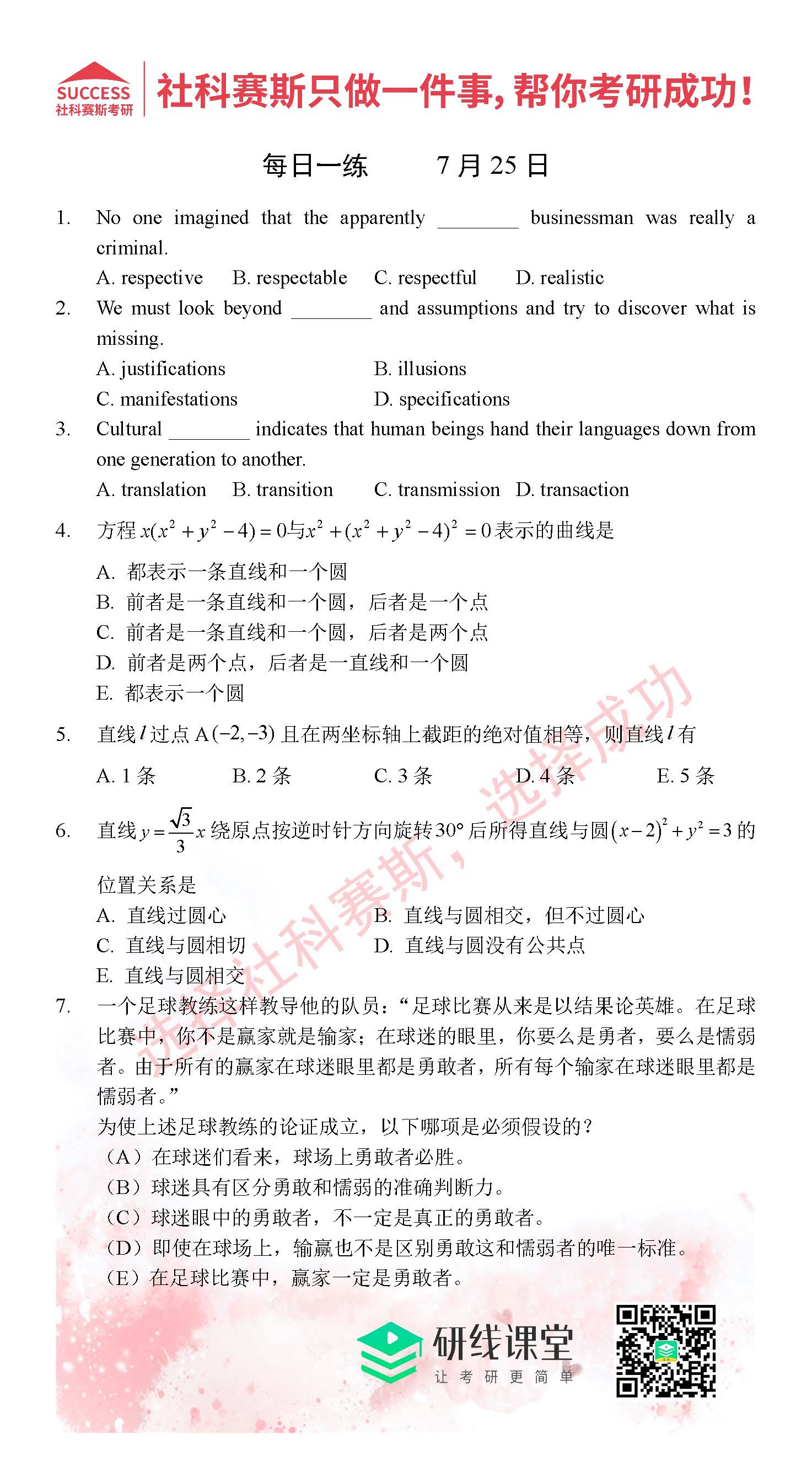 以上就是MBA備考網(wǎng)小編為大家提供的今日每日一練“2021管理類聯(lián)考7月25日每日一練及答案”的全部內(nèi)容,希望各位考生堅持利用起來,更多每日一練內(nèi)容請持續(xù)關(guān)注MBA備考網(wǎng)管理類聯(lián)考每日一練。