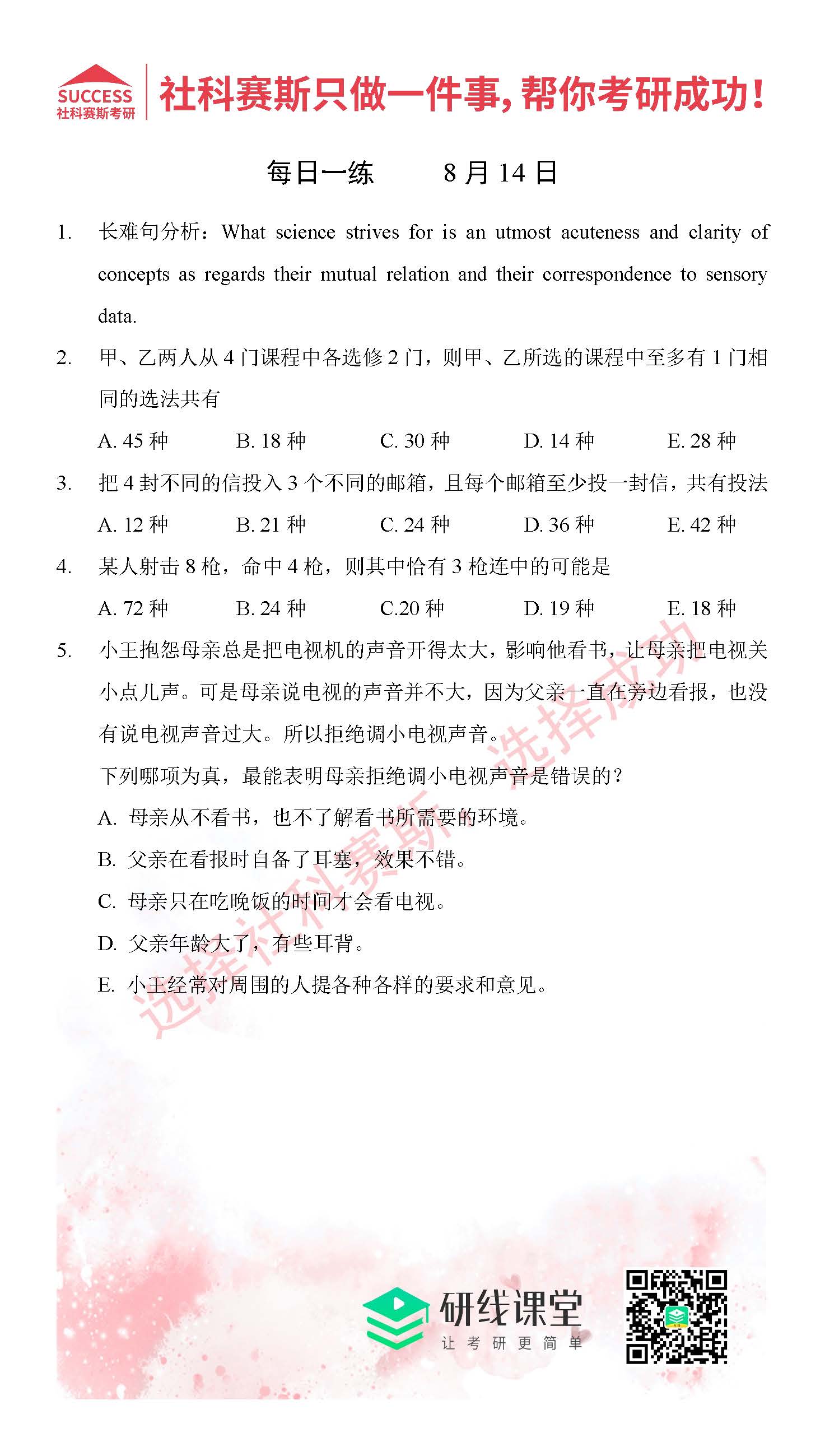 以上就是MBA備考網(wǎng)小編為大家提供的今日每日一練“2021管理類聯(lián)考8月14日每日一練及答案”的全部內(nèi)容,希望各位考生堅持利用起來,更多每日一練內(nèi)容請持續(xù)關(guān)注MBA備考網(wǎng)管理類聯(lián)考每日一練。