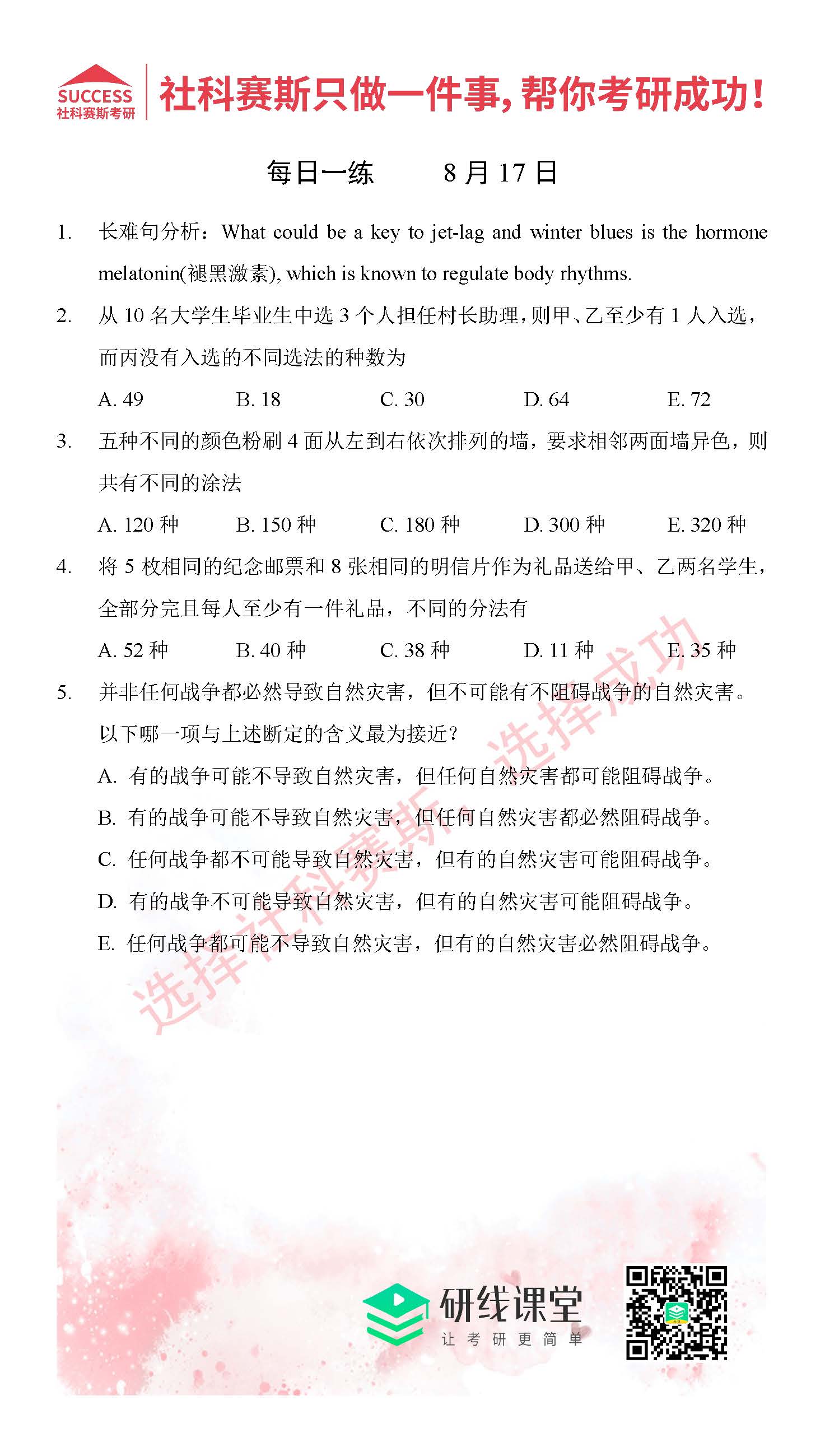 以上就是MBA備考網(wǎng)小編為大家提供的今日每日一練“2021管理類(lèi)聯(lián)考8月17日每日一練及答案”的全部?jī)?nèi)容,希望各位考生堅(jiān)持利用起來(lái),更多每日一練內(nèi)容請(qǐng)持續(xù)關(guān)注MBA備考網(wǎng)。