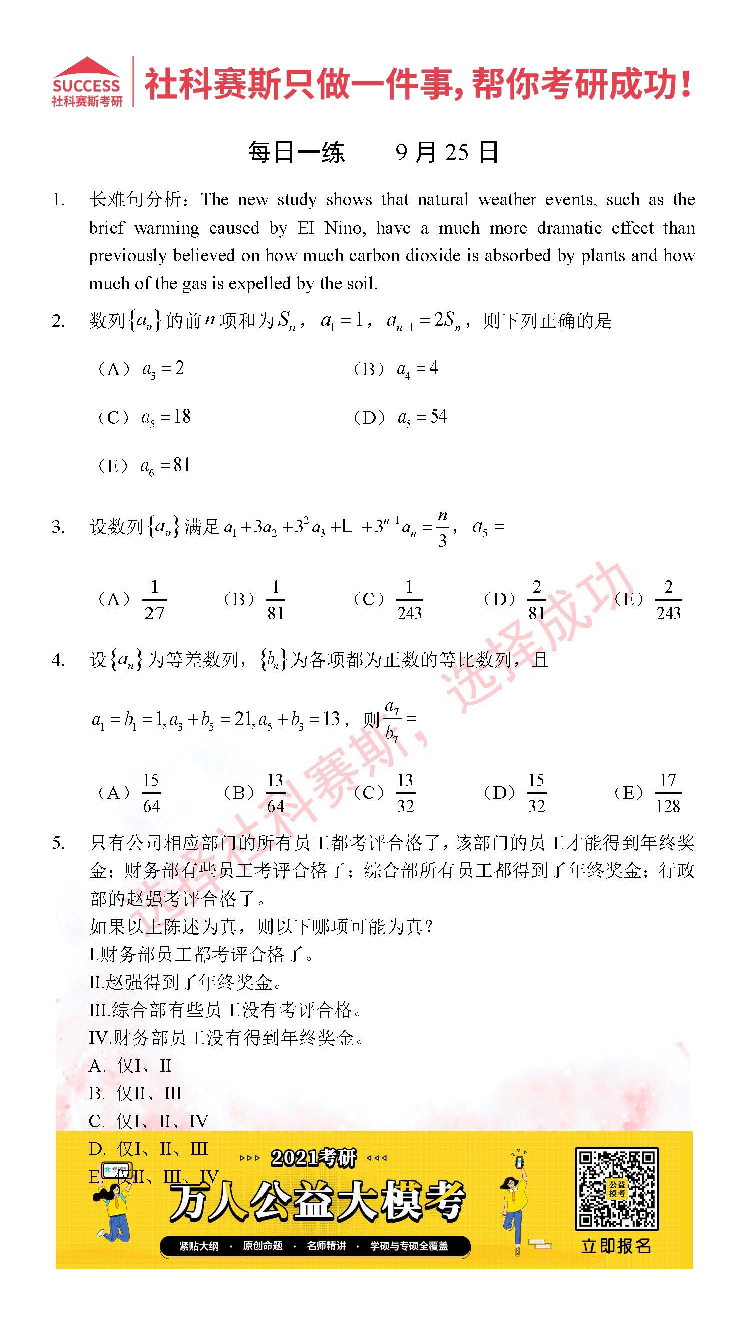 考研是一場(chǎng)持久戰(zhàn),保持良好的學(xué)習(xí)習(xí)慣,是能確保復(fù)習(xí)高效的關(guān)鍵。今天社科賽斯MBA備考網(wǎng)小編整理了“2021管理類(lèi)聯(lián)考9月25日每日一練及答案”的內(nèi)容,希望能對(duì)廣大考生有所幫助。