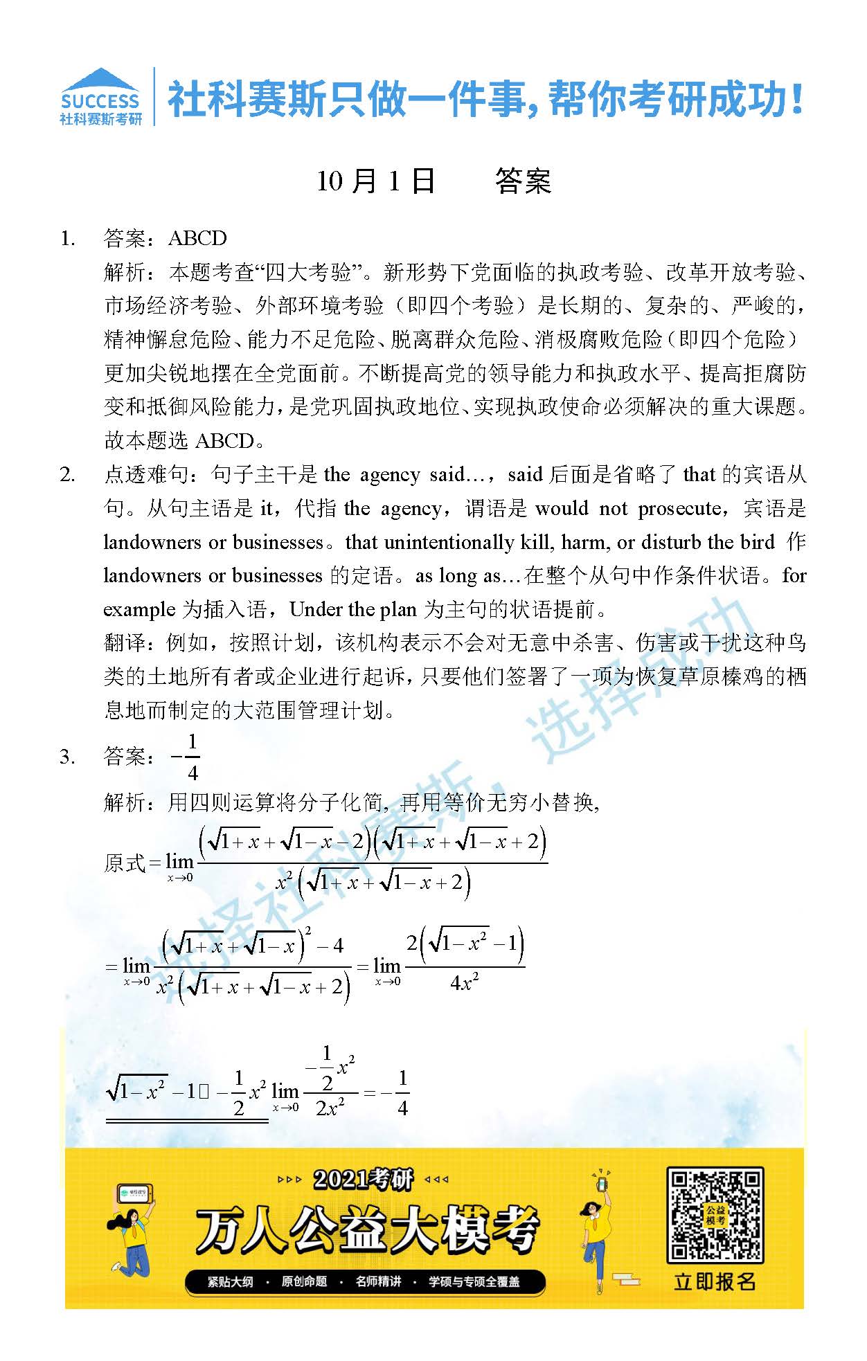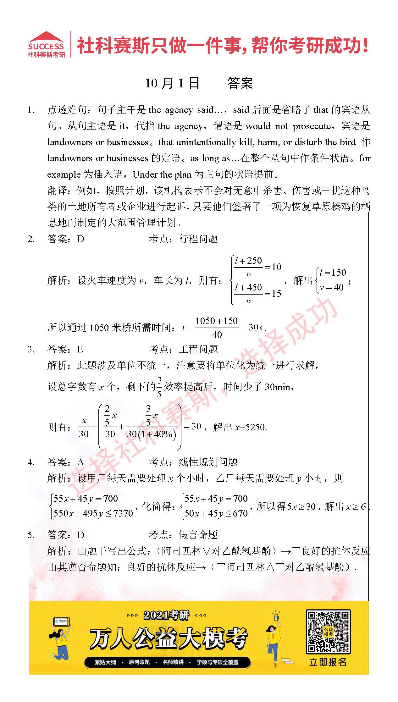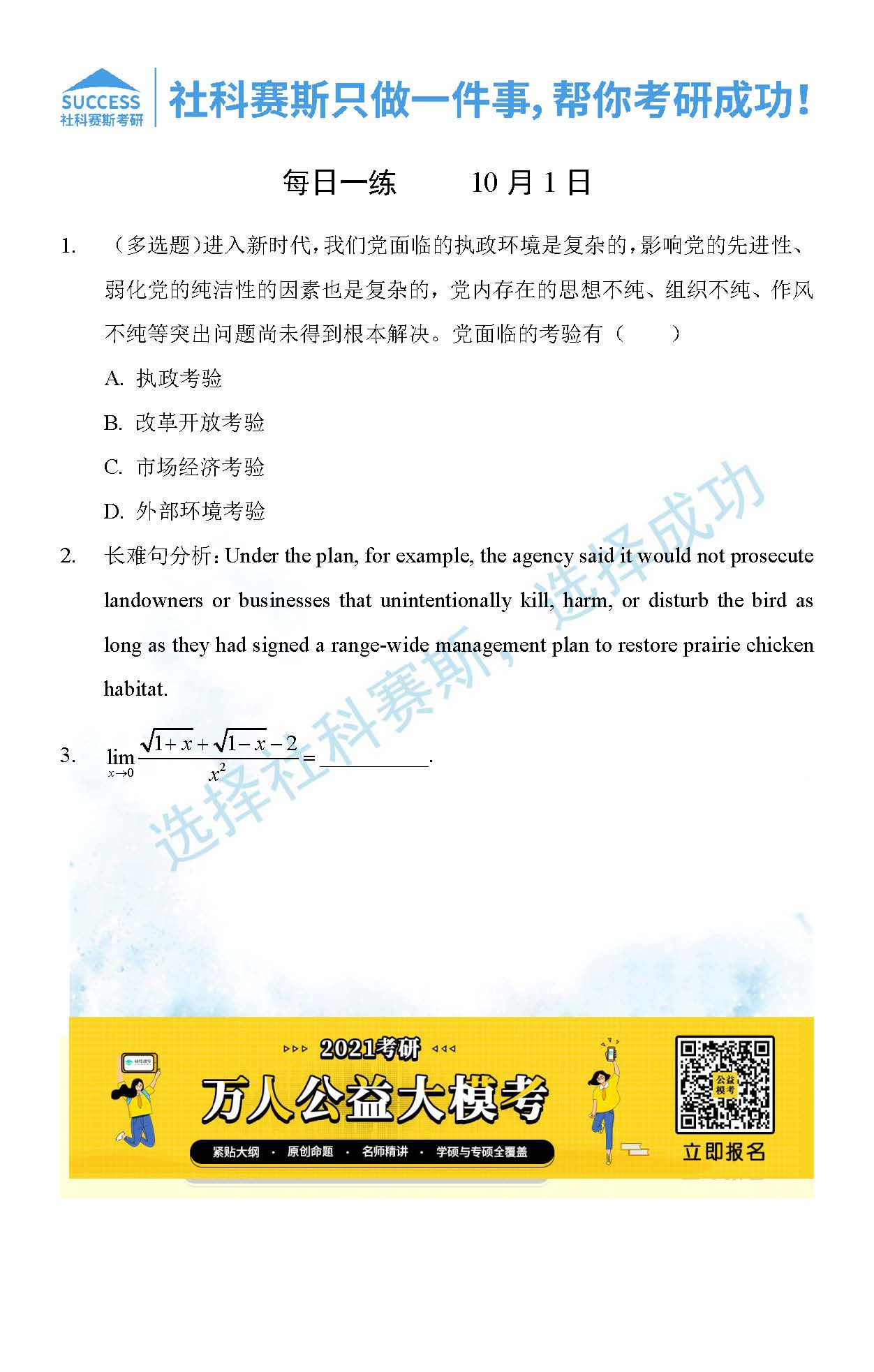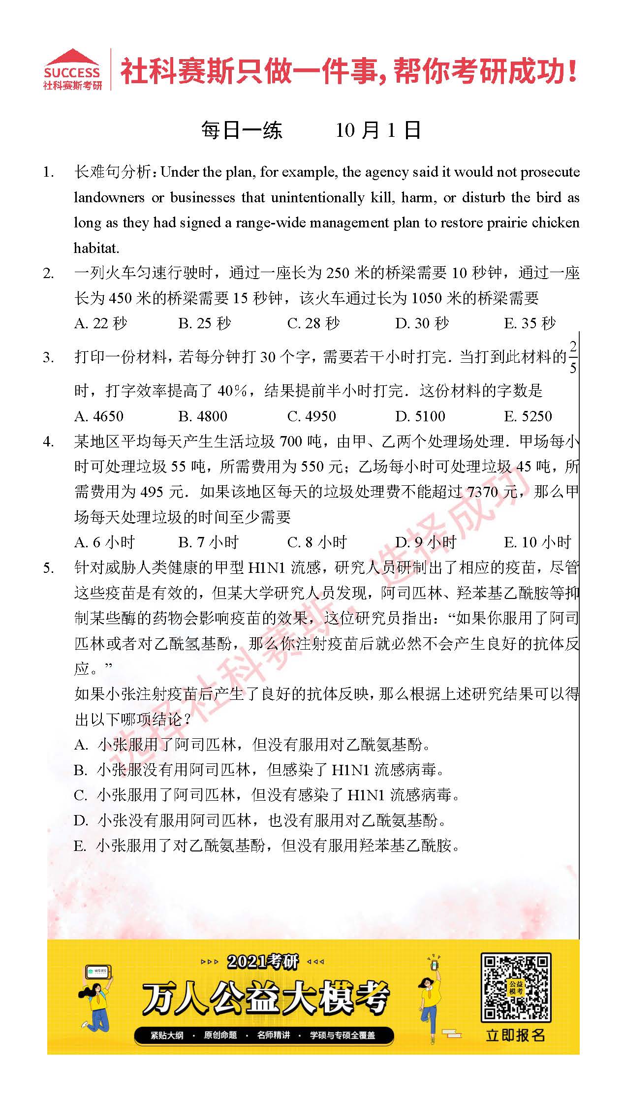 考研是一場持久戰(zhàn),保持良好的學習習慣,是能確保復習高效的關鍵。今天社科賽斯MBA備考網(wǎng)小編整理了“2021管理類聯(lián)考10月1日每日一練及答案”的內(nèi)容,希望能對廣大考生有所幫助。