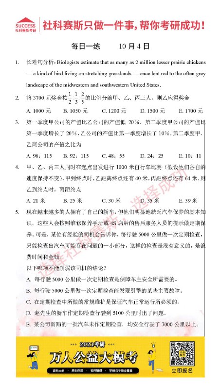 導讀:考研是一場持久戰(zhàn),保持良好的學習習慣,是能確保復習高效的關(guān)鍵。今天社科賽斯MBA備考網(wǎng)小編整理了“2021管理類聯(lián)10月4日每日一練及答案”的內(nèi)容,希望能對廣大考生有所幫助。
