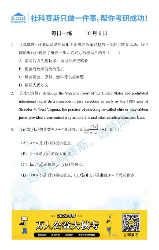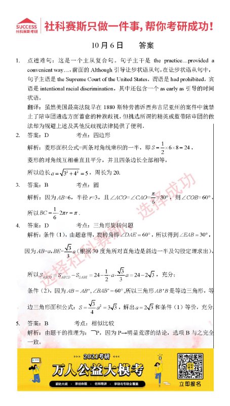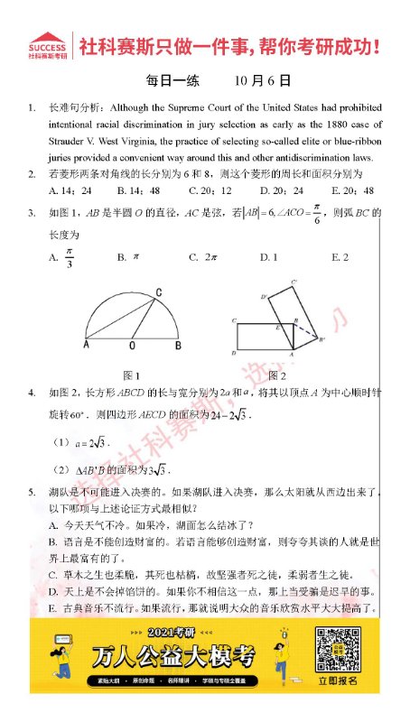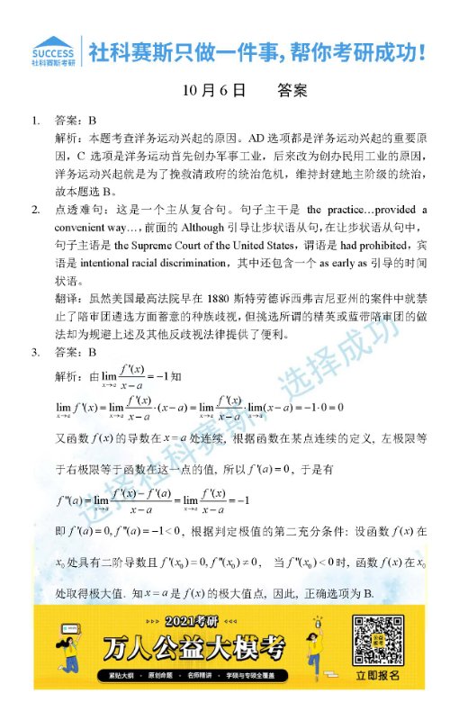 考研是一場(chǎng)持久戰(zhàn),保持良好的學(xué)習(xí)習(xí)慣,是能確保復(fù)習(xí)高效的關(guān)鍵。今天社科賽斯MBA備考網(wǎng)小編整理了“2021管理類聯(lián)考10月6日每日一練及答案”的內(nèi)容,希望能對(duì)廣大考生有所幫助。