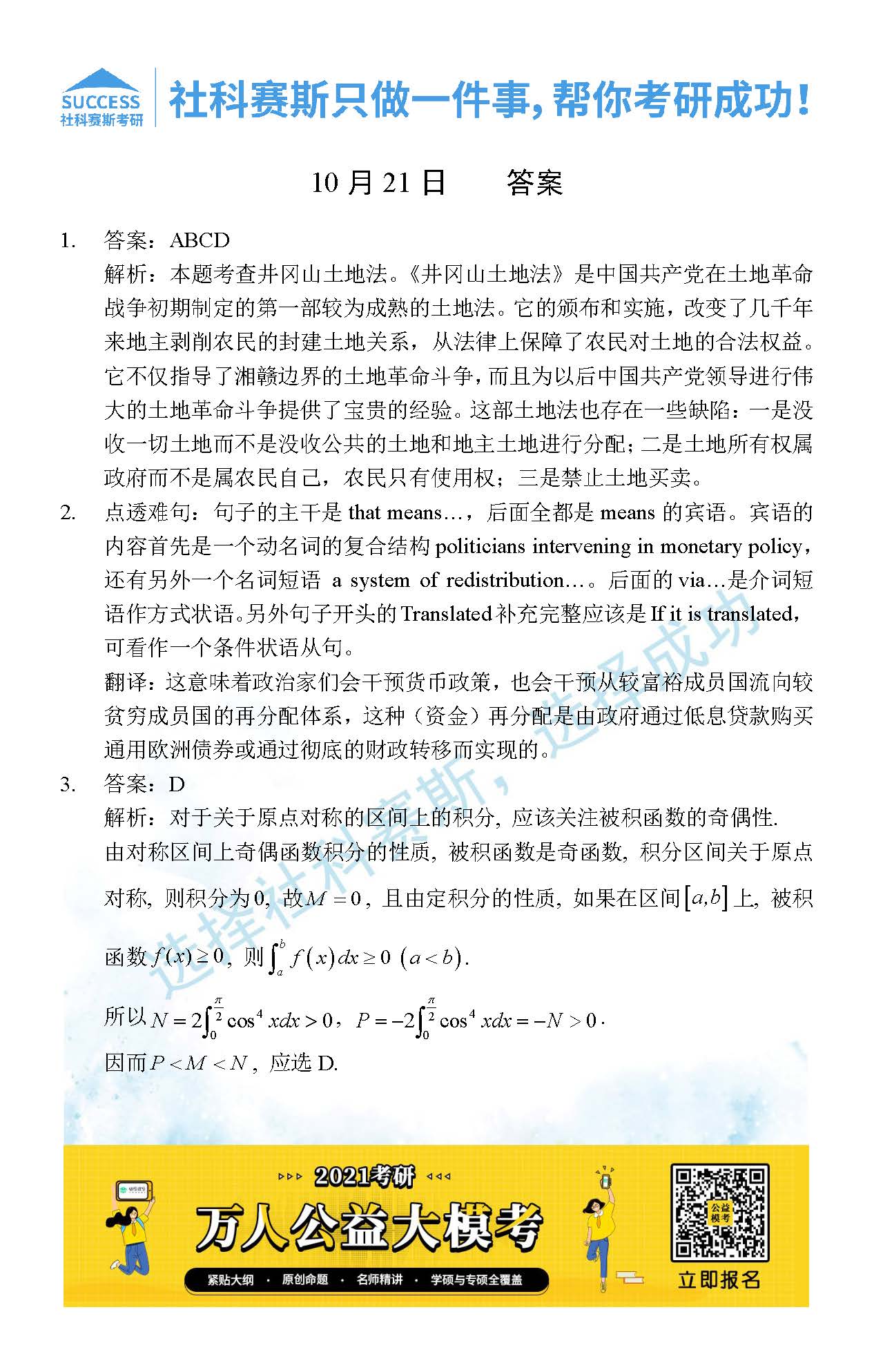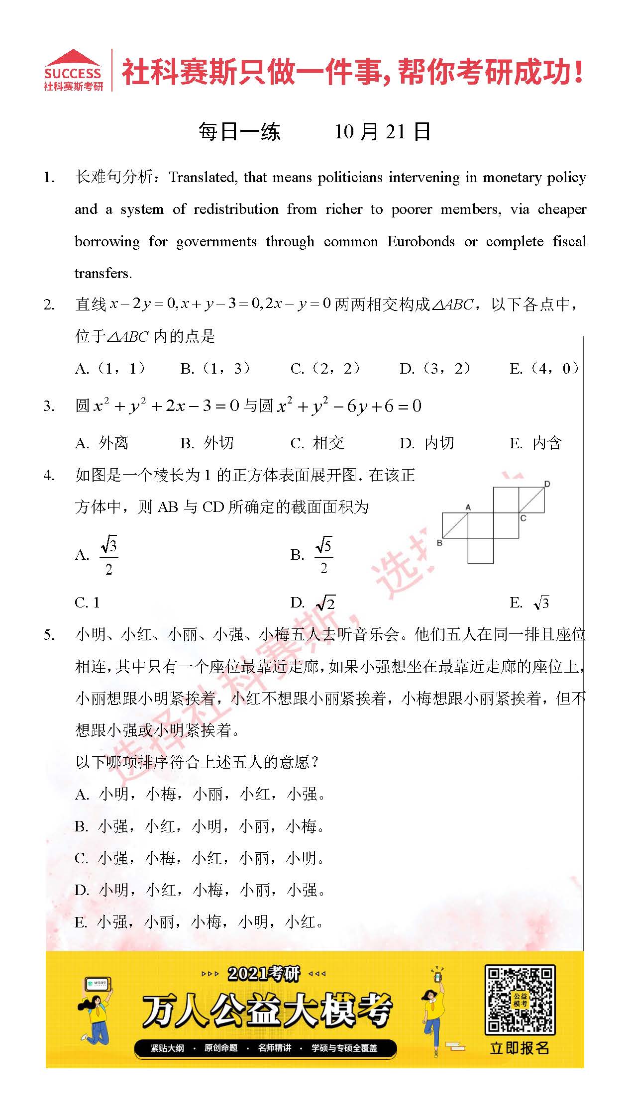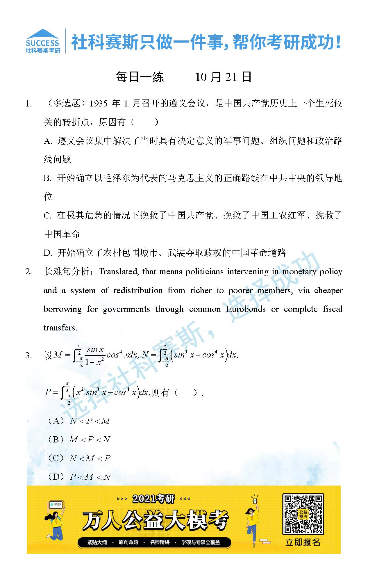 考研是一場持久戰(zhàn),保持良好的學(xué)習(xí)習(xí)慣,是能確保復(fù)習(xí)高效的關(guān)鍵。今天社科賽斯MBA備考網(wǎng)小編整理了“2021管理類聯(lián)10月21日每日一練及答案”的內(nèi)容,希望能對廣大考生有所幫助。