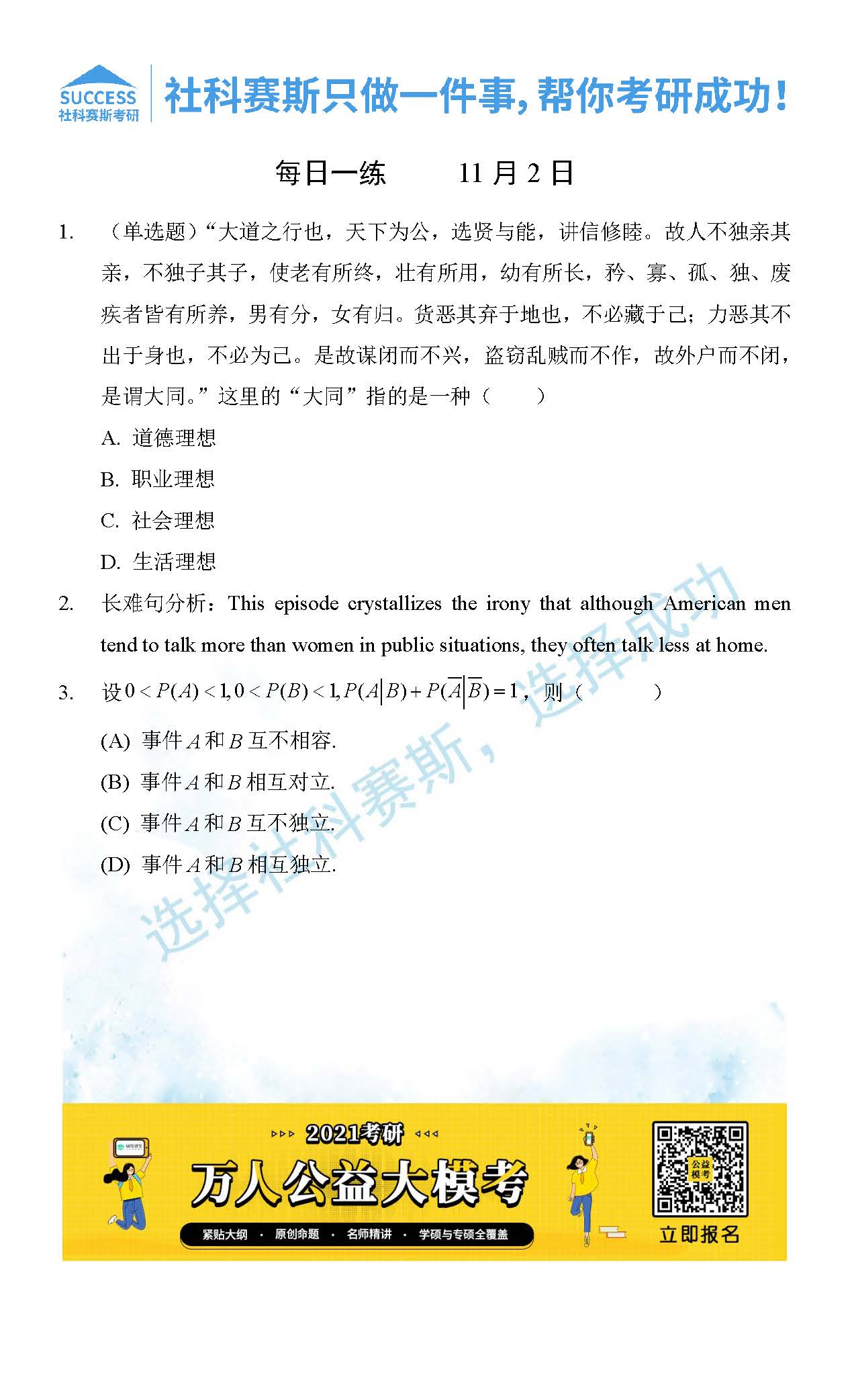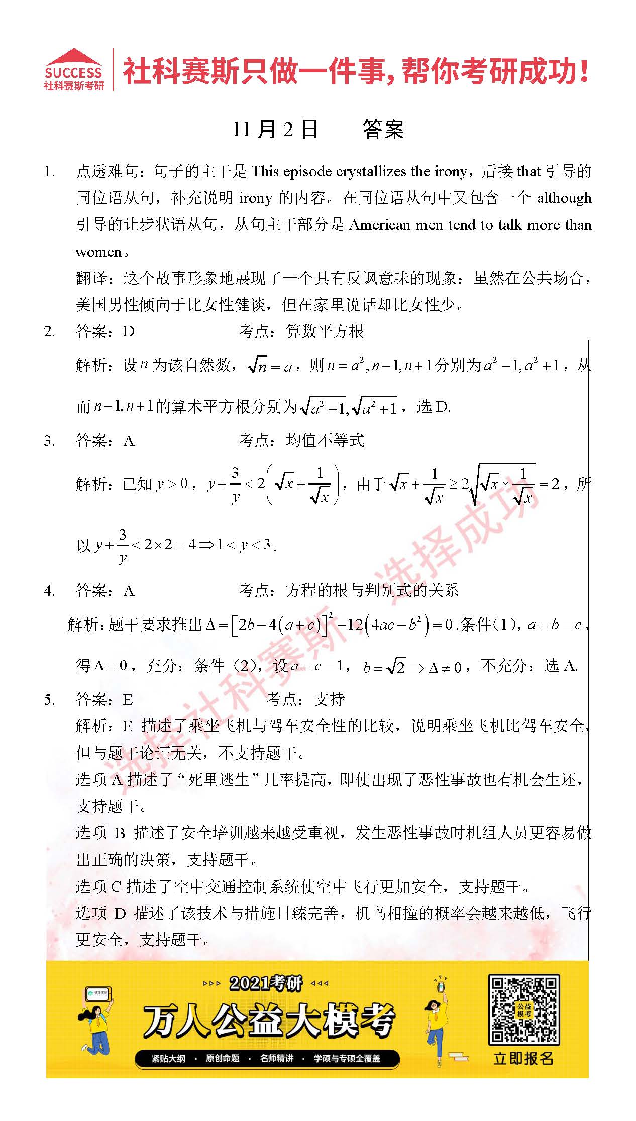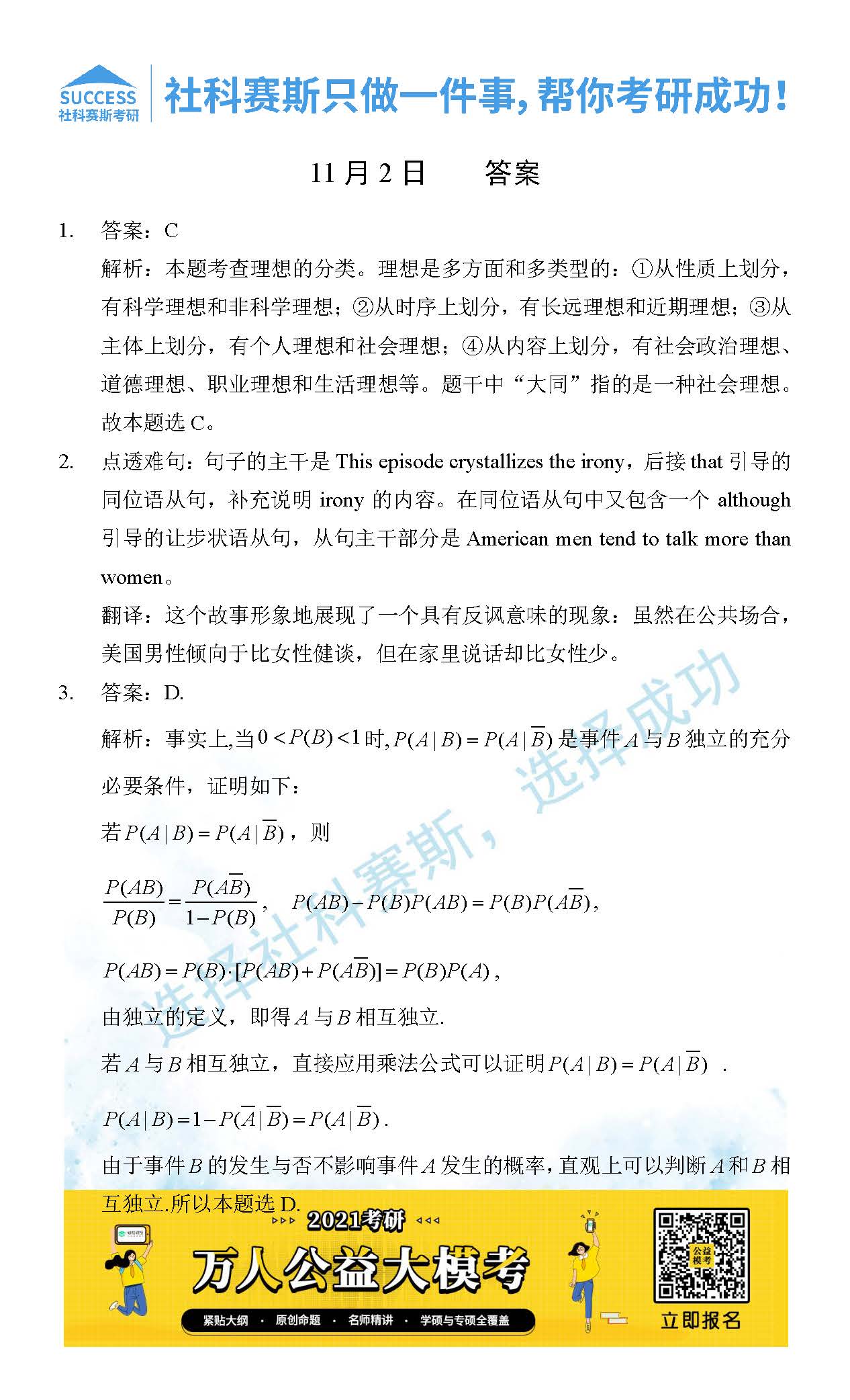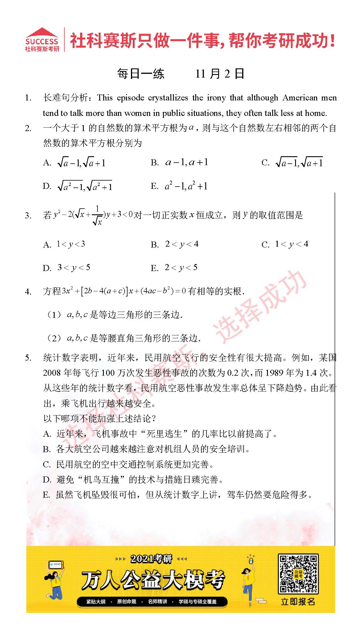 考研是一場持久戰(zhàn),保持良好的學習習慣,是能確保復習高效的關鍵。今天社科賽斯MBA備考網小編整理了“2021管理類聯(lián)11月2日每日一練及答案”的內容,希望能對廣大考生有所幫助。