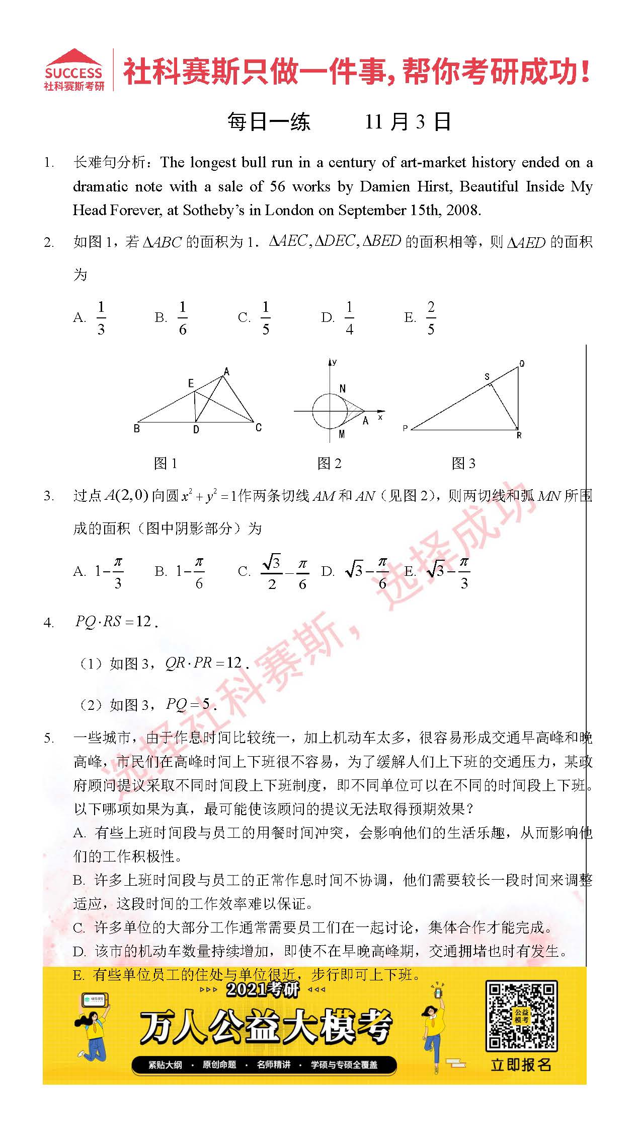 導(dǎo)讀:考研是一場持久戰(zhàn),保持良好的學(xué)習(xí)習(xí)慣,是能確保復(fù)習(xí)高效的關(guān)鍵。今天社科賽斯MBA備考網(wǎng)小編整理了“2021管理類聯(lián)11月3日每日一練及答案”的內(nèi)容,希望能對廣大考生有所幫助。