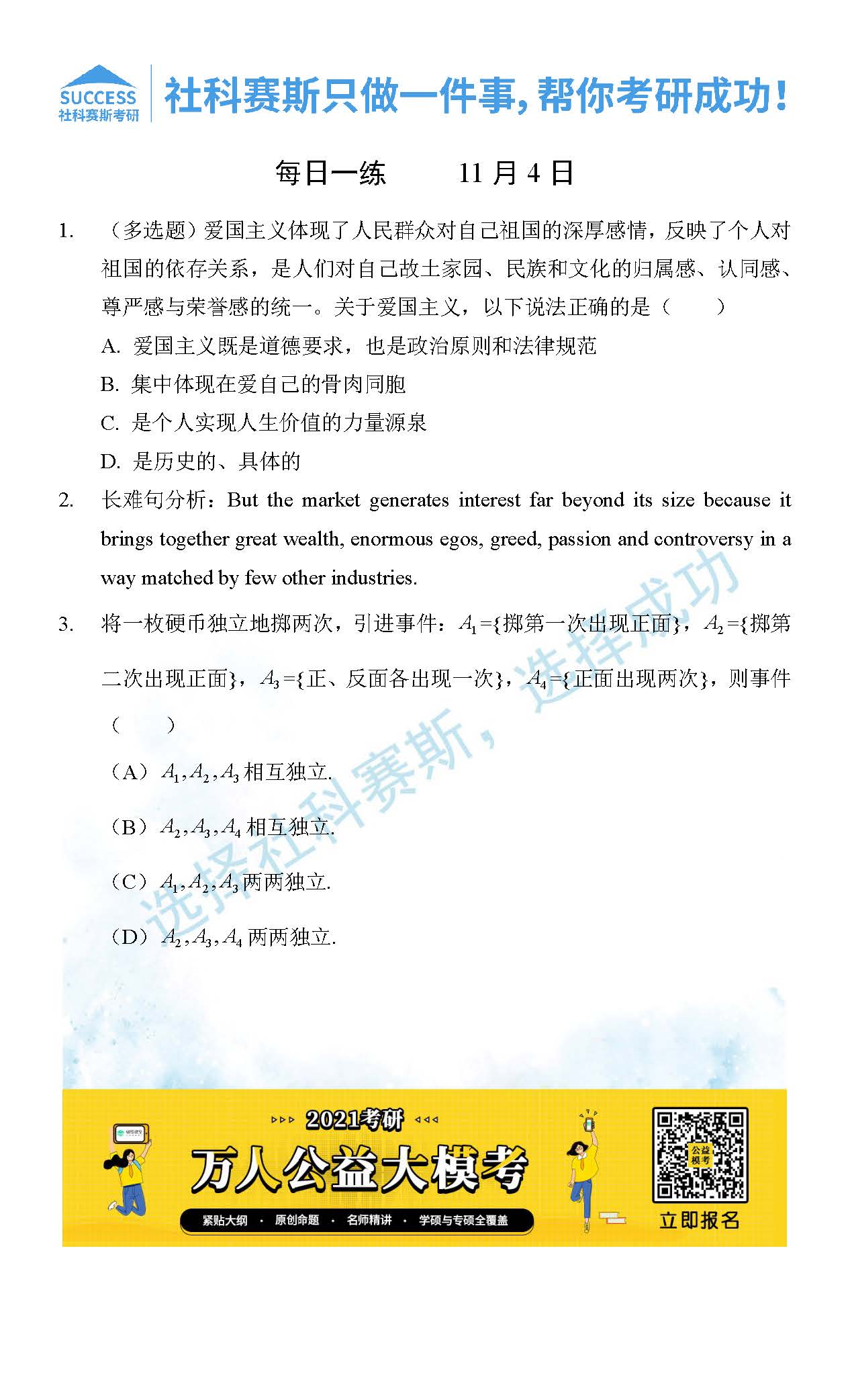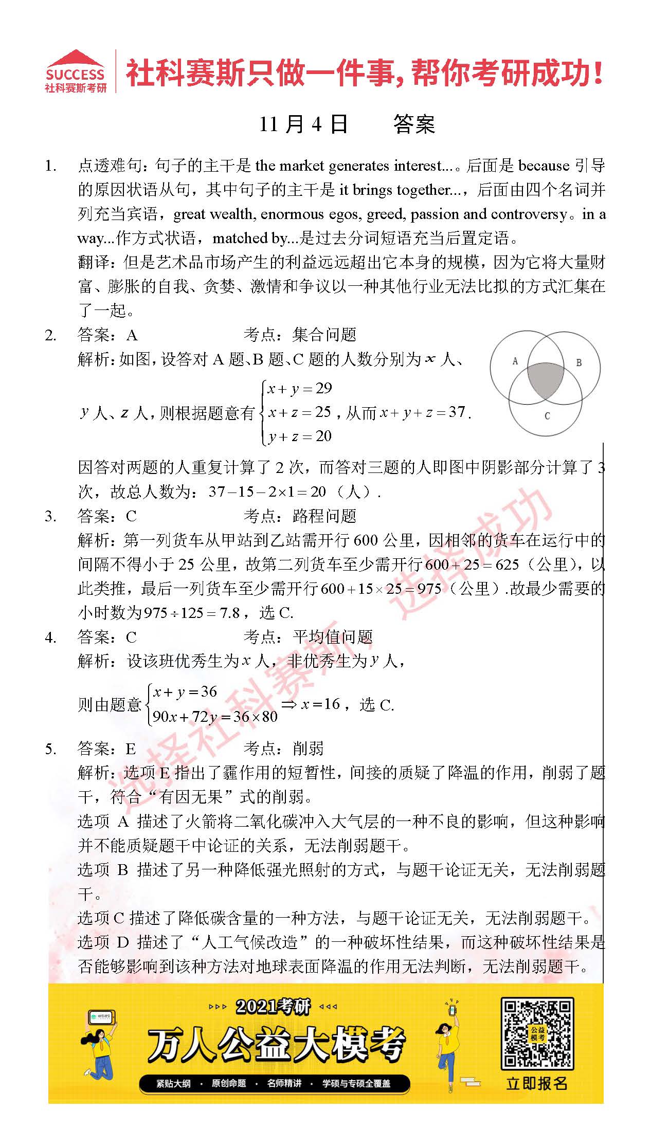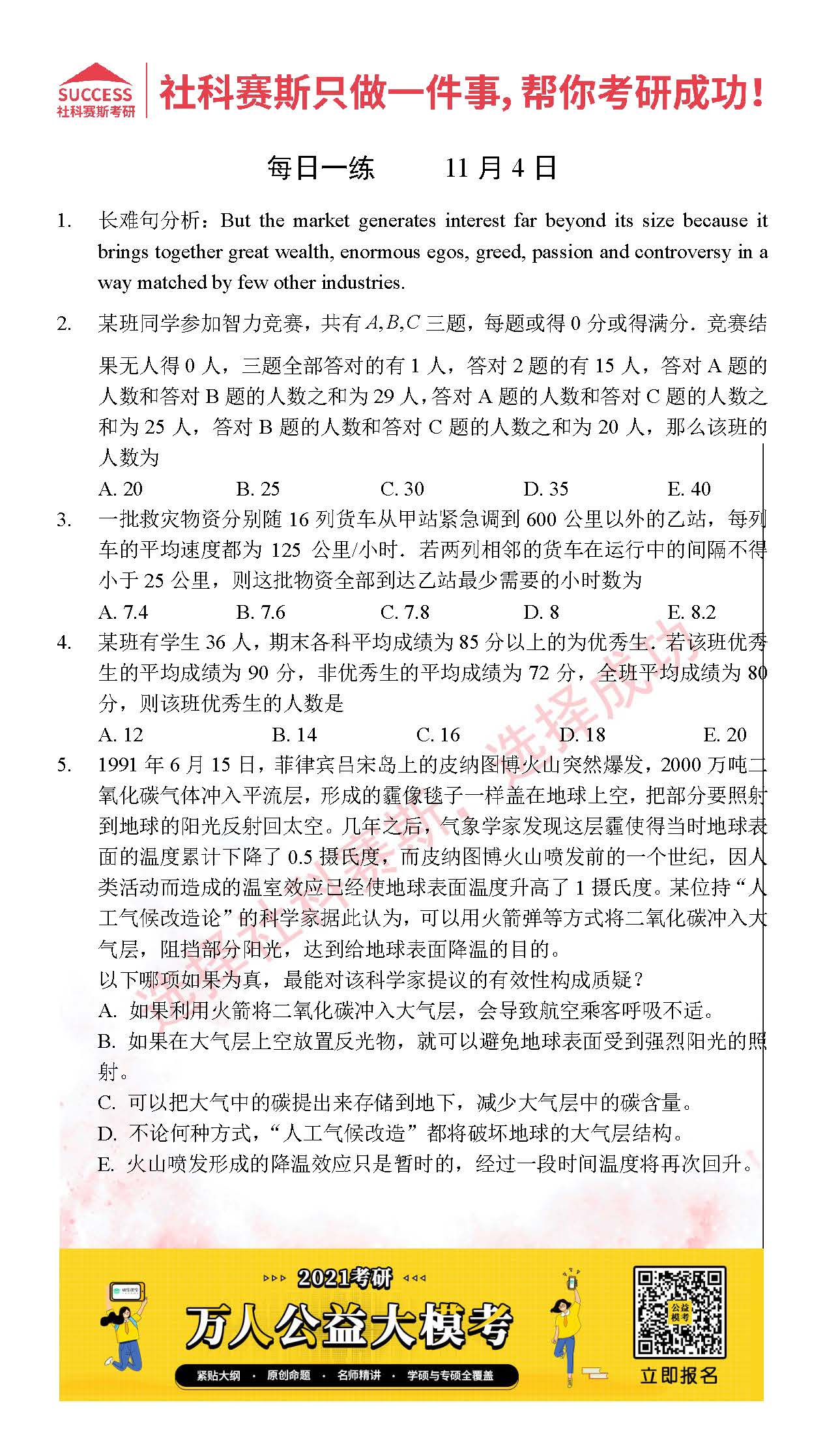 考研是一場持久戰(zhàn),保持良好的學(xué)習(xí)習(xí)慣,是能確保復(fù)習(xí)高效的關(guān)鍵。今天社科賽斯MBA備考網(wǎng)小編整理了“2021管理類聯(lián)11月4日每日一練及答案”的內(nèi)容,希望能對廣大考生有所幫助。