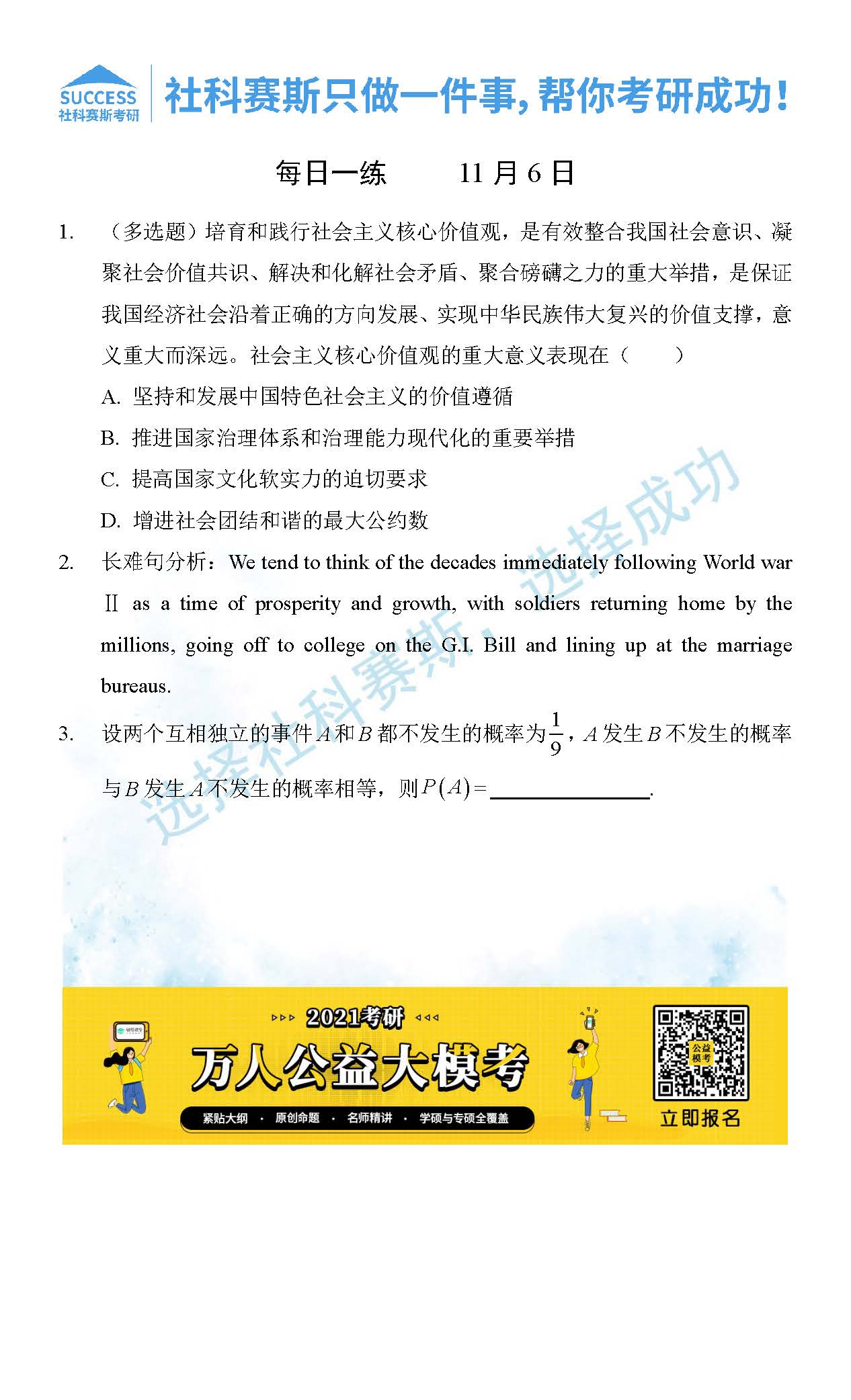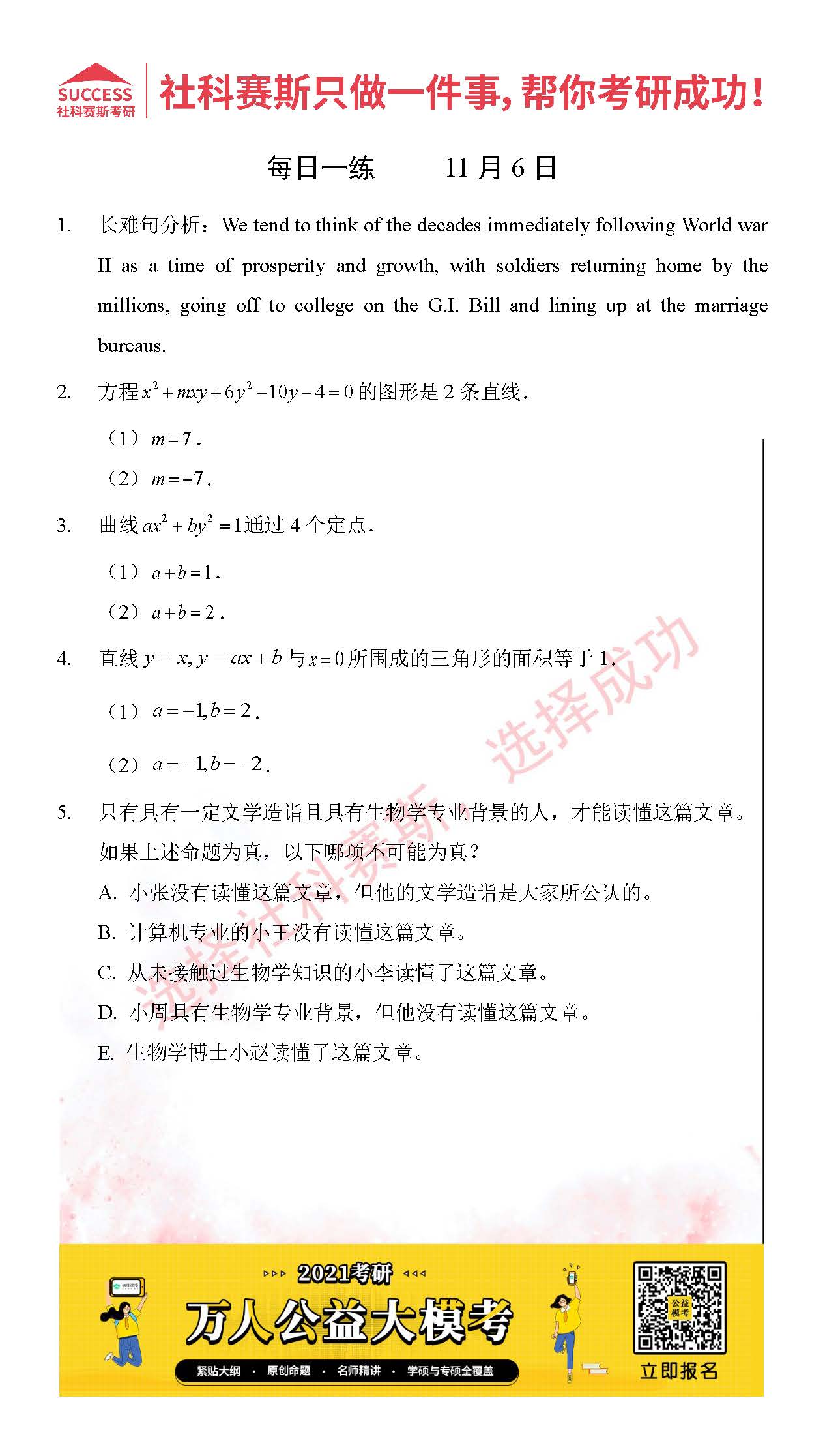 考研是一場持久戰(zhàn),保持良好的學(xué)習(xí)習(xí)慣,是能確保復(fù)習(xí)高效的關(guān)鍵。今天社科賽斯MBA備考網(wǎng)小編整理了“2021管理類聯(lián)11月6日每日一練及答案”的內(nèi)容,希望能對廣大考生有所幫助。