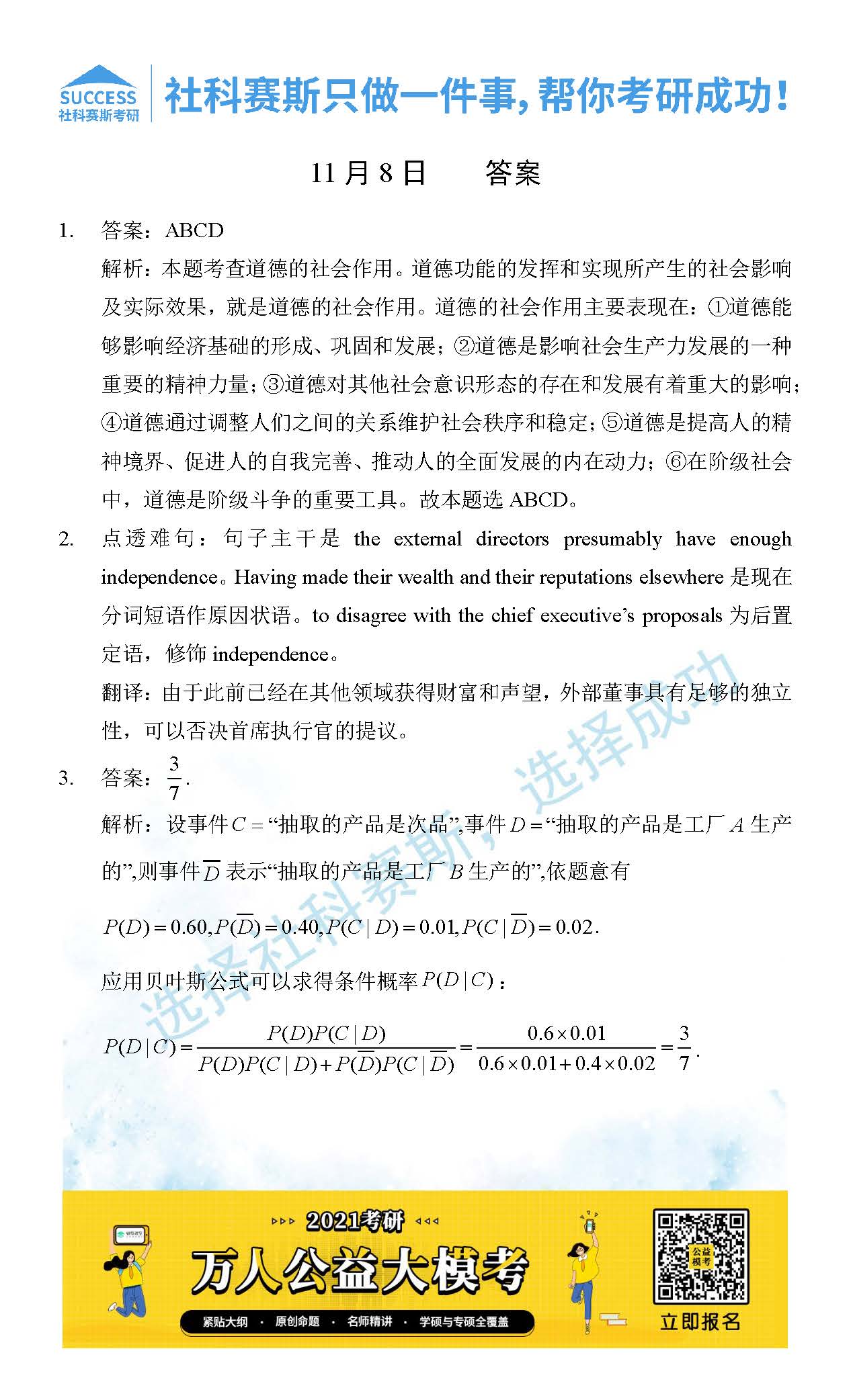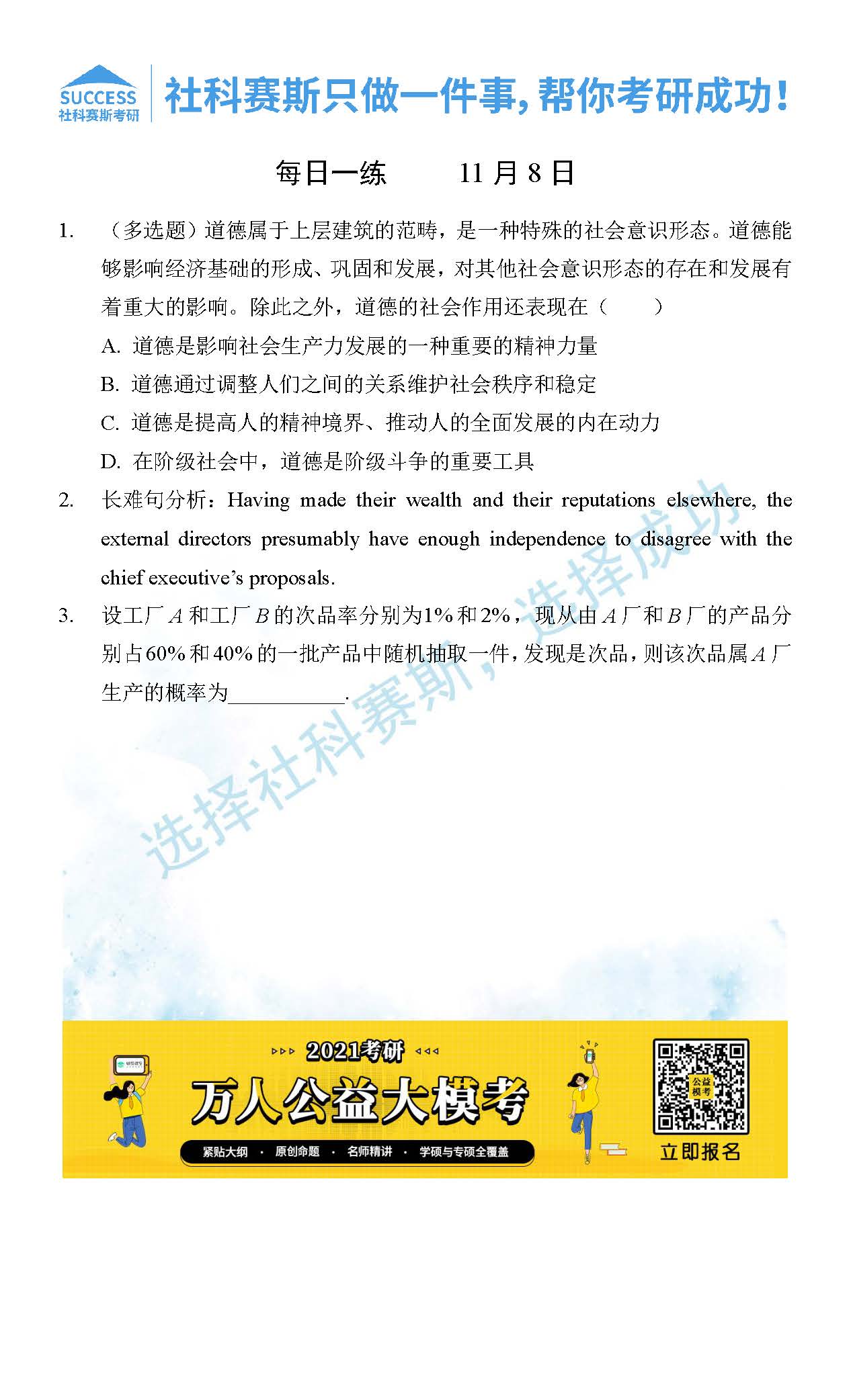 考研是一場持久戰(zhàn),保持良好的學(xué)習(xí)習(xí)慣,是能確保復(fù)習(xí)高效的關(guān)鍵。今天社科賽斯MBA備考網(wǎng)小編整理了“2021管理類聯(lián)11月8日每日一練及答案”的內(nèi)容,希望能對廣大考生有所幫助。