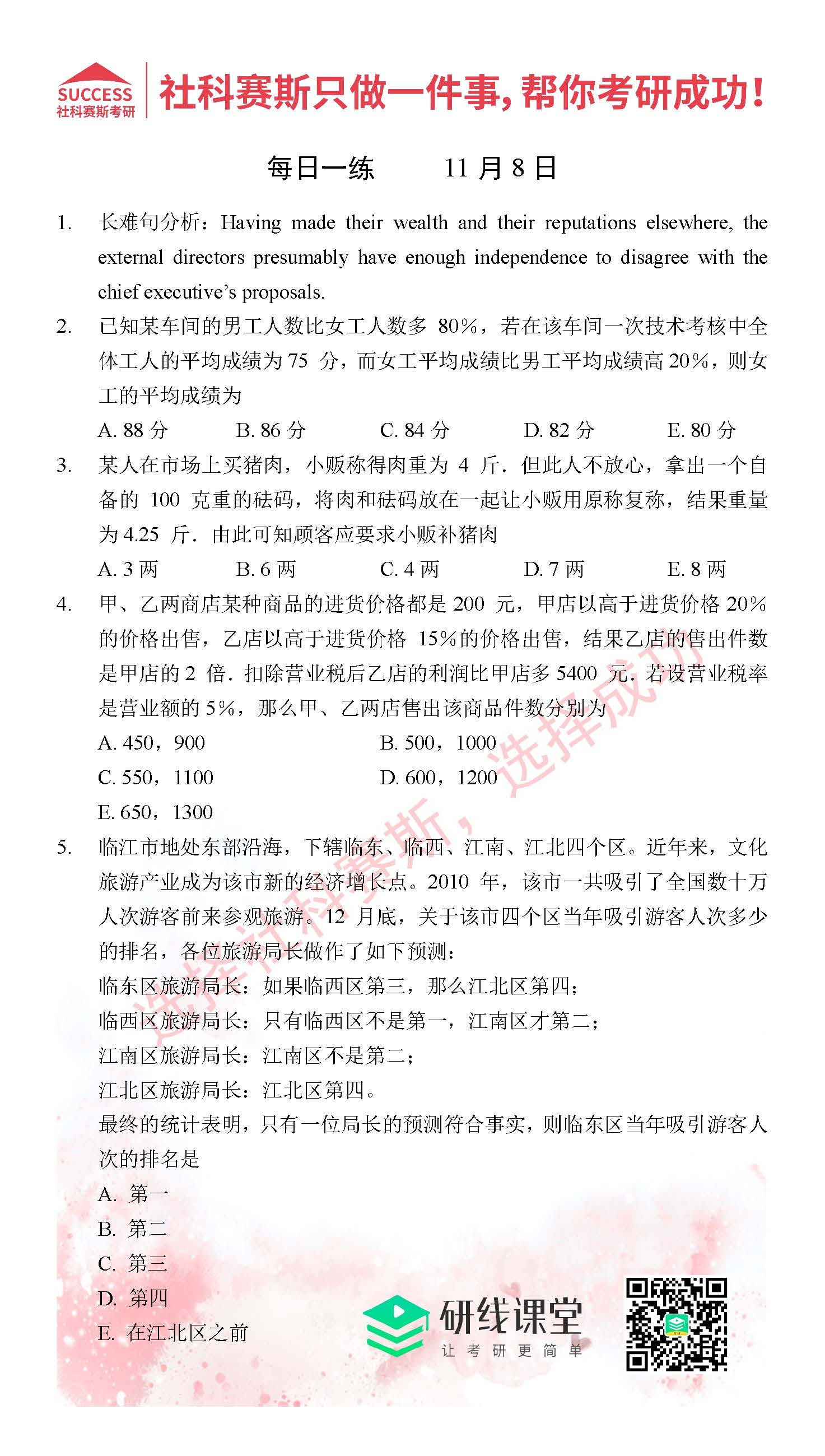 導(dǎo)讀:考研是一場持久戰(zhàn),保持良好的學(xué)習(xí)習(xí)慣,是能確保復(fù)習(xí)高效的關(guān)鍵。今天社科賽斯MBA備考網(wǎng)小編整理了“2021管理類聯(lián)11月8日每日一練及答案”的內(nèi)容,希望能對廣大考生有所幫助。