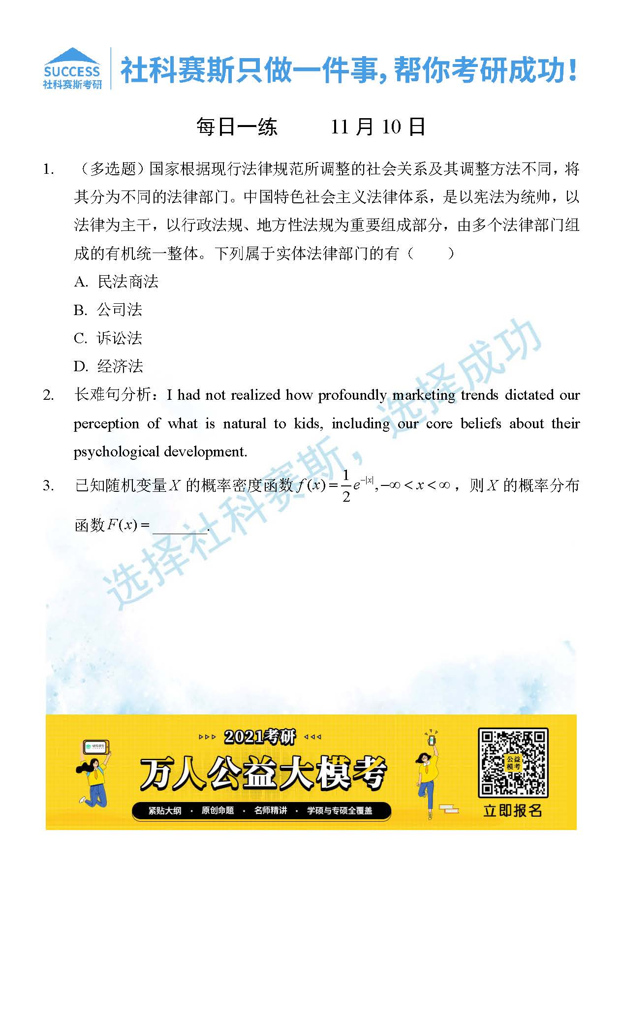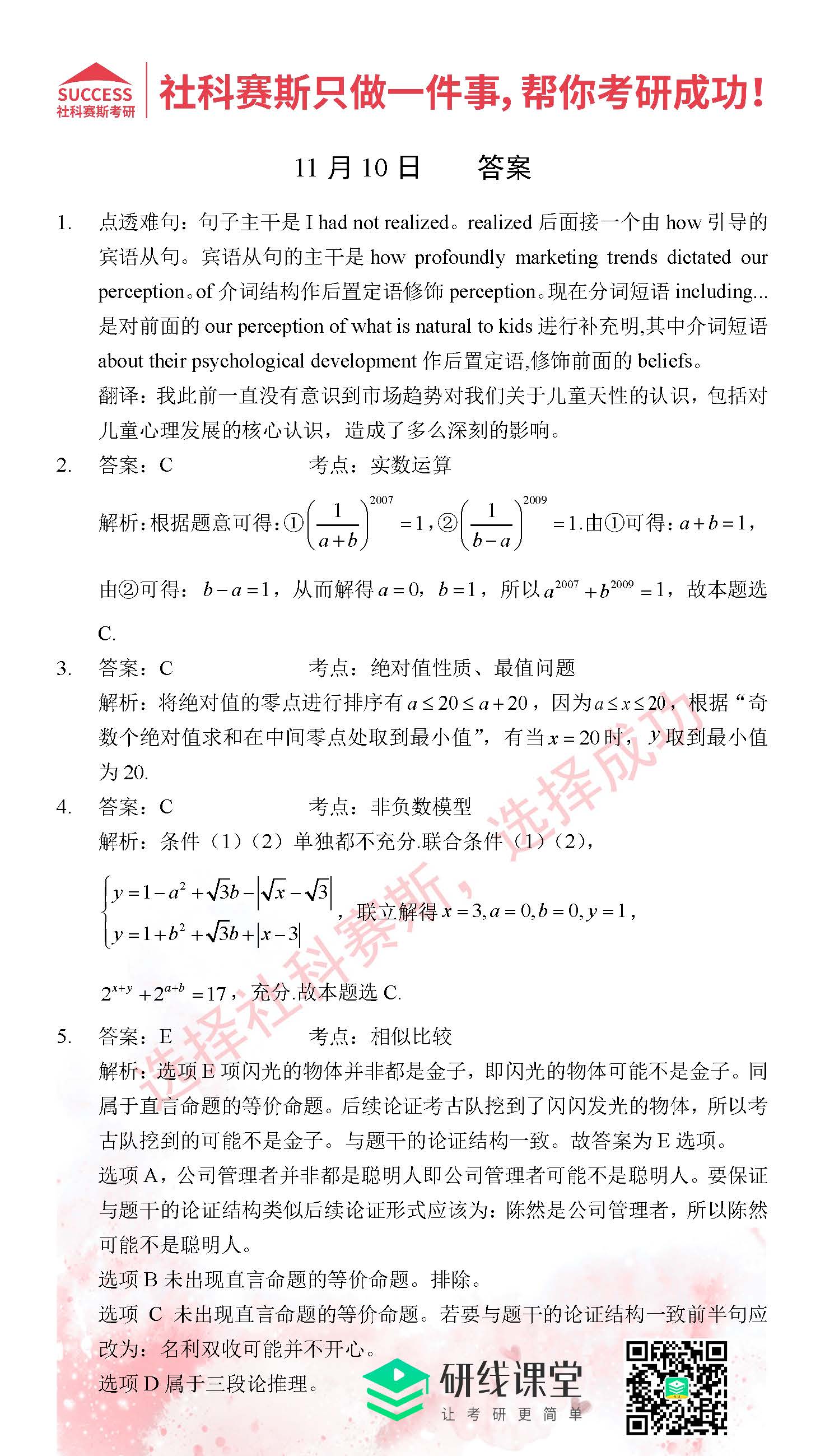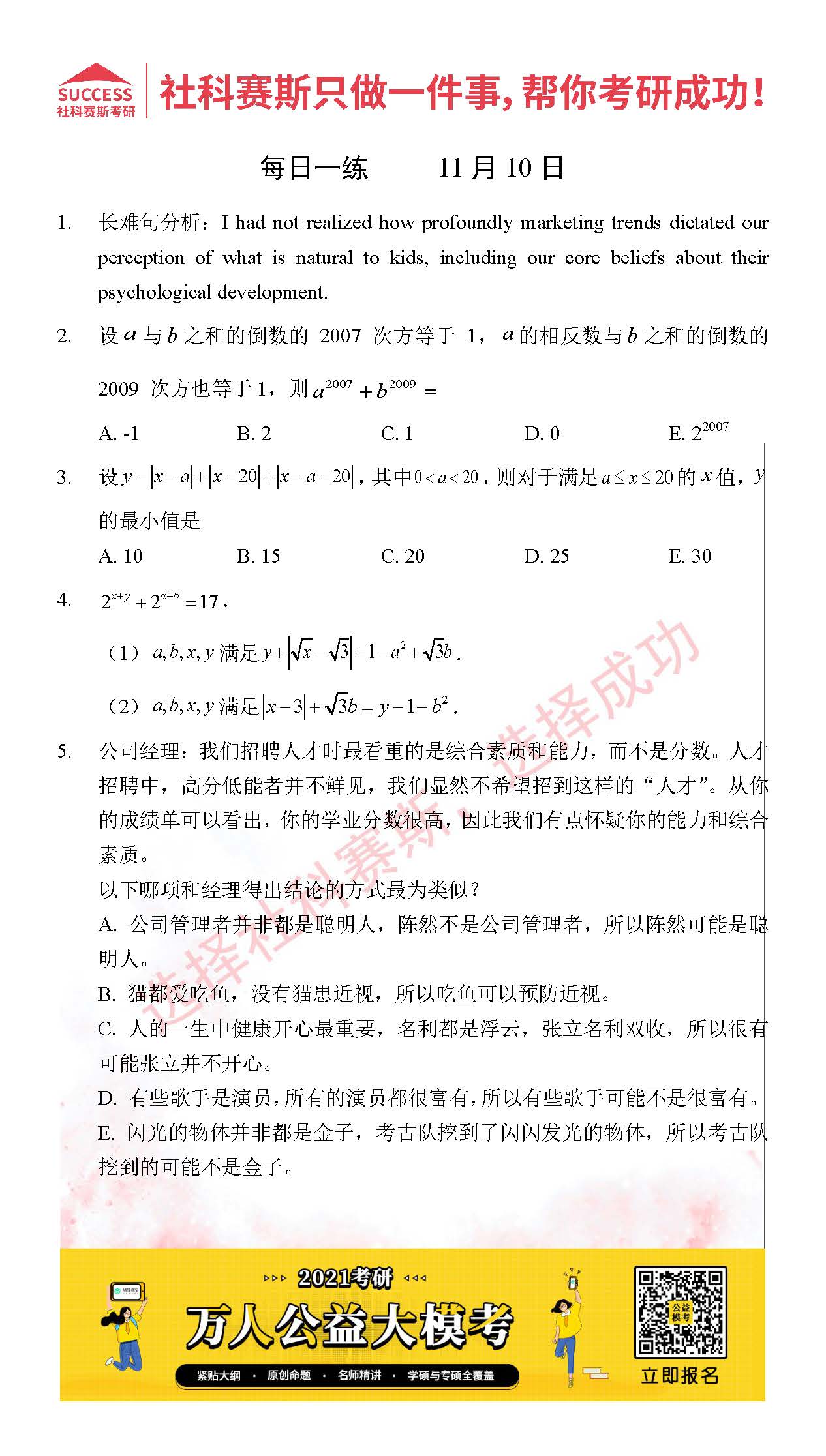 考研是一場(chǎng)持久戰(zhàn),保持良好的學(xué)習(xí)習(xí)慣,是能確保復(fù)習(xí)高效的關(guān)鍵。今天社科賽斯MBA備考網(wǎng)小編整理了“2021管理類聯(lián)11月10日每日一練及答案”的內(nèi)容,希望能對(duì)廣大考生有所幫助。