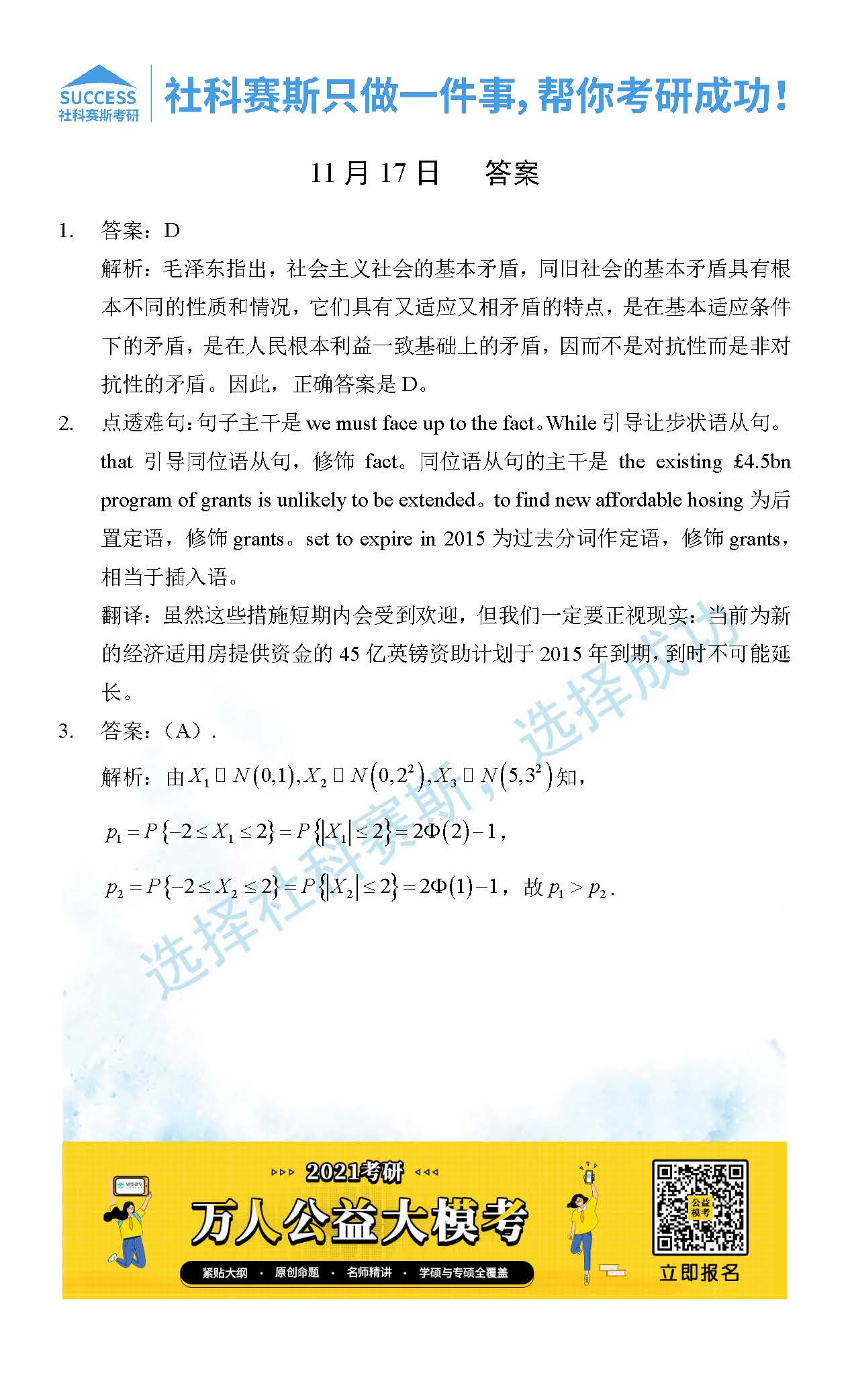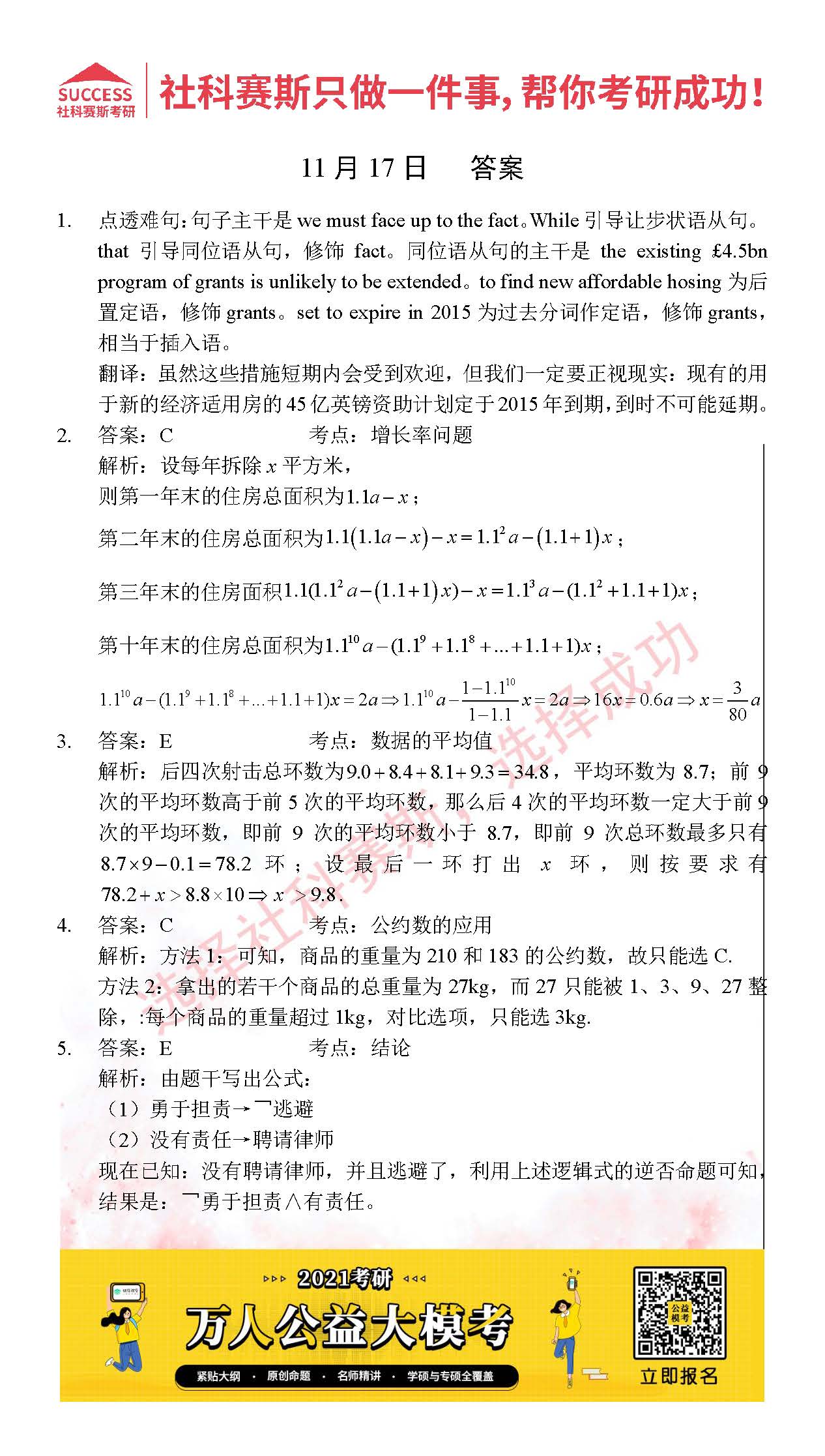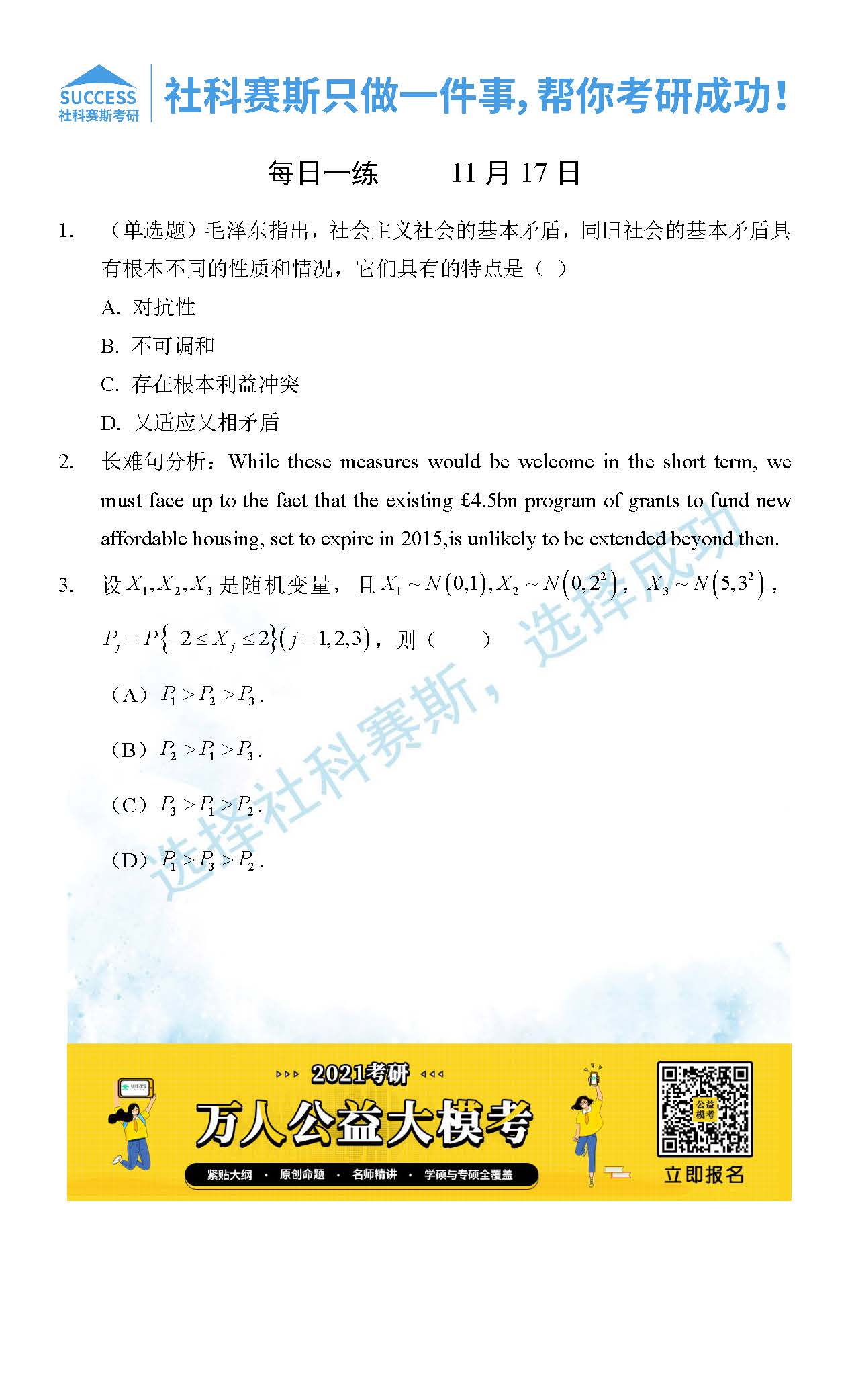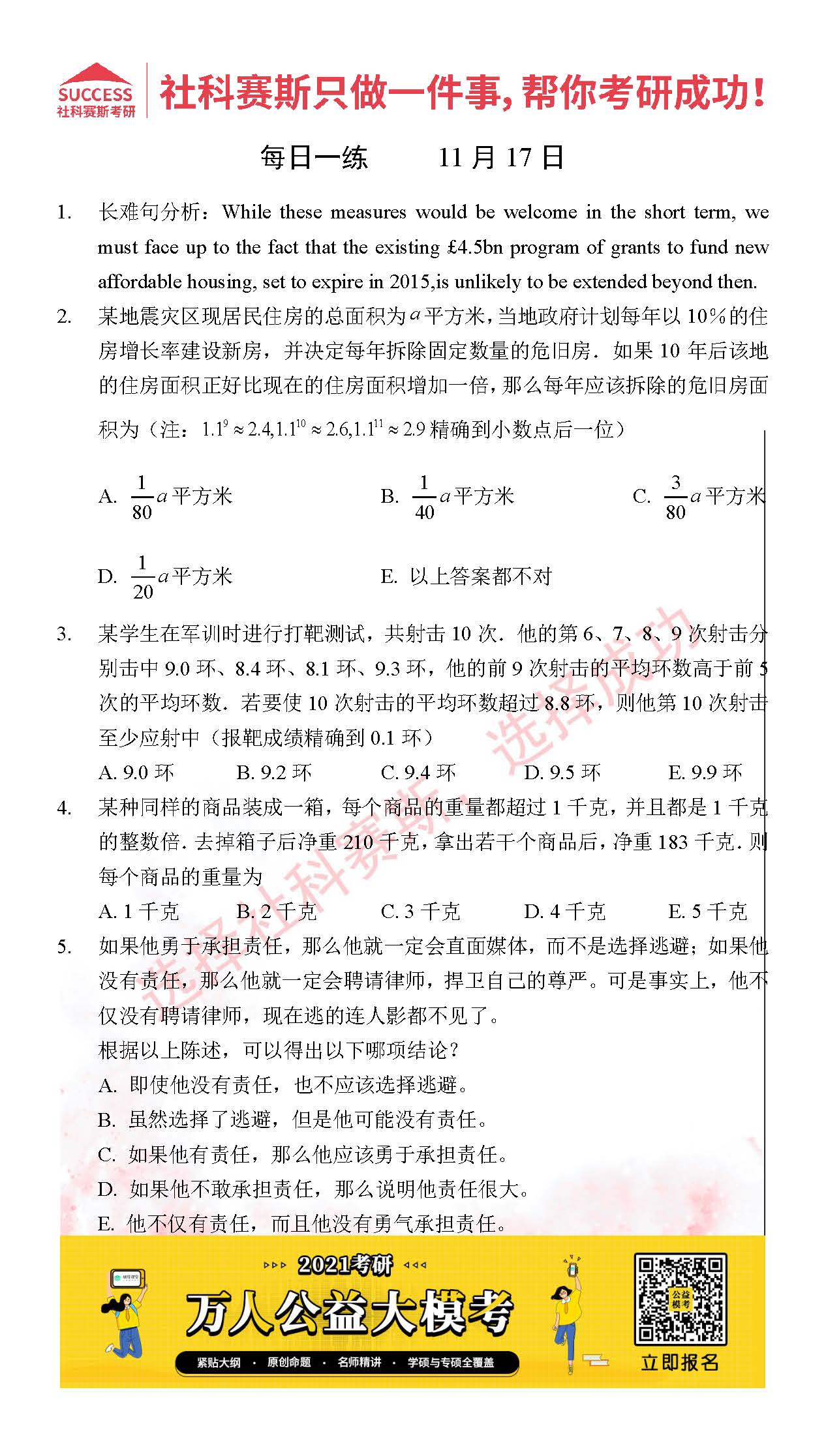 考研是一場持久戰(zhàn),保持良好的學(xué)習(xí)習(xí)慣,是能確保復(fù)習(xí)高效的關(guān)鍵。今天社科賽斯MBA備考網(wǎng)小編整理了“2021管理類聯(lián)11月17日每日一練及答案”的內(nèi)容,希望能對廣大考生有所幫助。