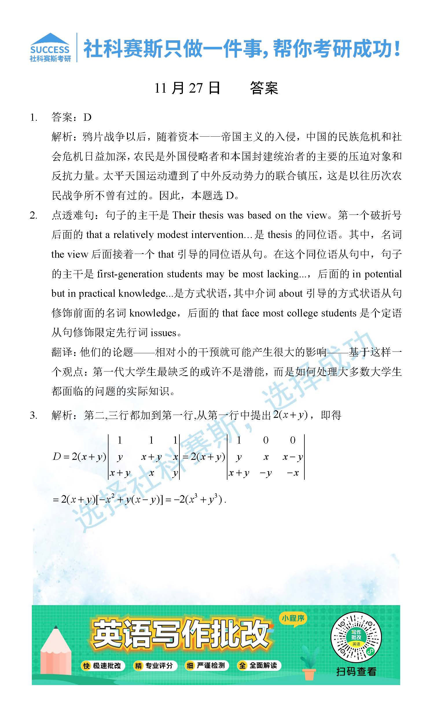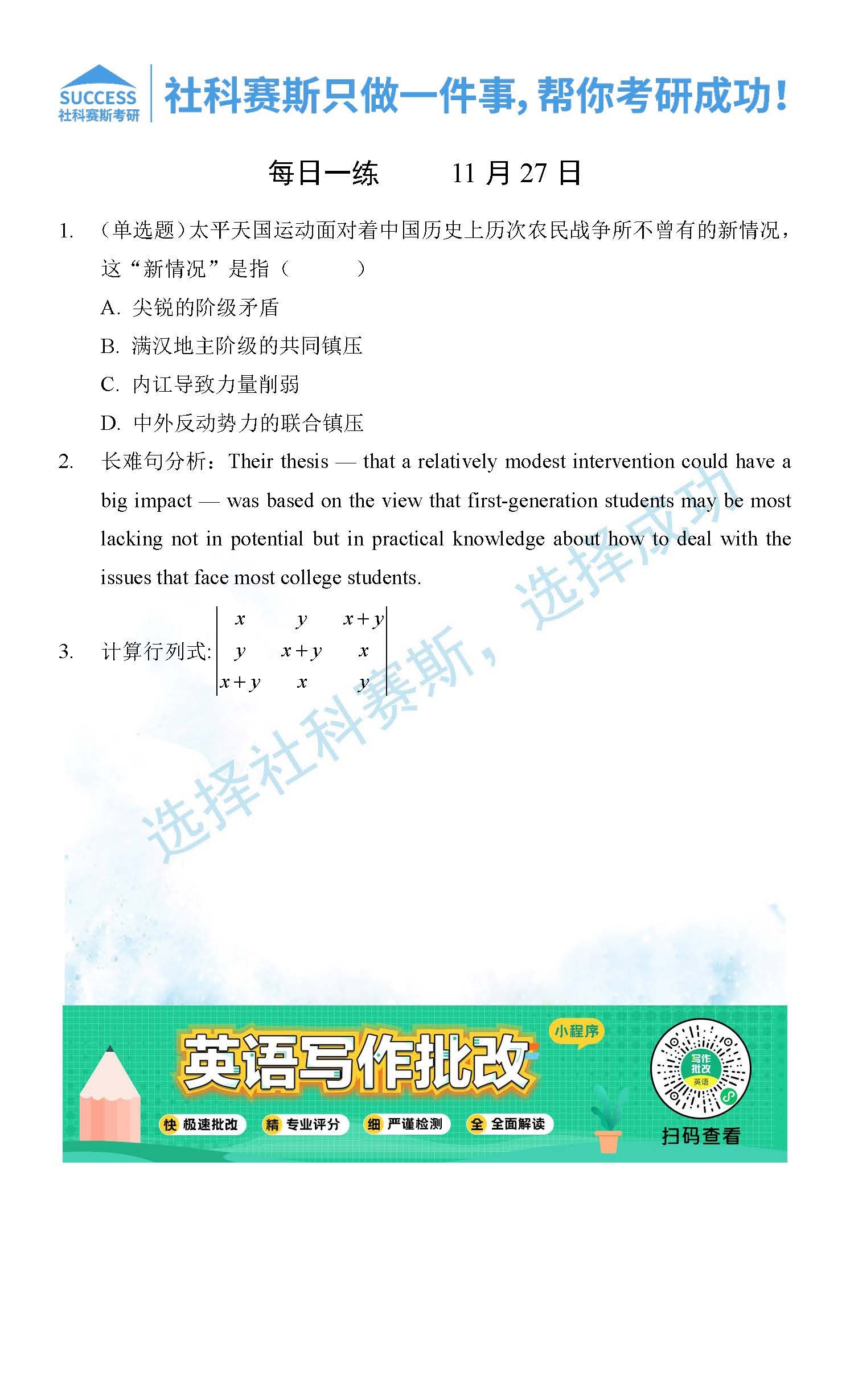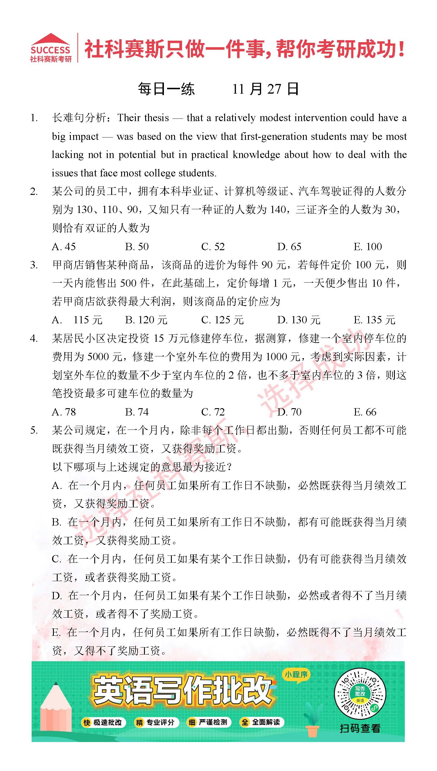 考研是一場持久戰(zhàn),保持良好的學(xué)習(xí)習(xí)慣,是能確保復(fù)習(xí)高效的關(guān)鍵。今天社科賽斯MBA備考網(wǎng)小編整理了“2021管理類聯(lián)11月27日每日一練及答案”的內(nèi)容,希望能對廣大考生有所幫助。
