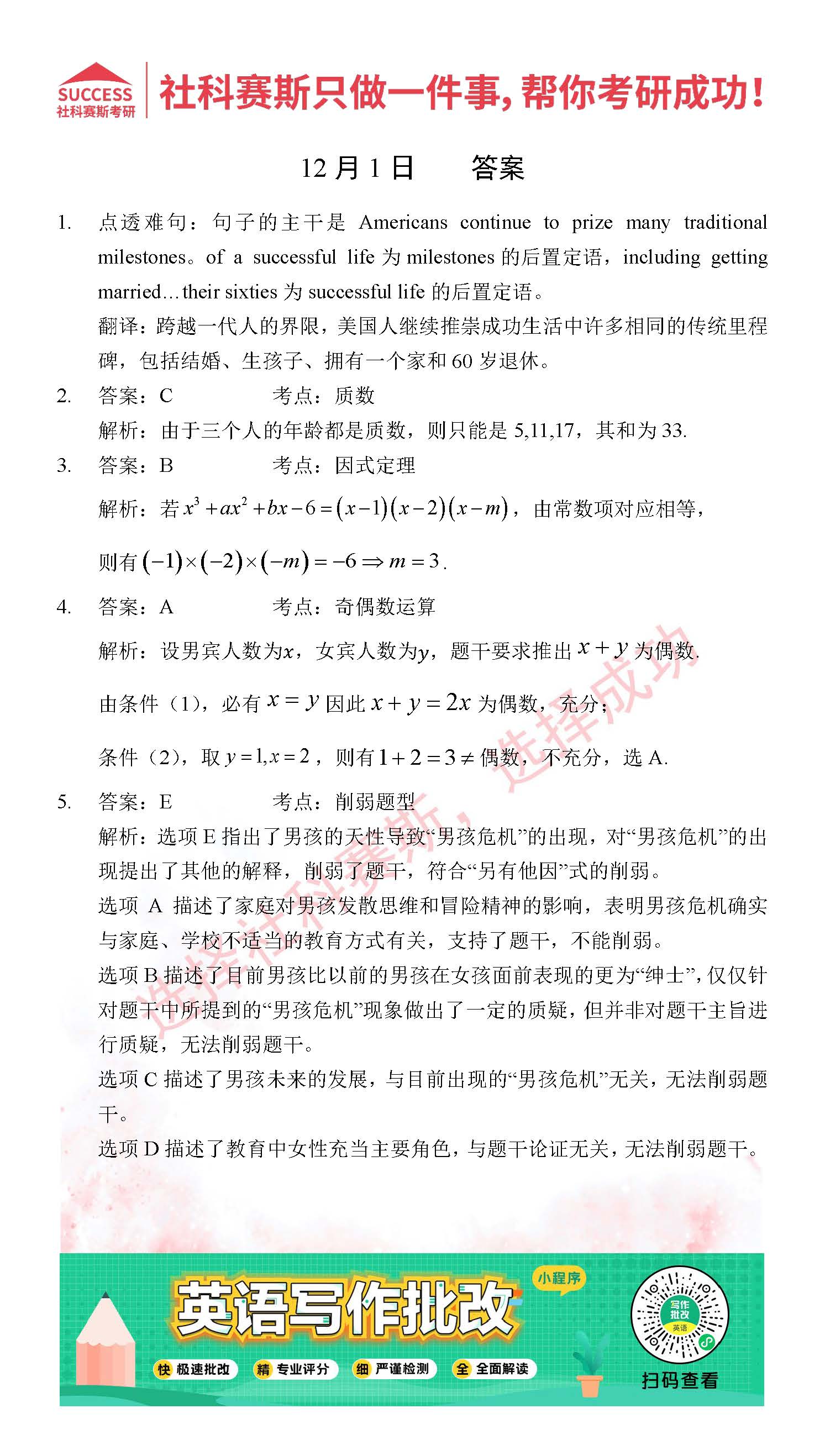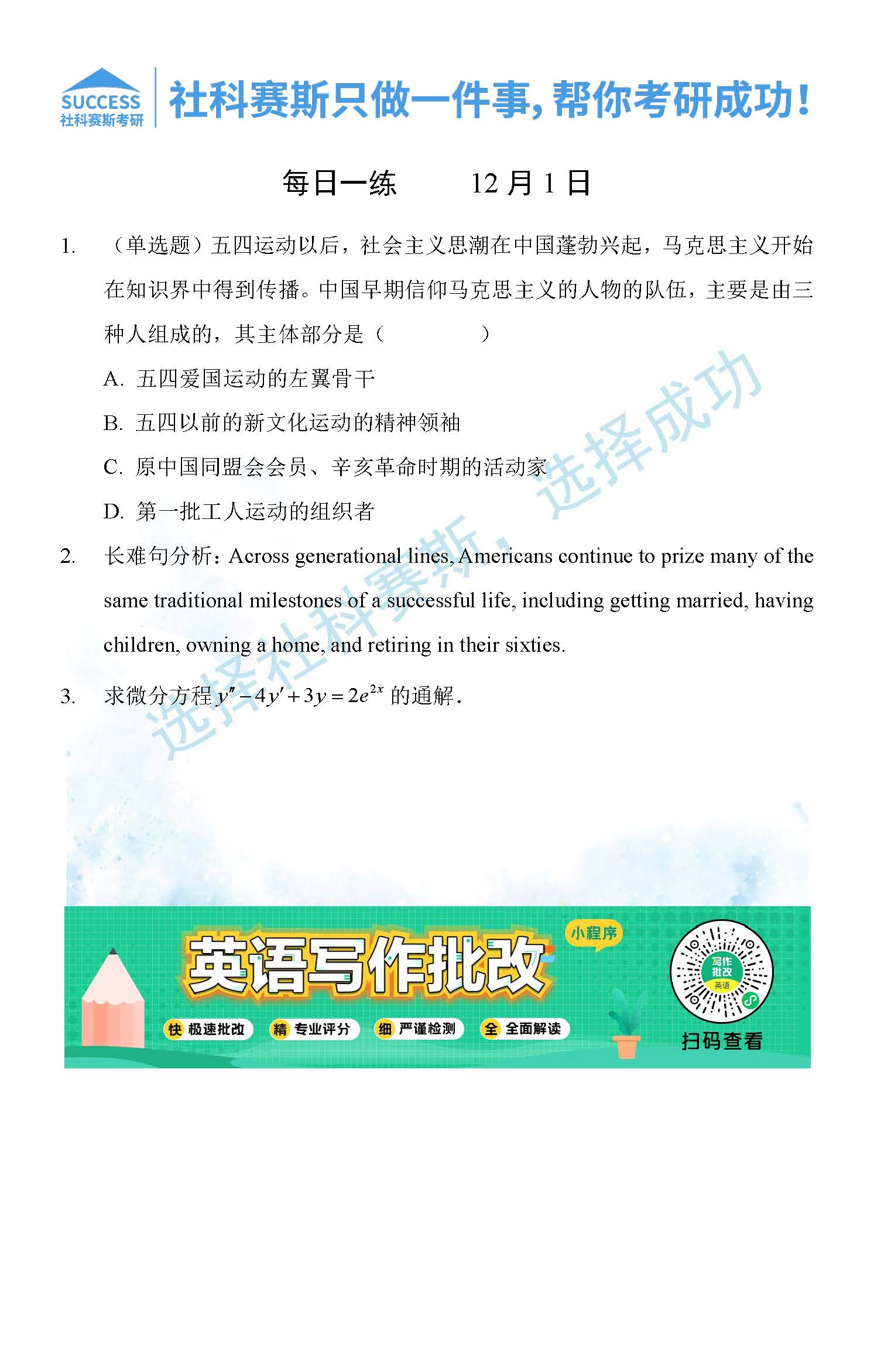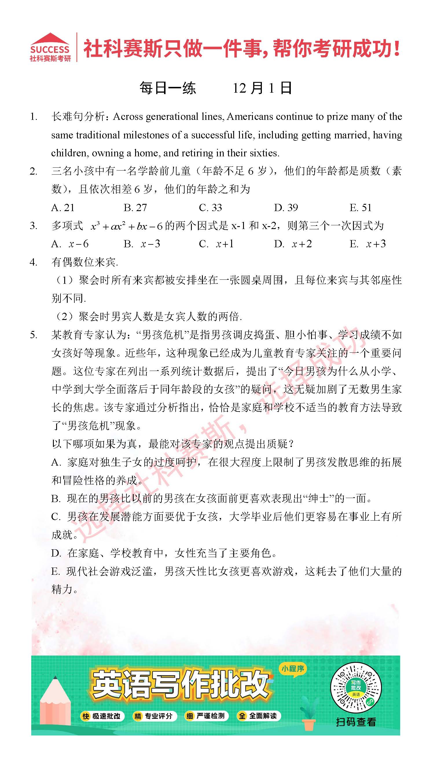 考研是一場持久戰(zhàn),保持良好的學習習慣,是能確保復習高效的關鍵。今天社科賽斯MBA備考網(wǎng)小編整理了“2021管理類聯(lián)12月1日每日一練及答案”的內(nèi)容,希望能對廣大考生有所幫助。
