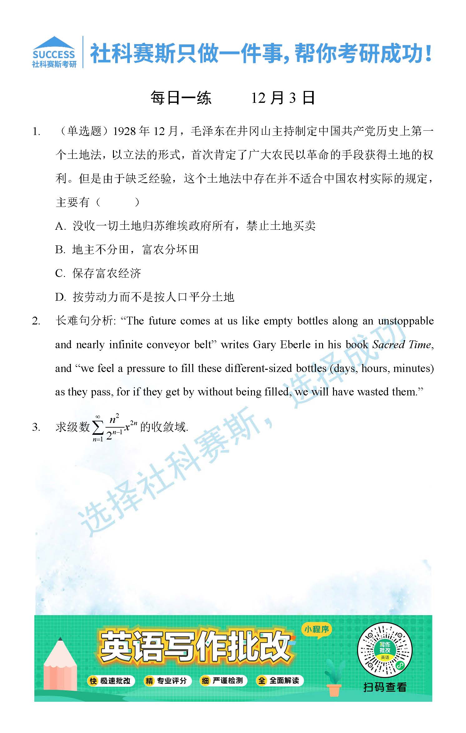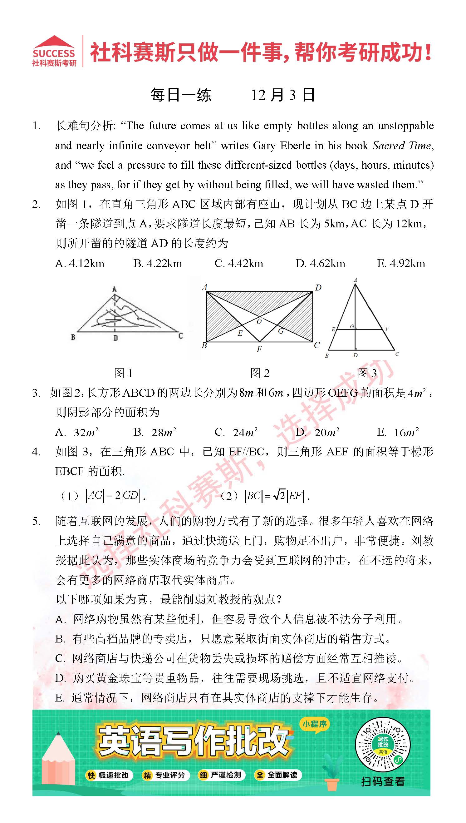 考研是一場持久戰(zhàn),保持良好的學(xué)習(xí)習(xí)慣,是能確保復(fù)習(xí)高效的關(guān)鍵。今天社科賽斯MBA備考網(wǎng)小編整理了“2021管理類聯(lián)12月3日每日一練及答案”的內(nèi)容,希望能對廣大考生有所幫助。