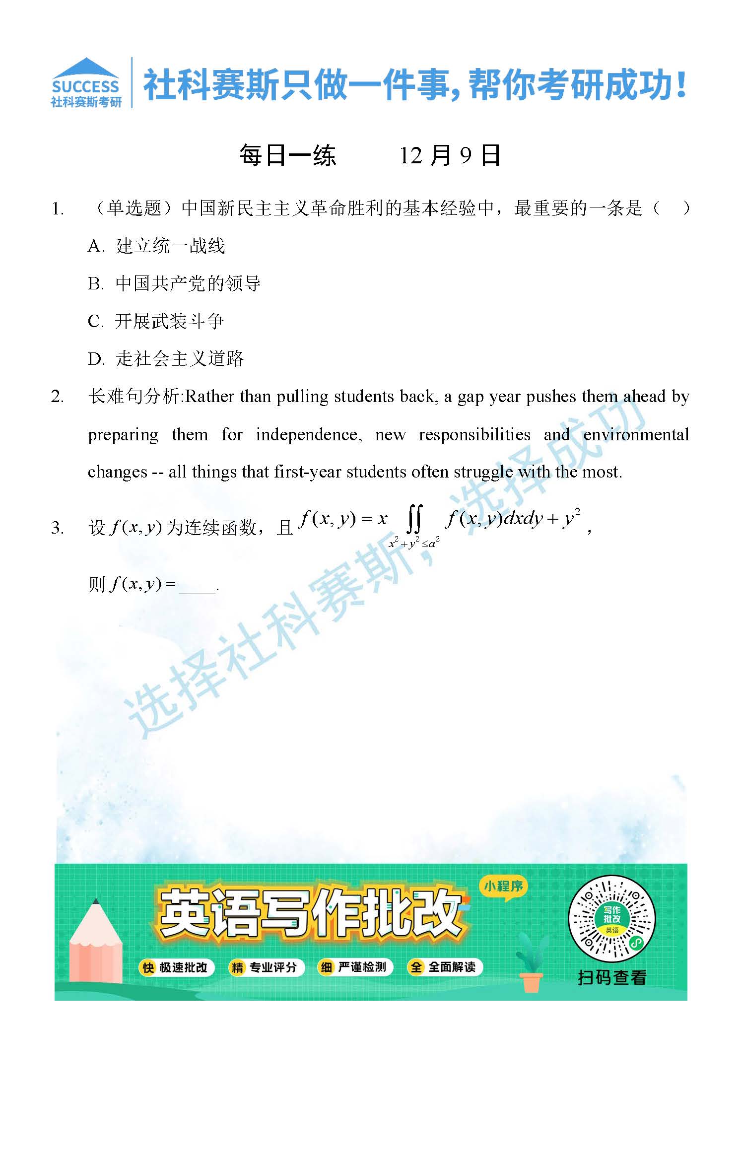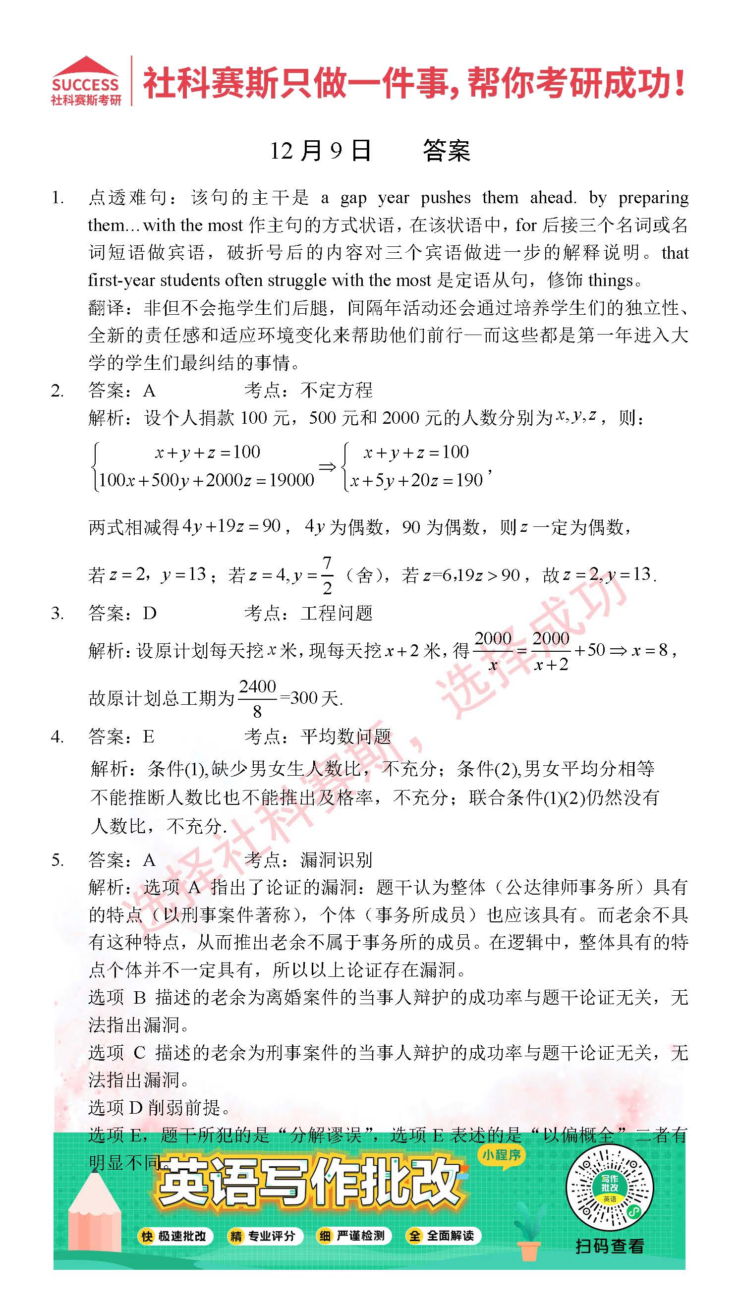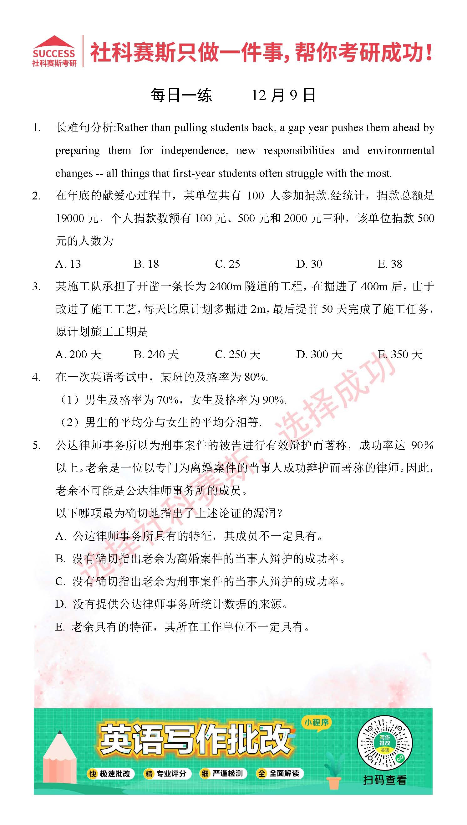 導(dǎo)讀:考研是一場持久戰(zhàn),保持良好的學(xué)習(xí)習(xí)慣,是能確保復(fù)習(xí)高效的關(guān)鍵。今天社科賽斯MBA備考網(wǎng)小編整理了“2021管理類聯(lián)12月9日每日一練及答案”的內(nèi)容,希望能對廣大考生有所幫助。