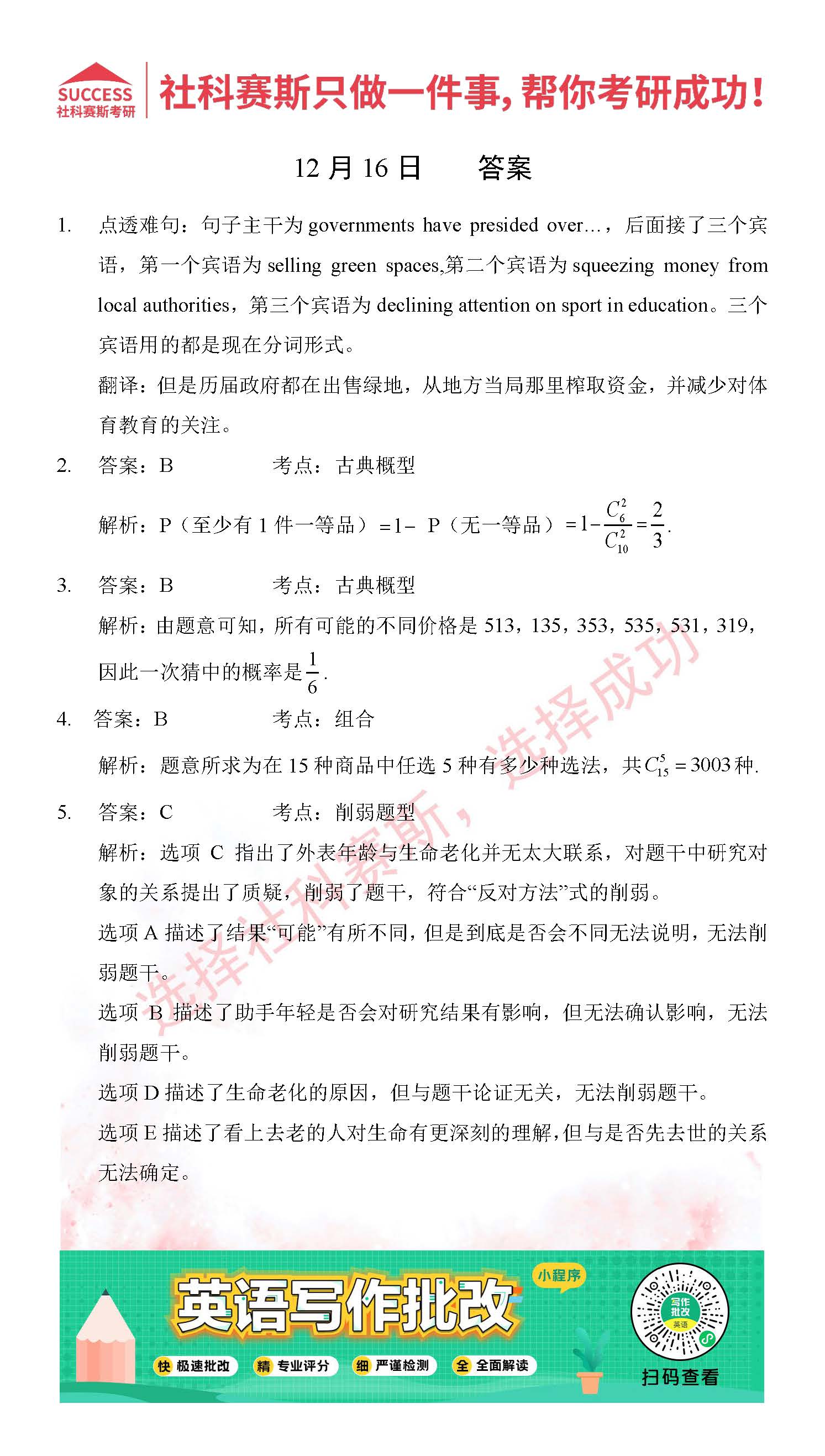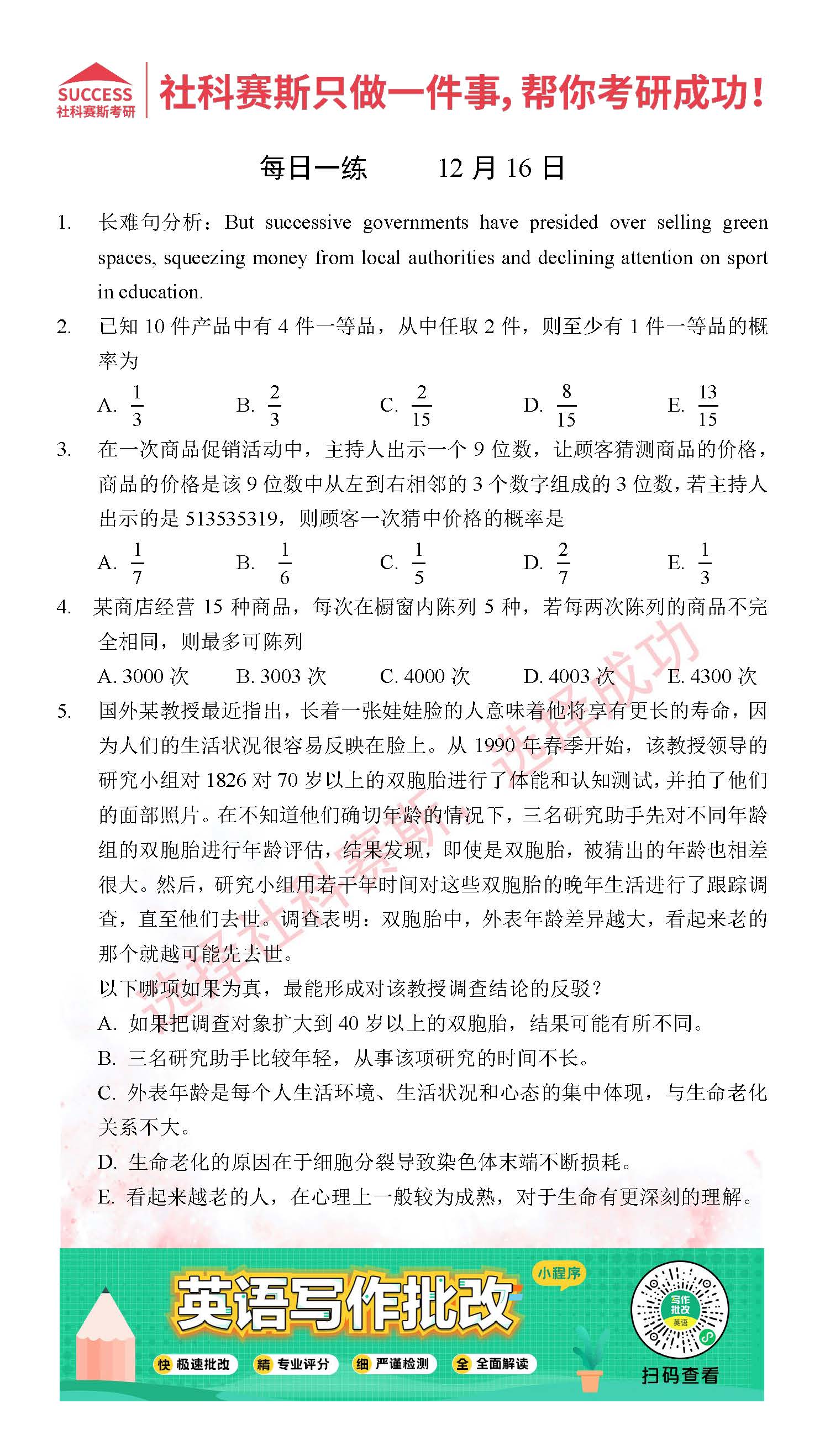 導(dǎo)讀:考研是一場(chǎng)持久戰(zhàn),保持良好的學(xué)習(xí)習(xí)慣,是能確保復(fù)習(xí)高效的關(guān)鍵。今天社科賽斯MBA備考網(wǎng)小編整理了“2021管理類聯(lián)12月16日每日一練及答案”的內(nèi)容,希望能對(duì)廣大考生有所幫助。