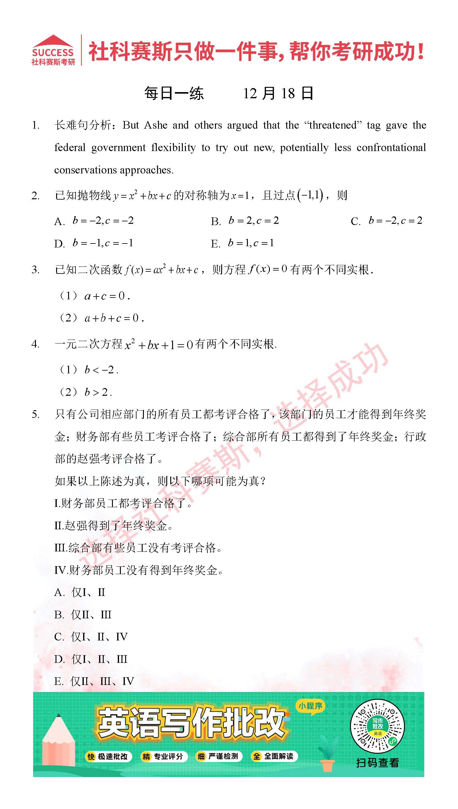 導(dǎo)讀:考研是一場持久戰(zhàn),保持良好的學(xué)習(xí)習(xí)慣,是能確保復(fù)習(xí)高效的關(guān)鍵。今天社科賽斯MBA備考網(wǎng)小編整理了“2021管理類聯(lián)12月18日每日一練及答案”的內(nèi)容,希望能對廣大考生有所幫助。