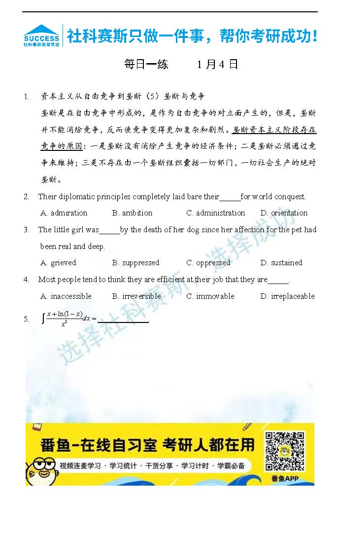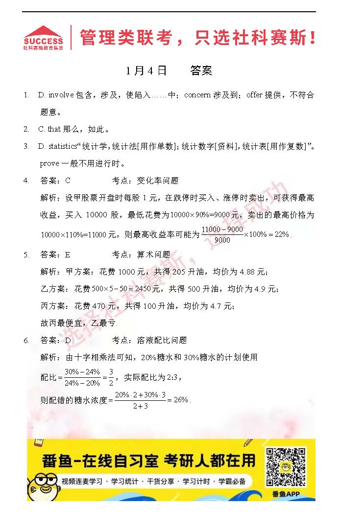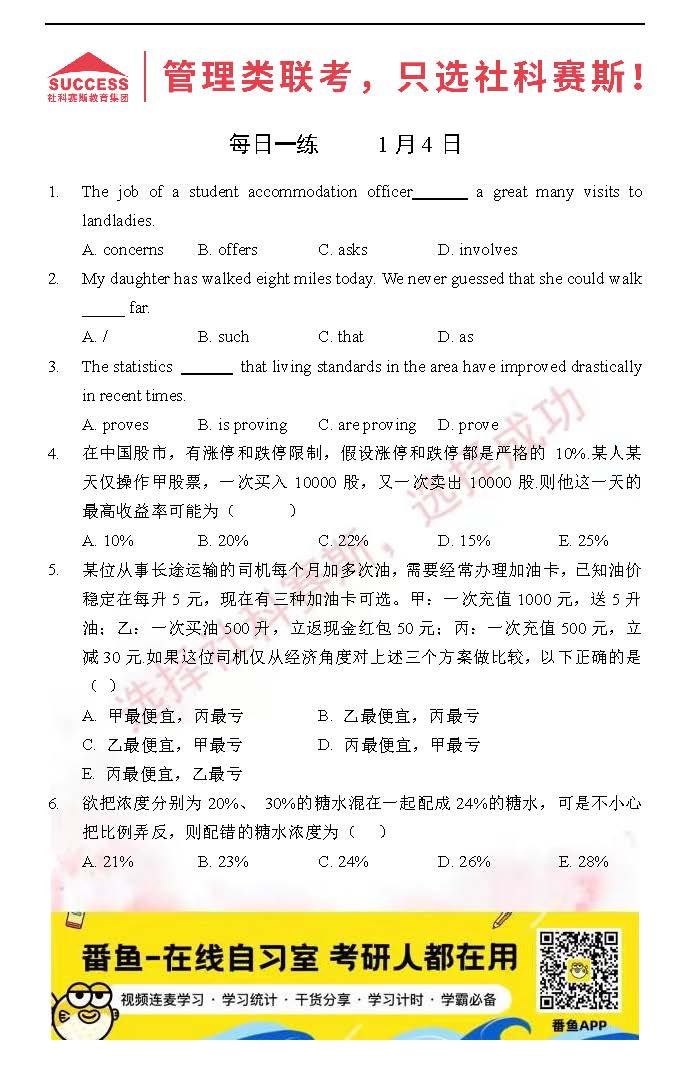 導(dǎo)讀:考研是一場(chǎng)持久戰(zhàn),保持良好的學(xué)習(xí)習(xí)慣,是能確保復(fù)習(xí)高效的關(guān)鍵。今天社科賽斯MBA備考網(wǎng)小編整理了“2022管理類(lèi)聯(lián)1月4日每日一練及答案”的內(nèi)容,希望能對(duì)廣大考生有所幫助。