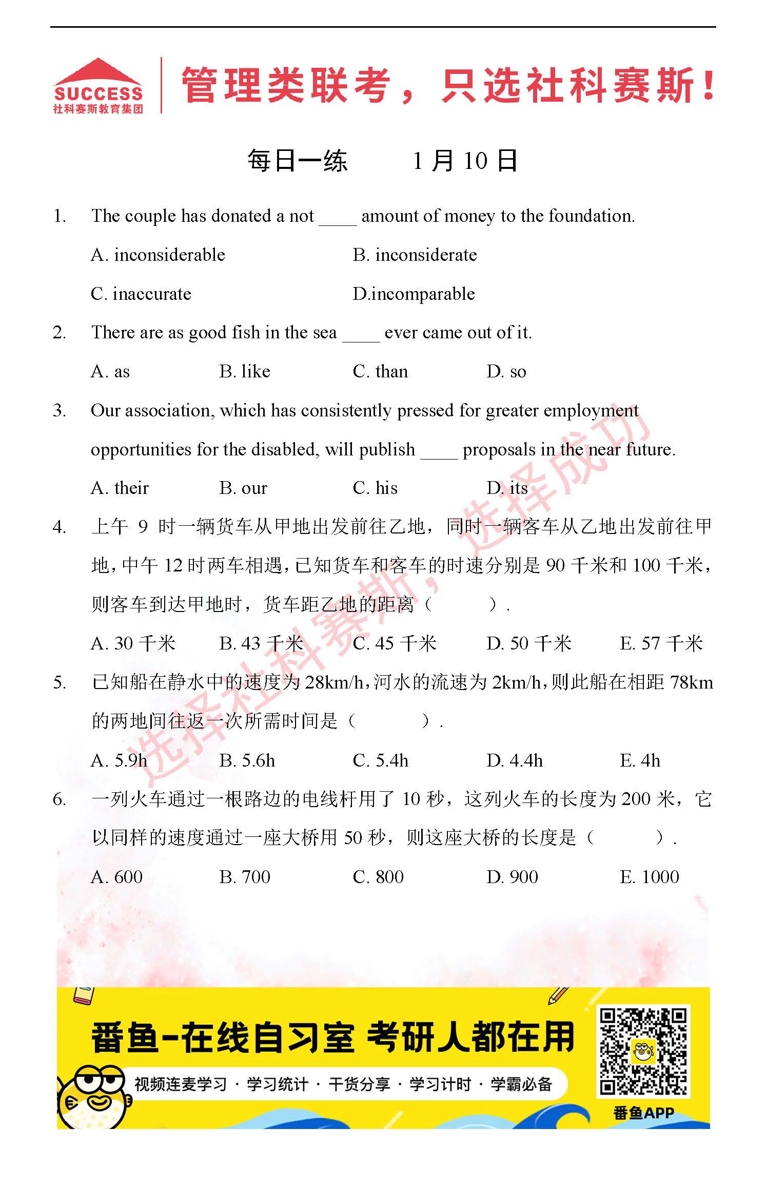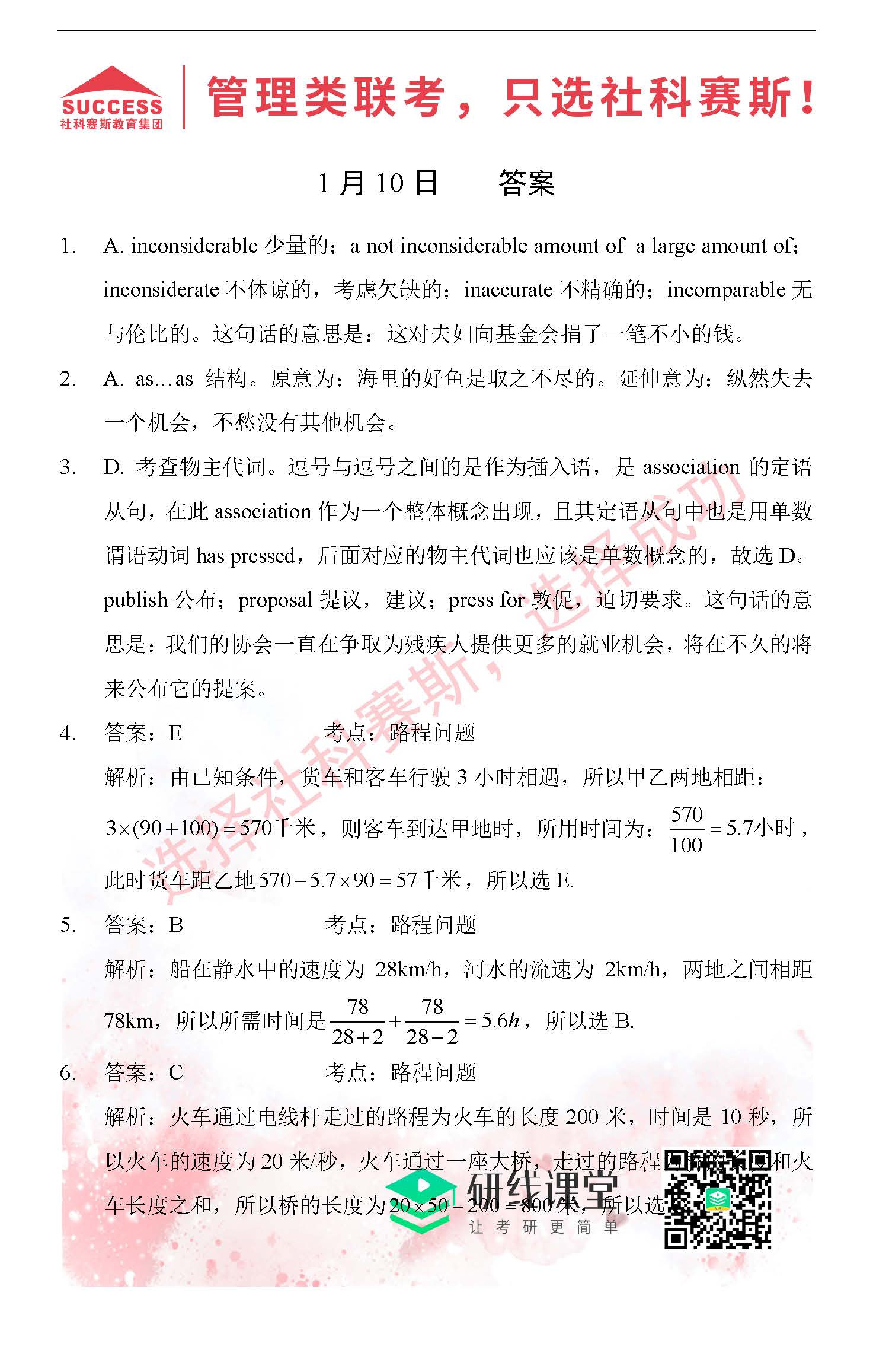導(dǎo)讀:考研是一場(chǎng)持久戰(zhàn),保持良好的學(xué)習(xí)習(xí)慣,是能確保復(fù)習(xí)高效的關(guān)鍵。今天社科賽斯MBA備考網(wǎng)小編整理了“2022管理類(lèi)聯(lián)1月10日每日一練及答案”的內(nèi)容,希望能對(duì)廣大考生有所幫助。