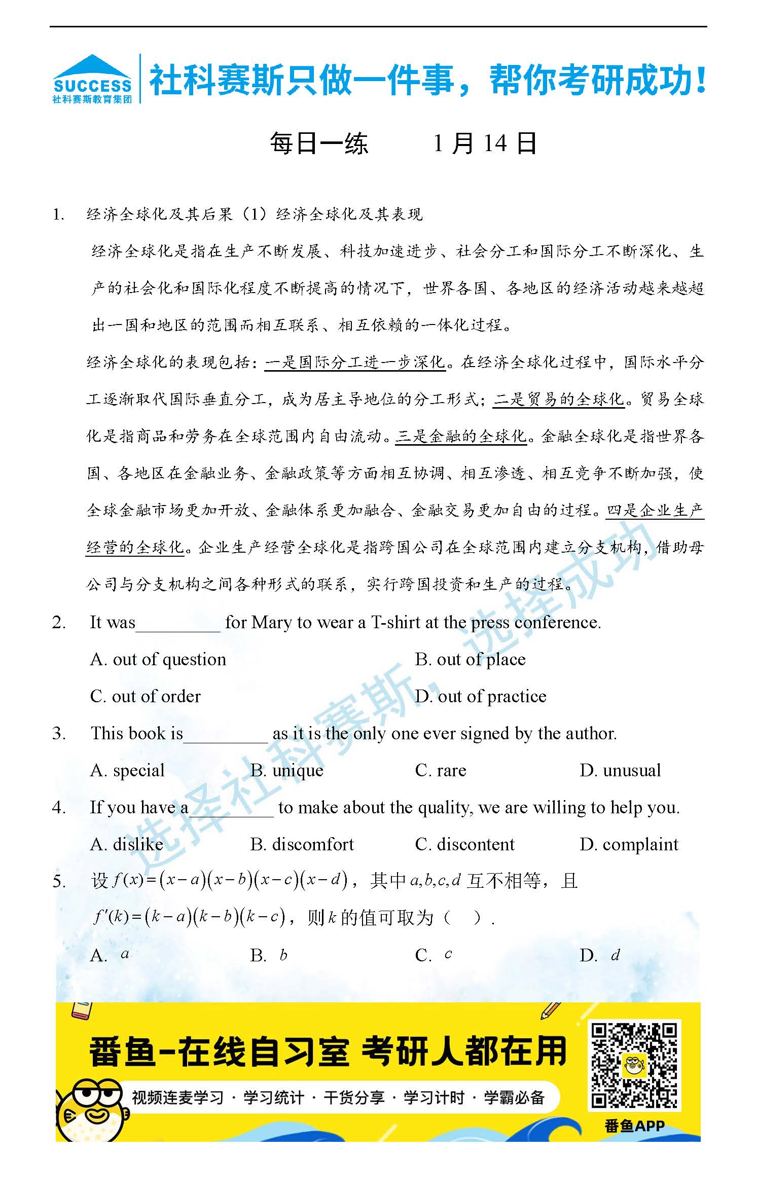 導(dǎo)讀:考研是一場(chǎng)持久戰(zhàn),保持良好的學(xué)習(xí)習(xí)慣,是能確保復(fù)習(xí)高效的關(guān)鍵。今天社科賽斯MBA備考網(wǎng)小編整理了“2022管理類聯(lián)1月14日每日一練及答案”的內(nèi)容,希望能對(duì)廣大考生有所幫助。