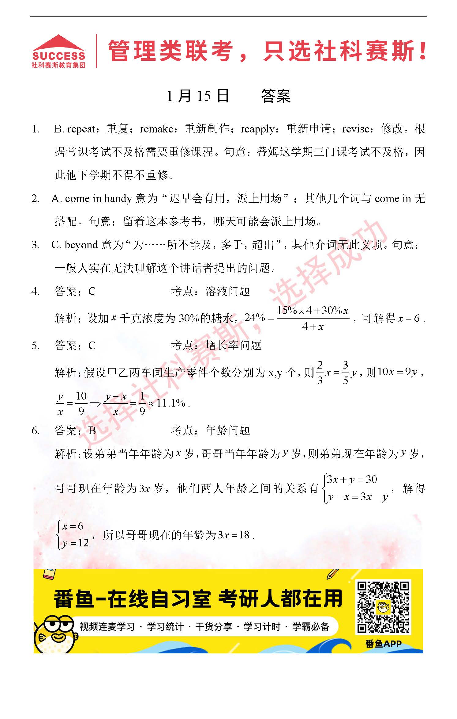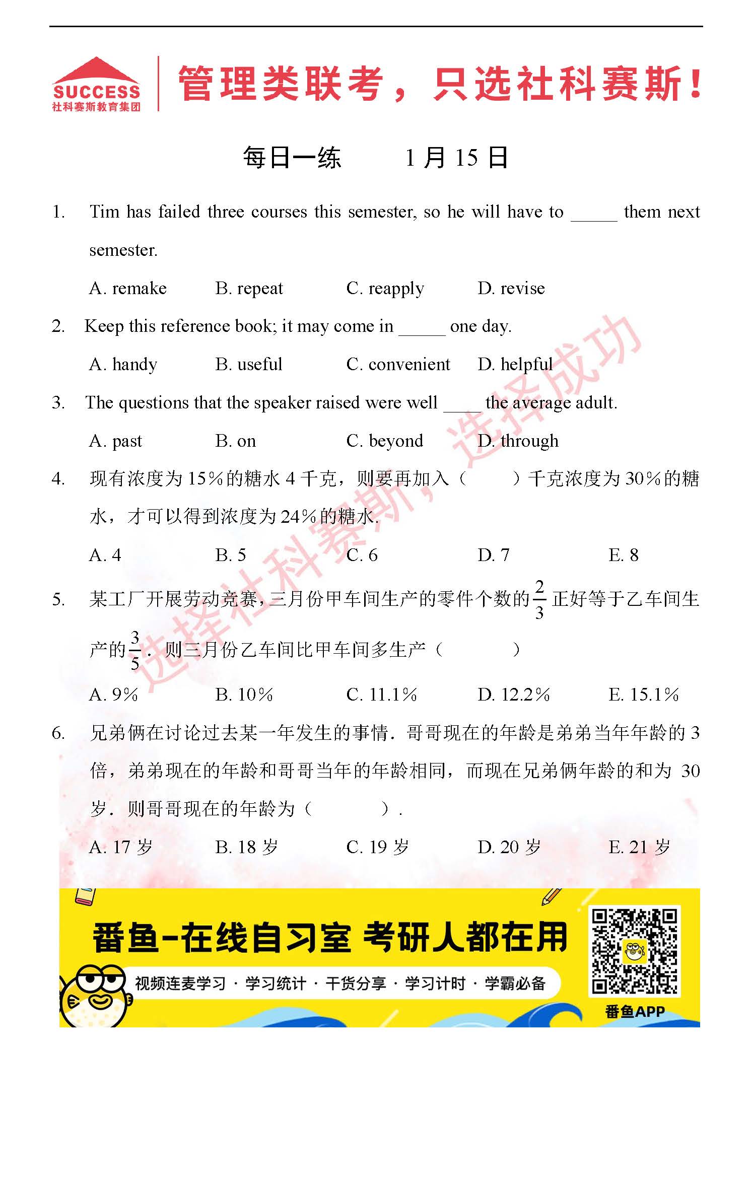 導(dǎo)讀:考研是一場(chǎng)持久戰(zhàn),保持良好的學(xué)習(xí)習(xí)慣,是能確保復(fù)習(xí)高效的關(guān)鍵。今天社科賽斯MBA備考網(wǎng)小編整理了“2022管理類聯(lián)1月15日每日一練及答案”的內(nèi)容,希望能對(duì)廣大考生有所幫助。