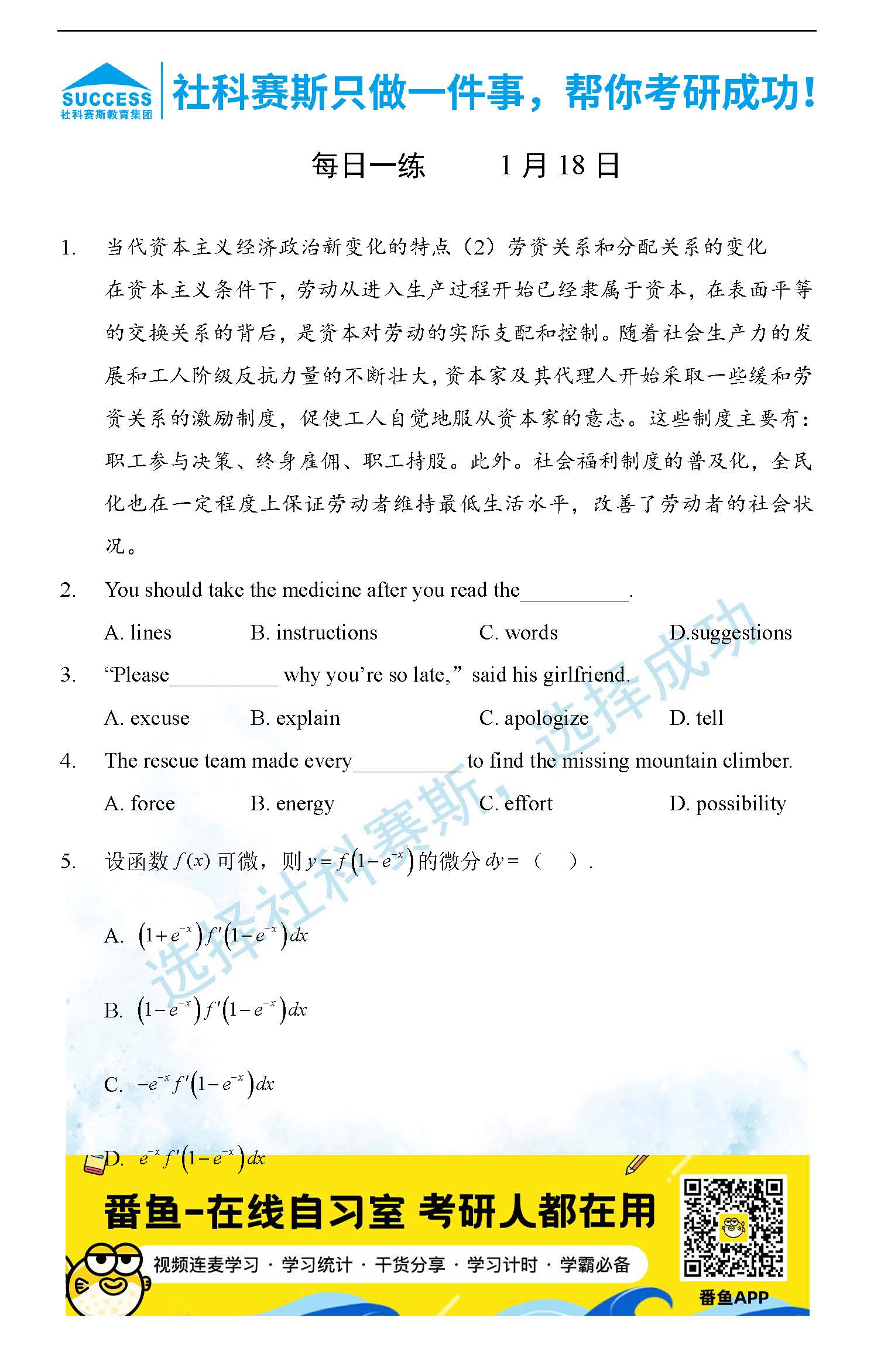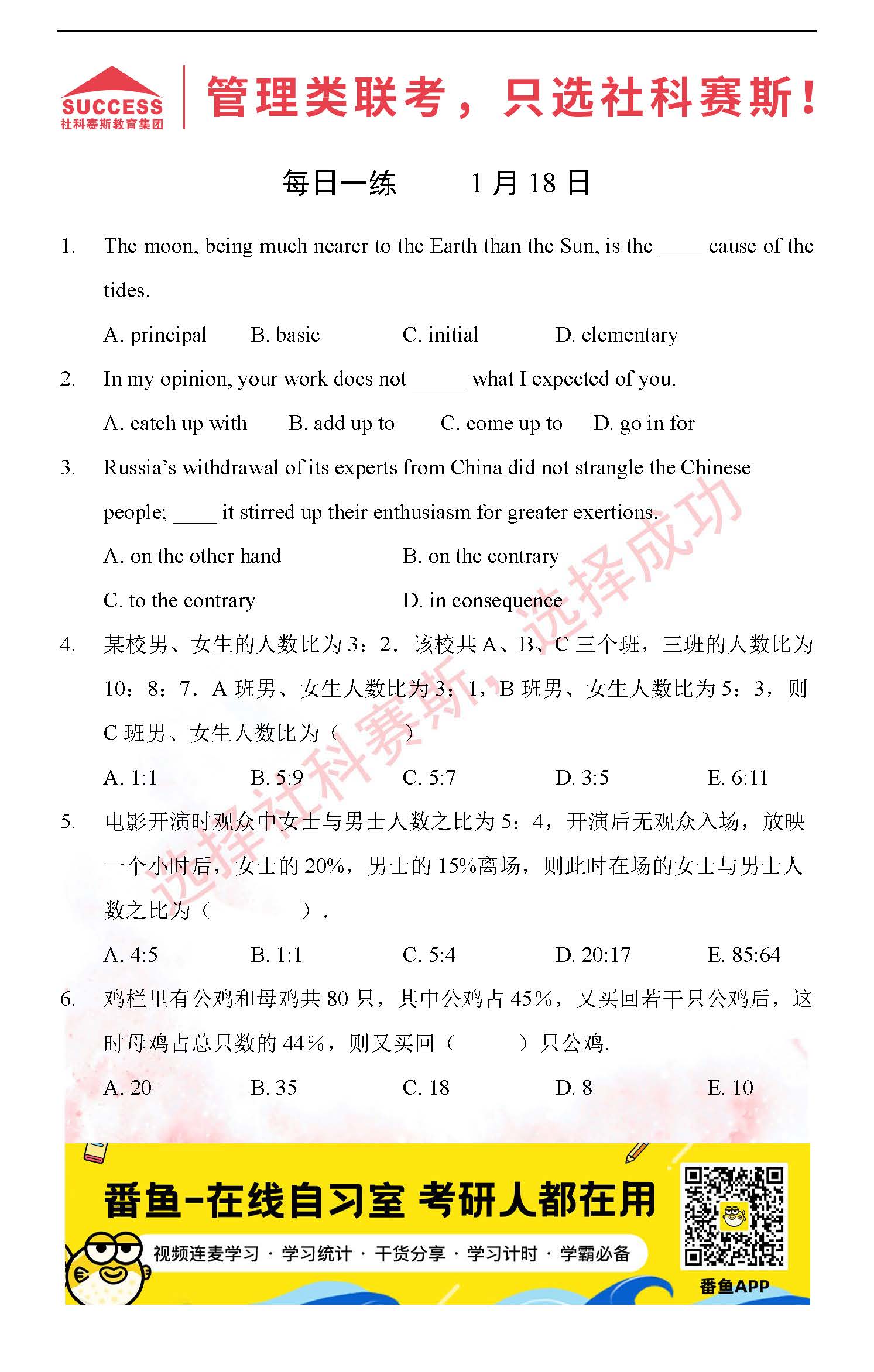 導(dǎo)讀:考研是一場(chǎng)持久戰(zhàn),保持良好的學(xué)習(xí)習(xí)慣,是能確保復(fù)習(xí)高效的關(guān)鍵。今天社科賽斯MBA備考網(wǎng)小編整理了“2022管理類聯(lián)1月18日每日一練及答案”的內(nèi)容,希望能對(duì)廣大考生有所幫助。
