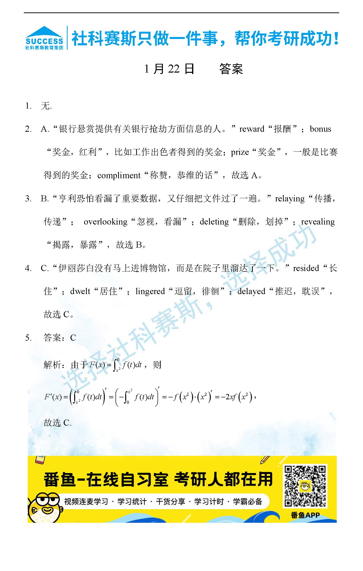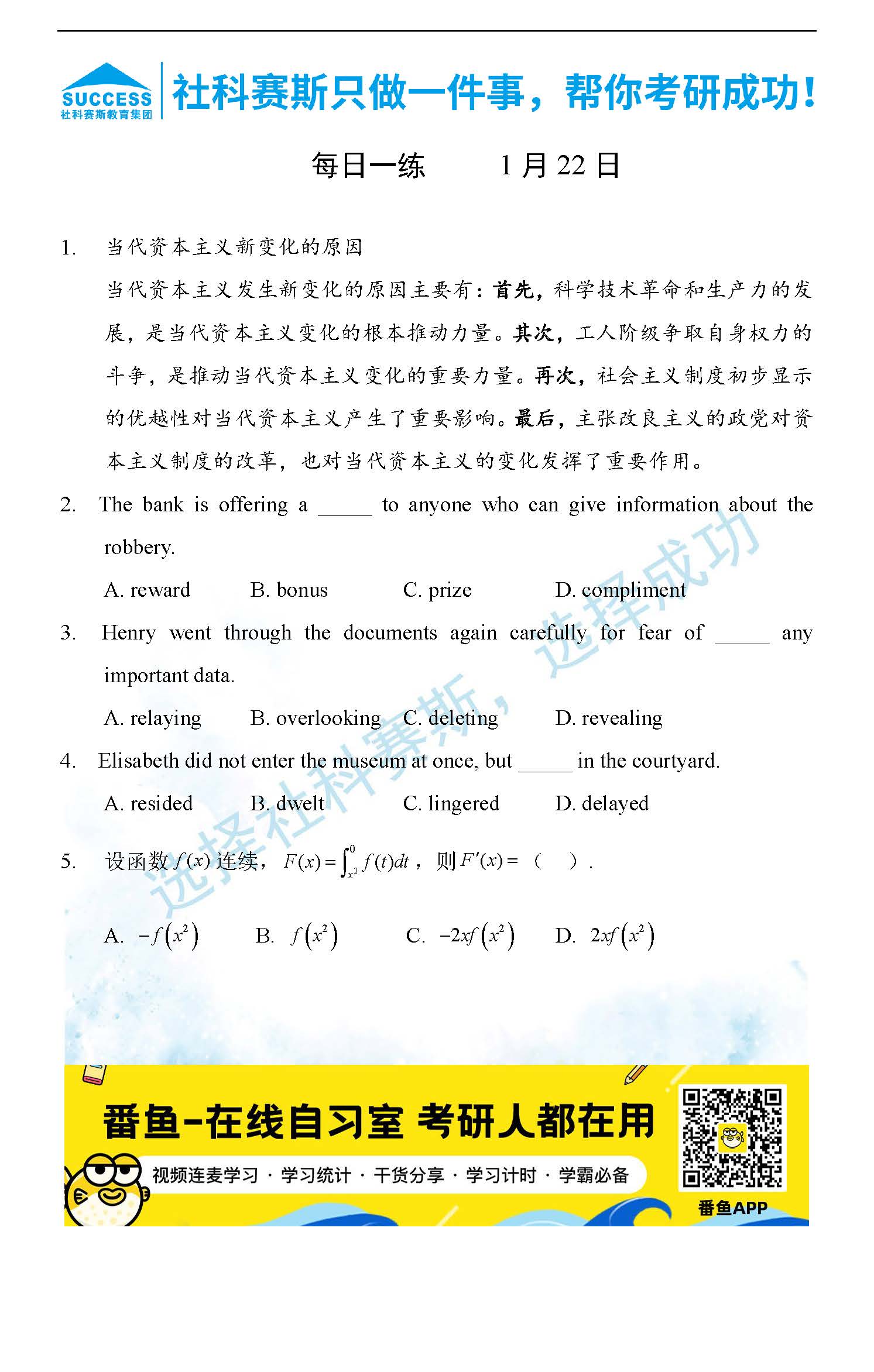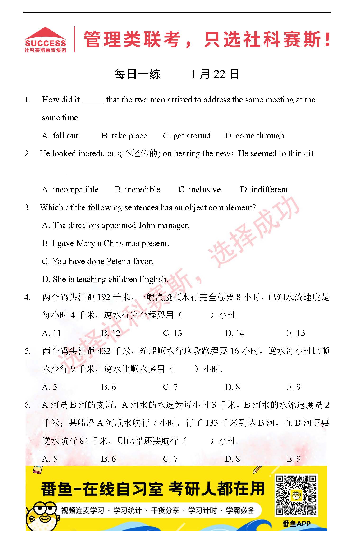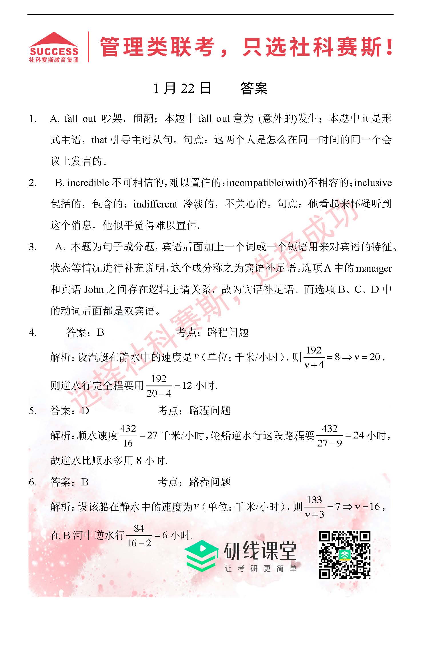 導(dǎo)讀:考研是一場(chǎng)持久戰(zhàn),保持良好的學(xué)習(xí)習(xí)慣,是能確保復(fù)習(xí)高效的關(guān)鍵。今天社科賽斯MBA備考網(wǎng)小編整理了“2022管理類聯(lián)1月22日每日一練及答案”的內(nèi)容,希望能對(duì)廣大考生有所幫助。