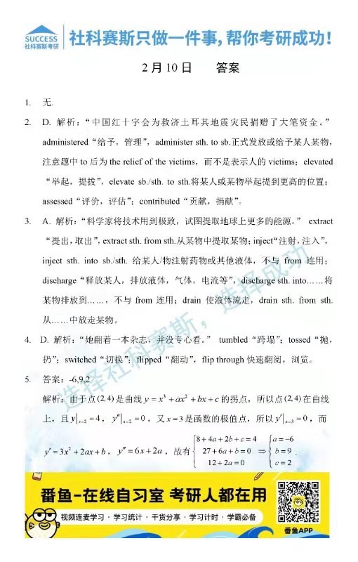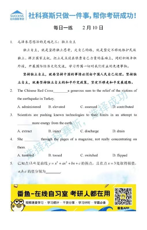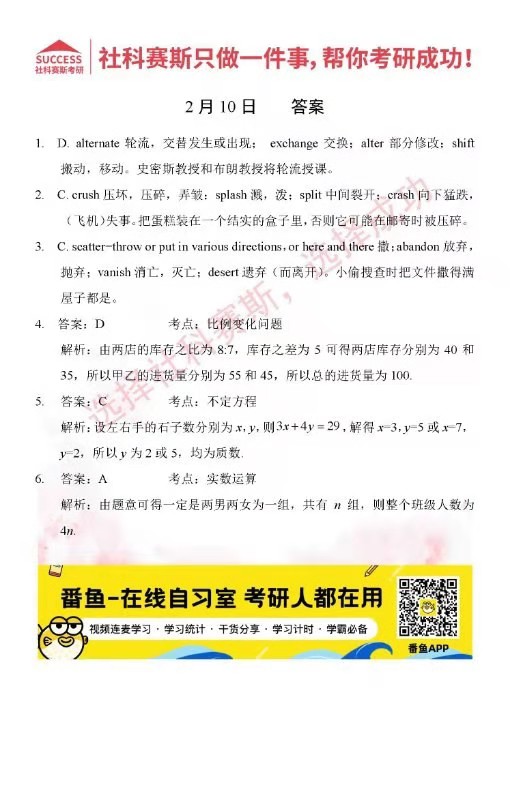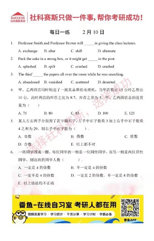 導(dǎo)讀:考研是一場(chǎng)持久戰(zhàn),保持良好的學(xué)習(xí)習(xí)慣,是能確保復(fù)習(xí)高效的關(guān)鍵。今天社科賽斯MBA備考網(wǎng)小編整理了“2022管理類聯(lián)2月10日每日一練及答案”的內(nèi)容,希望能對(duì)廣大考生有所幫助。