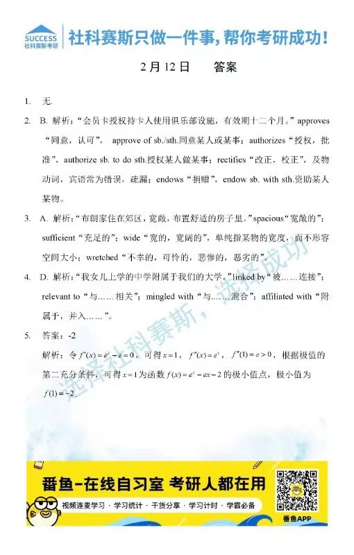 導(dǎo)讀:考研是一場持久戰(zhàn),保持良好的學(xué)習(xí)習(xí)慣,是能確保復(fù)習(xí)高效的關(guān)鍵。今天社科賽斯MBA備考網(wǎng)小編整理了“2022管理類聯(lián)2月12日每日一練及答案”的內(nèi)容,希望能對廣大考生有所幫助。
