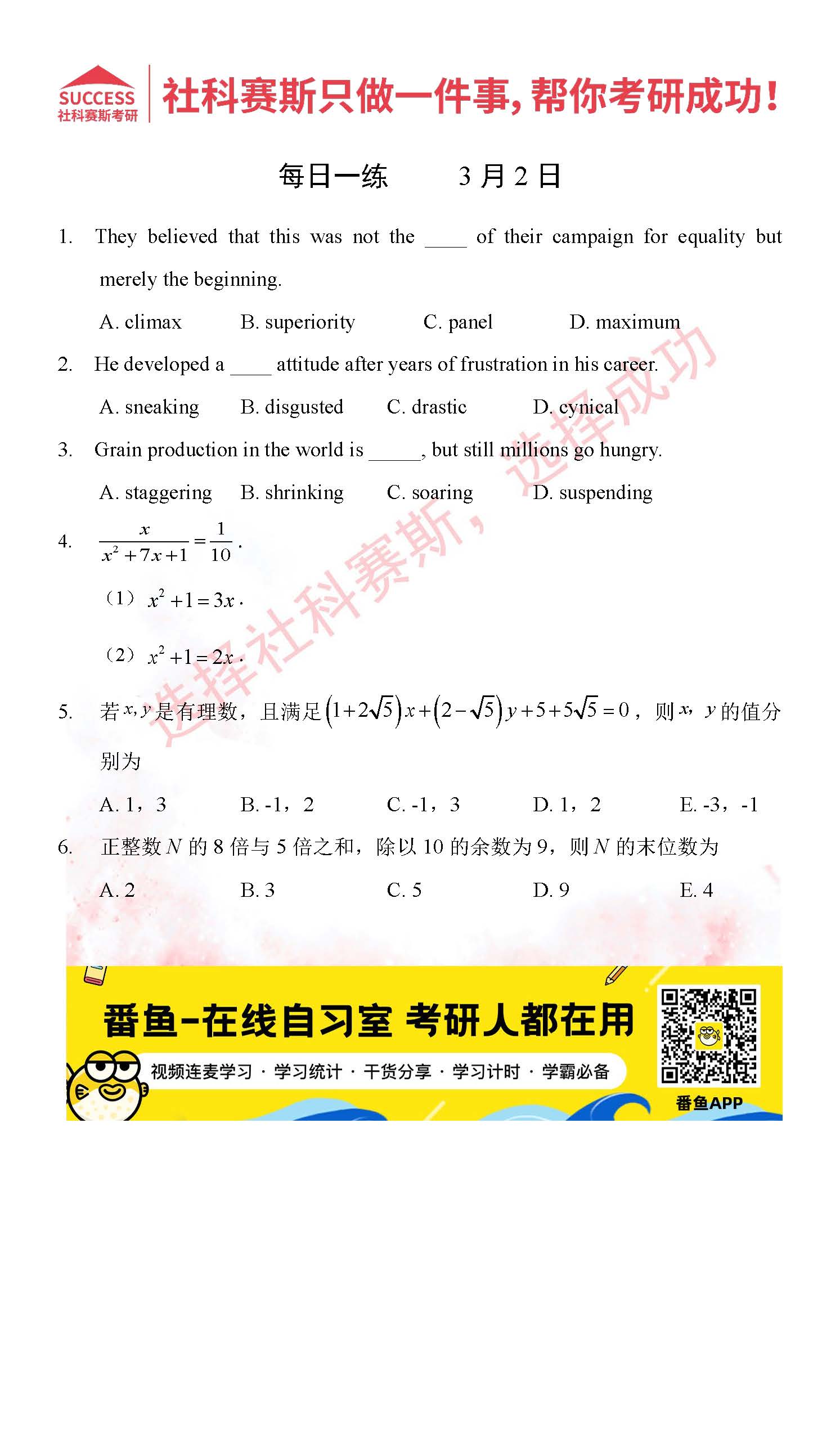 導(dǎo)讀:考研是一場(chǎng)持久戰(zhàn),保持良好的學(xué)習(xí)習(xí)慣,是能確保復(fù)習(xí)高效的關(guān)鍵。今天社科賽斯MBA備考網(wǎng)小編整理了“2022管理類聯(lián)3月2日每日一練及答案”的內(nèi)容,希望能對(duì)廣大考生有所幫助。