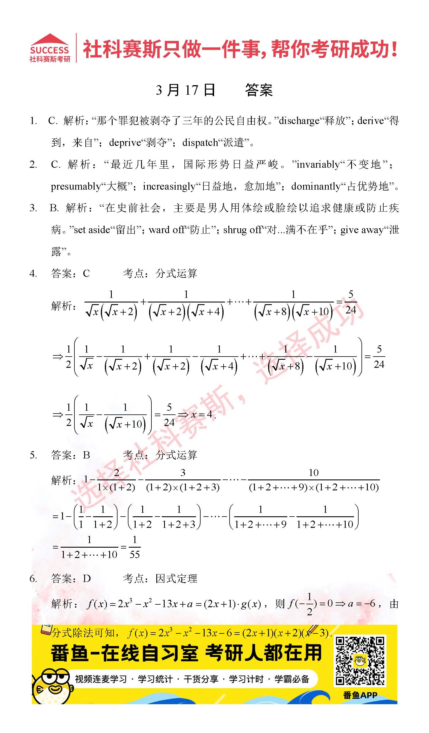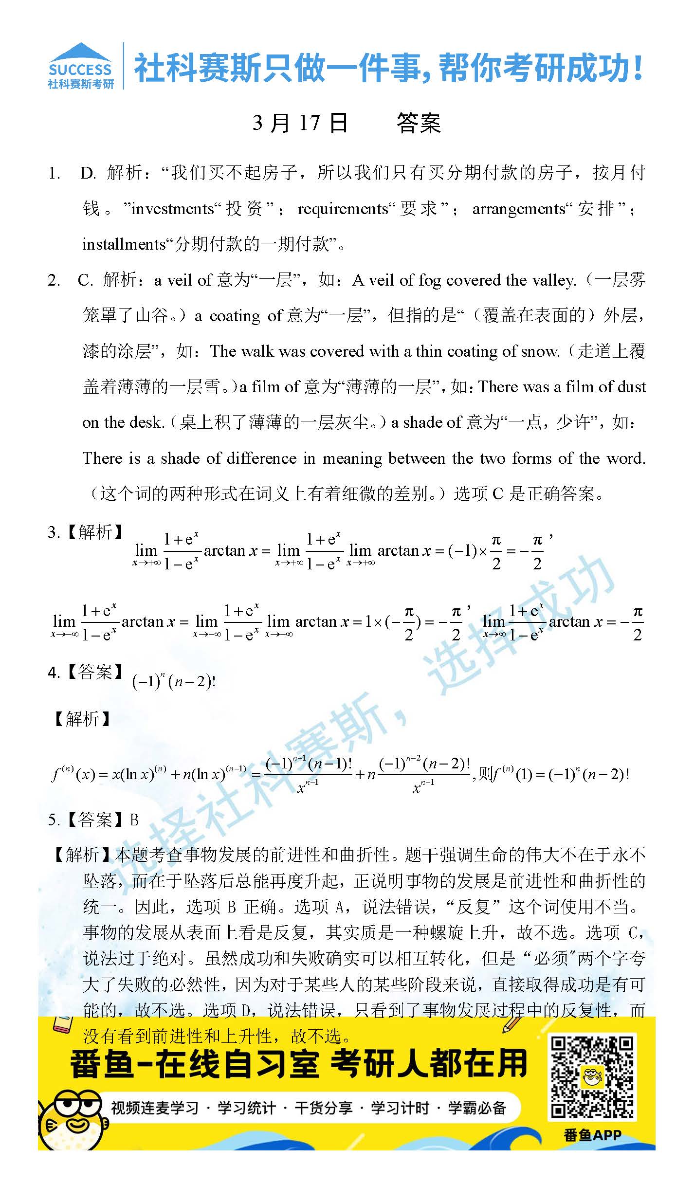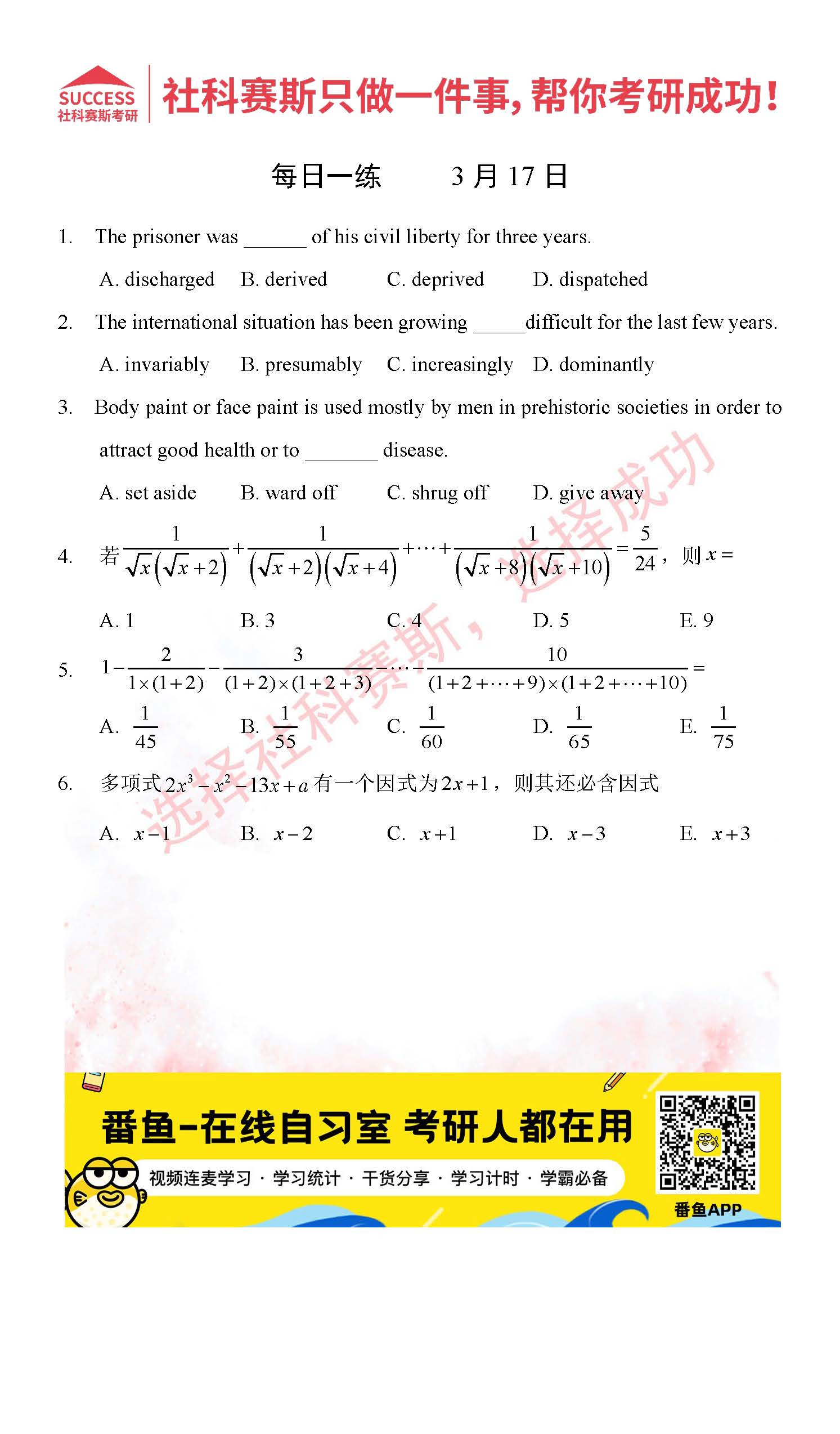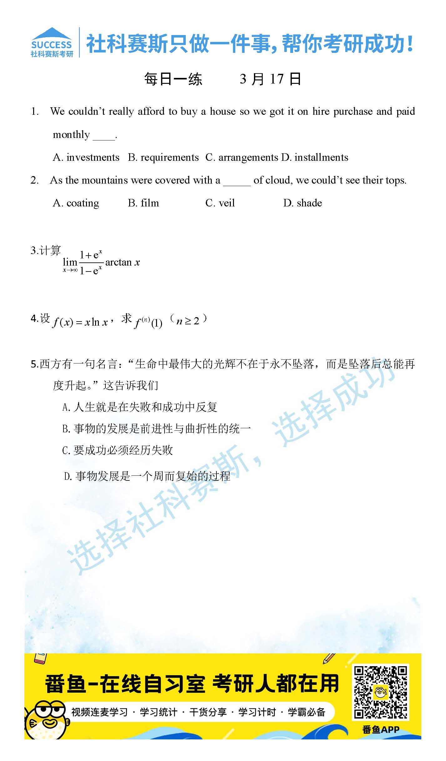導(dǎo)讀:考研是一場持久戰(zhàn),保持良好的學(xué)習(xí)習(xí)慣,是能確保復(fù)習(xí)高效的關(guān)鍵。今天社科賽斯MBA備考網(wǎng)小編整理了“2022管理類聯(lián)3月17日每日一練及答案”的內(nèi)容,希望能對廣大考生有所幫助。