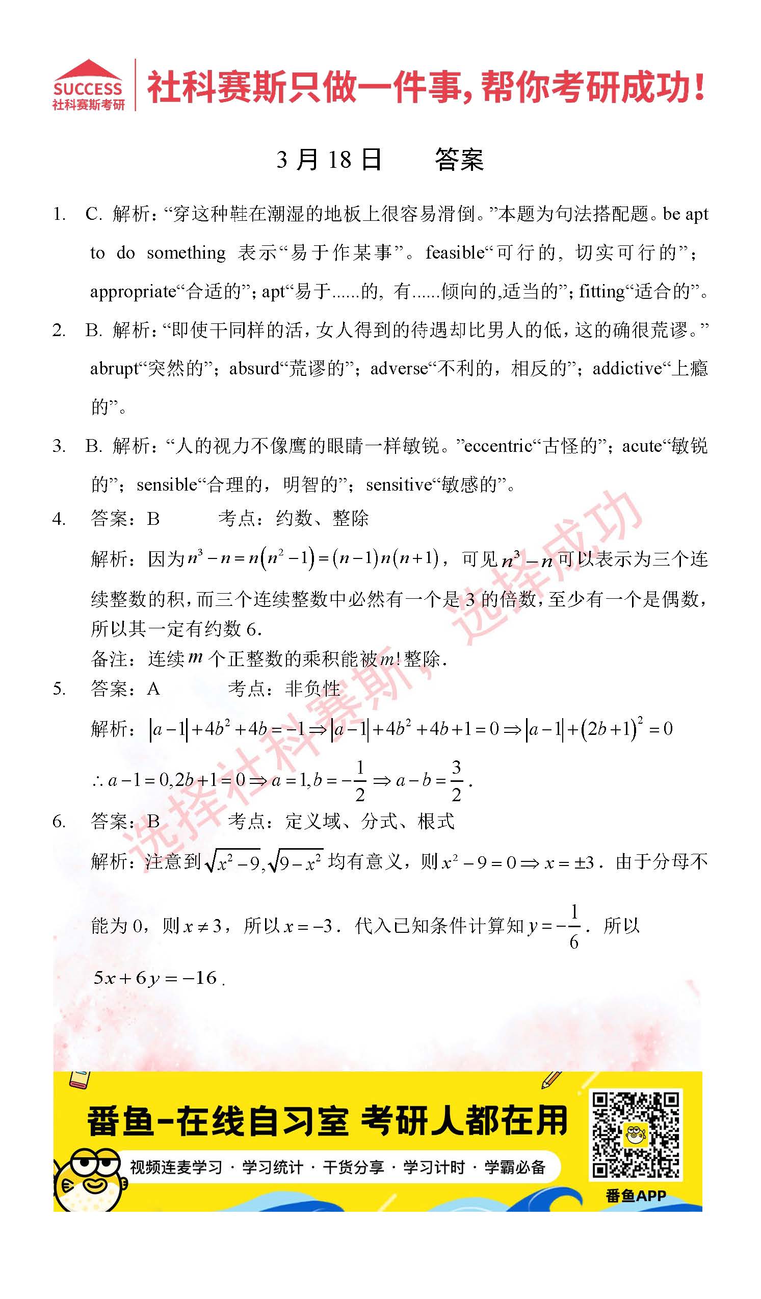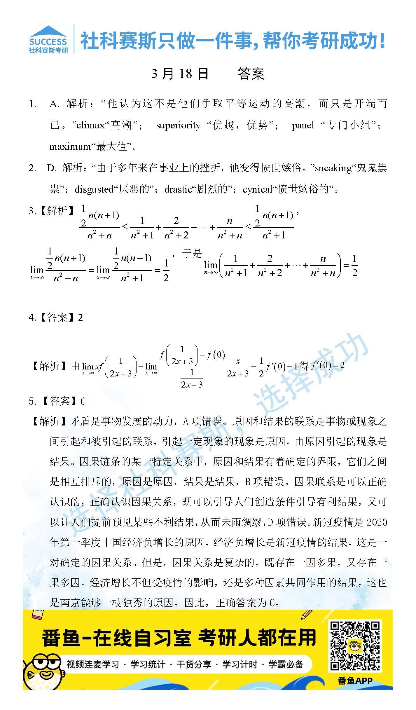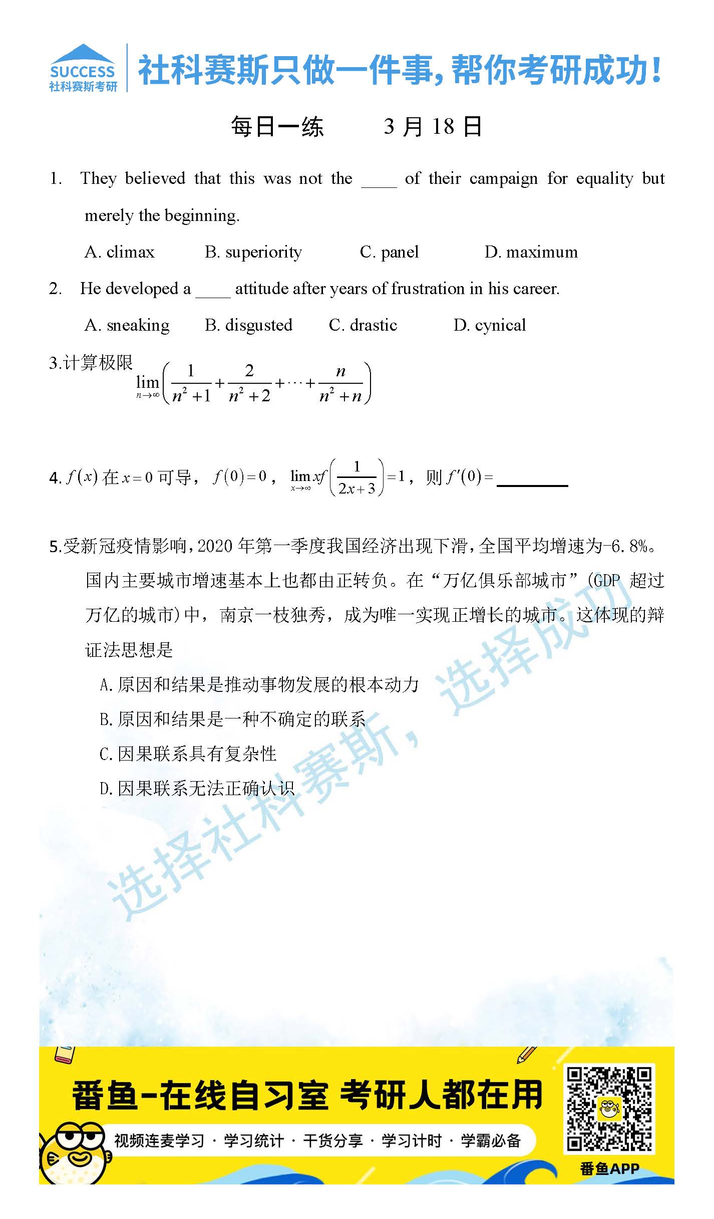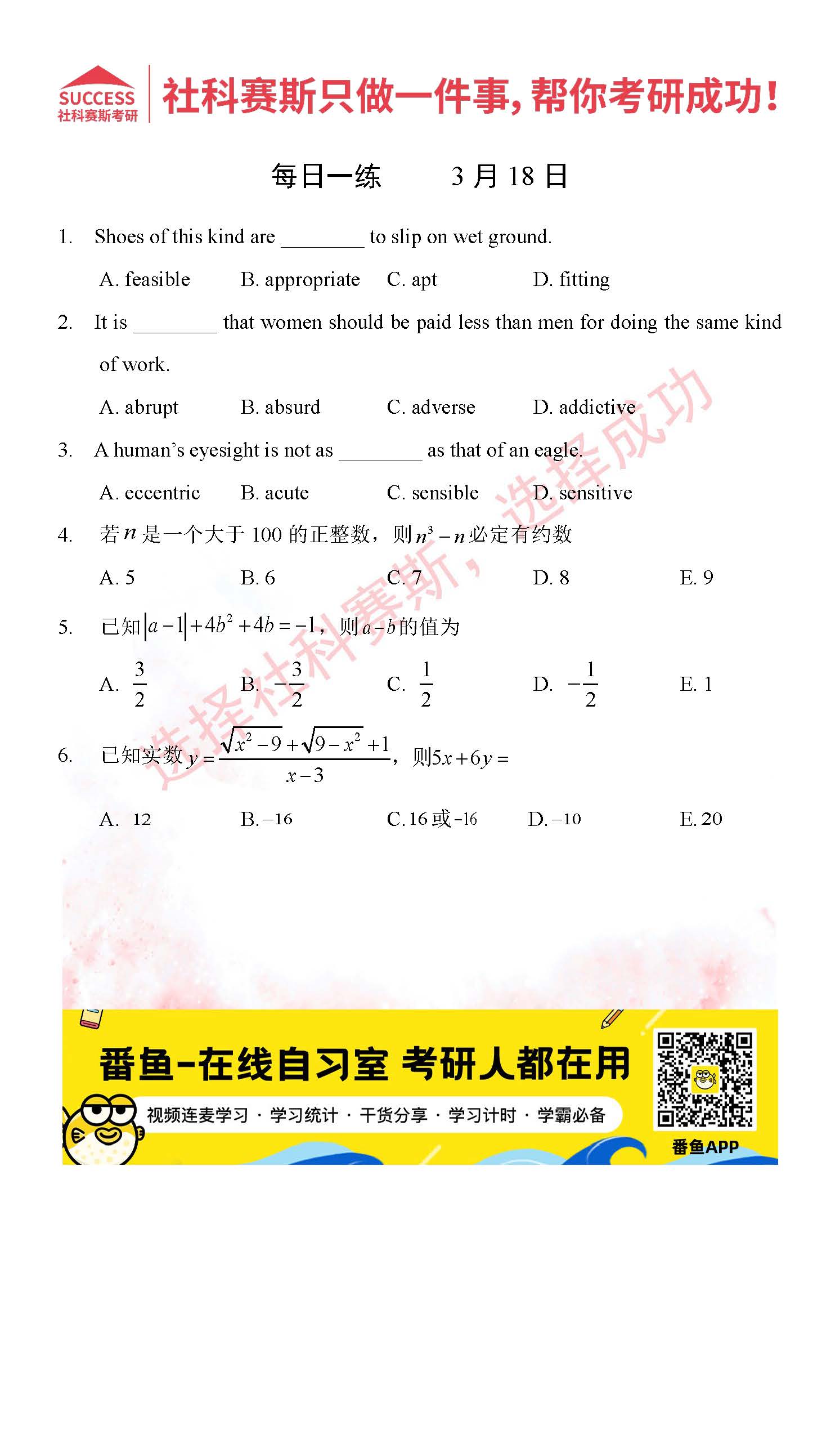 導(dǎo)讀:考研是一場(chǎng)持久戰(zhàn),保持良好的學(xué)習(xí)習(xí)慣,是能確保復(fù)習(xí)高效的關(guān)鍵。今天社科賽斯MBA備考網(wǎng)小編整理了“2022管理類聯(lián)3月18日每日一練及答案”的內(nèi)容,希望能對(duì)廣大考生有所幫助。