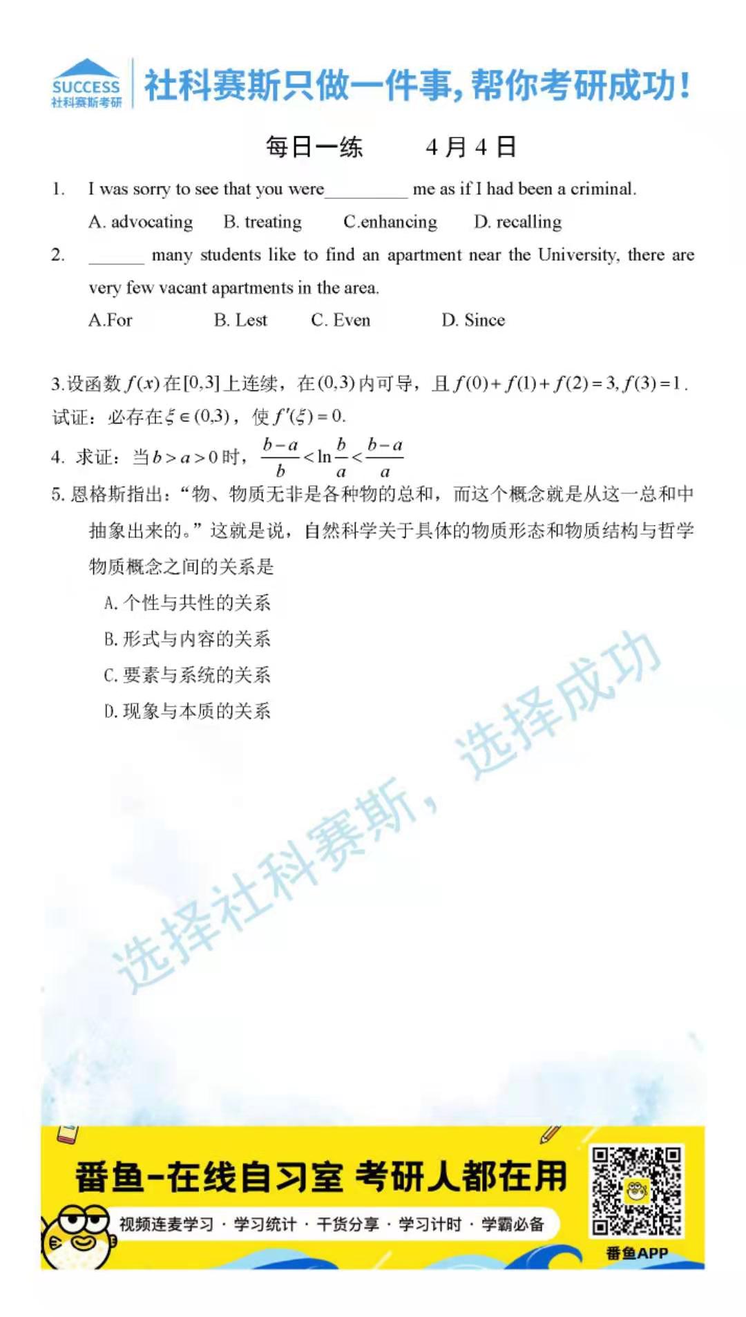 導(dǎo)讀:考研是一場持久戰(zhàn),保持良好的學(xué)習(xí)習(xí)慣,是能確保復(fù)習(xí)高效的關(guān)鍵。今天社科賽斯MBA備考網(wǎng)小編整理了“2022管理類聯(lián)考4月4日每日一練及答案”的內(nèi)容,希望能對廣大考生有所幫助。