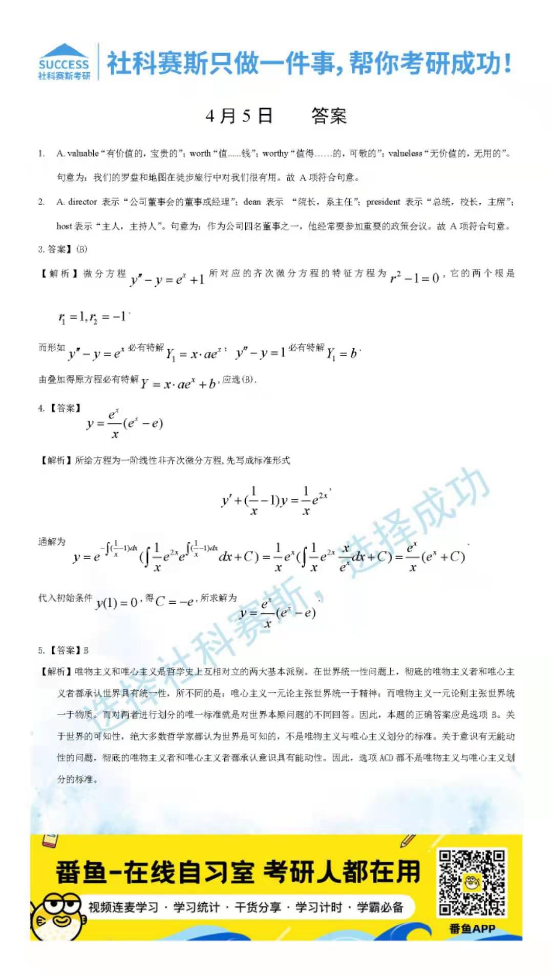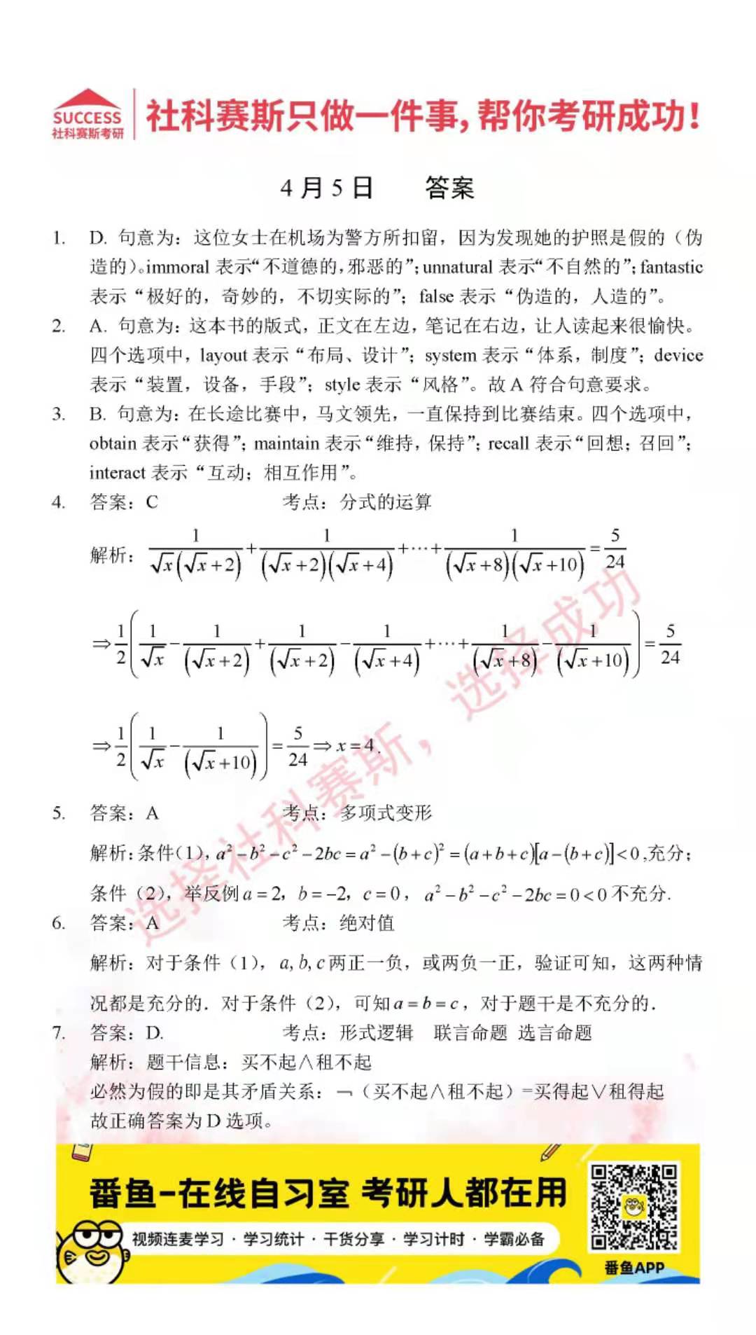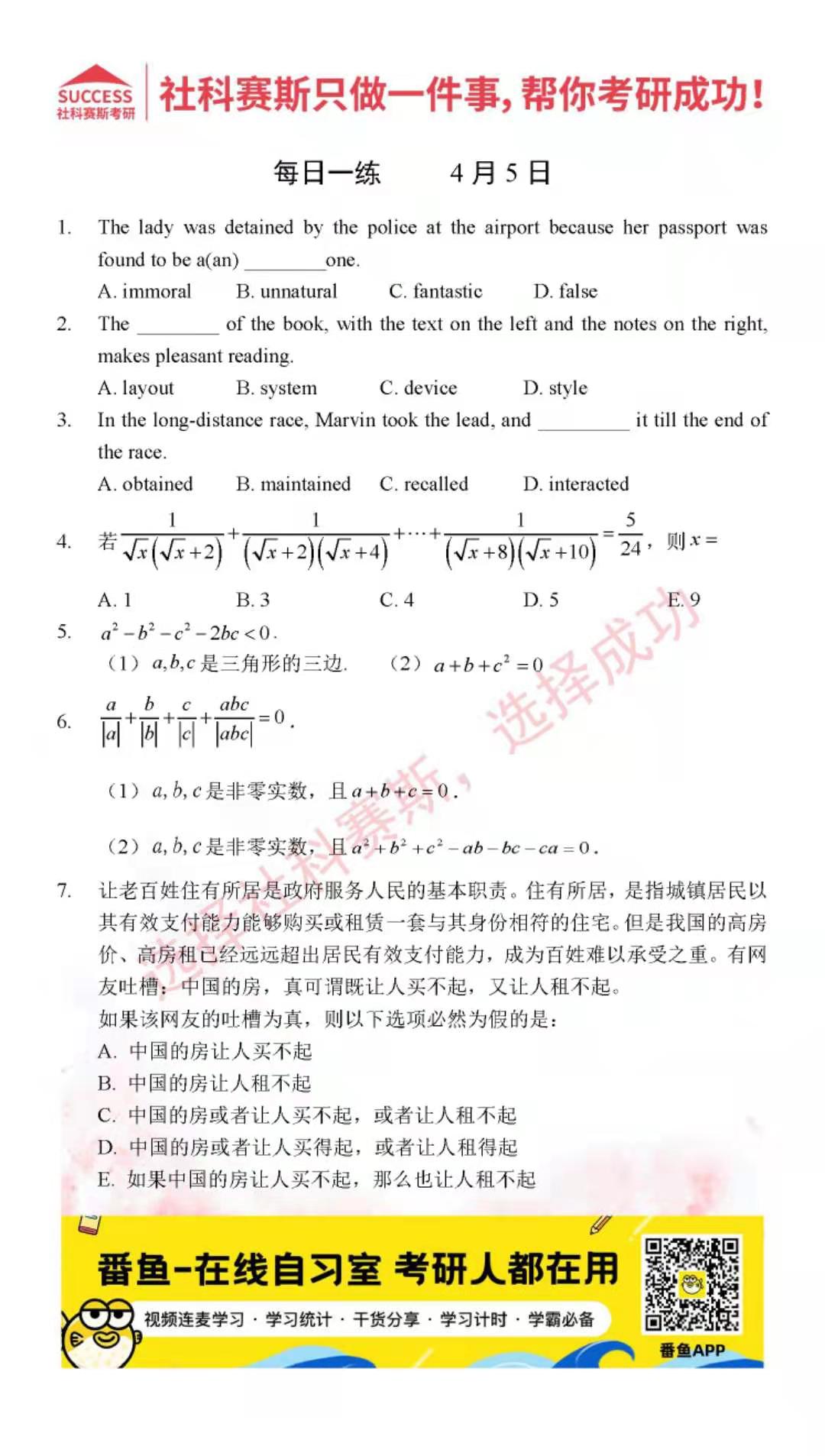 導(dǎo)讀:考研是一場(chǎng)持久戰(zhàn),保持良好的學(xué)習(xí)習(xí)慣,是能確保復(fù)習(xí)高效的關(guān)鍵。今天社科賽斯MBA備考網(wǎng)小編整理了“2022管理類聯(lián)考4月5日每日一練及答案”的內(nèi)容,希望能對(duì)廣大考生有所幫助。